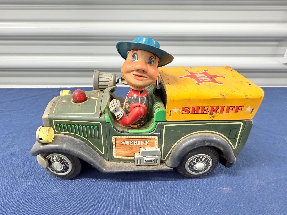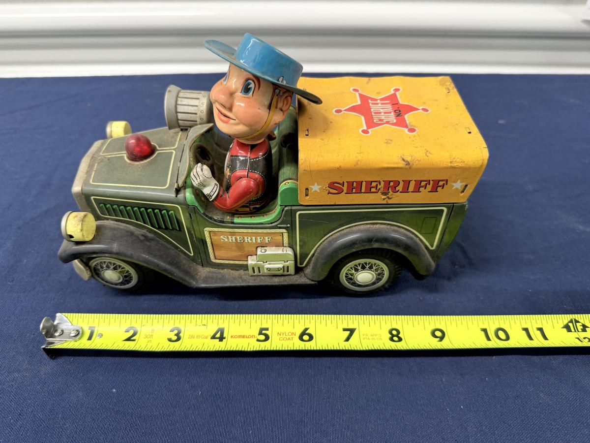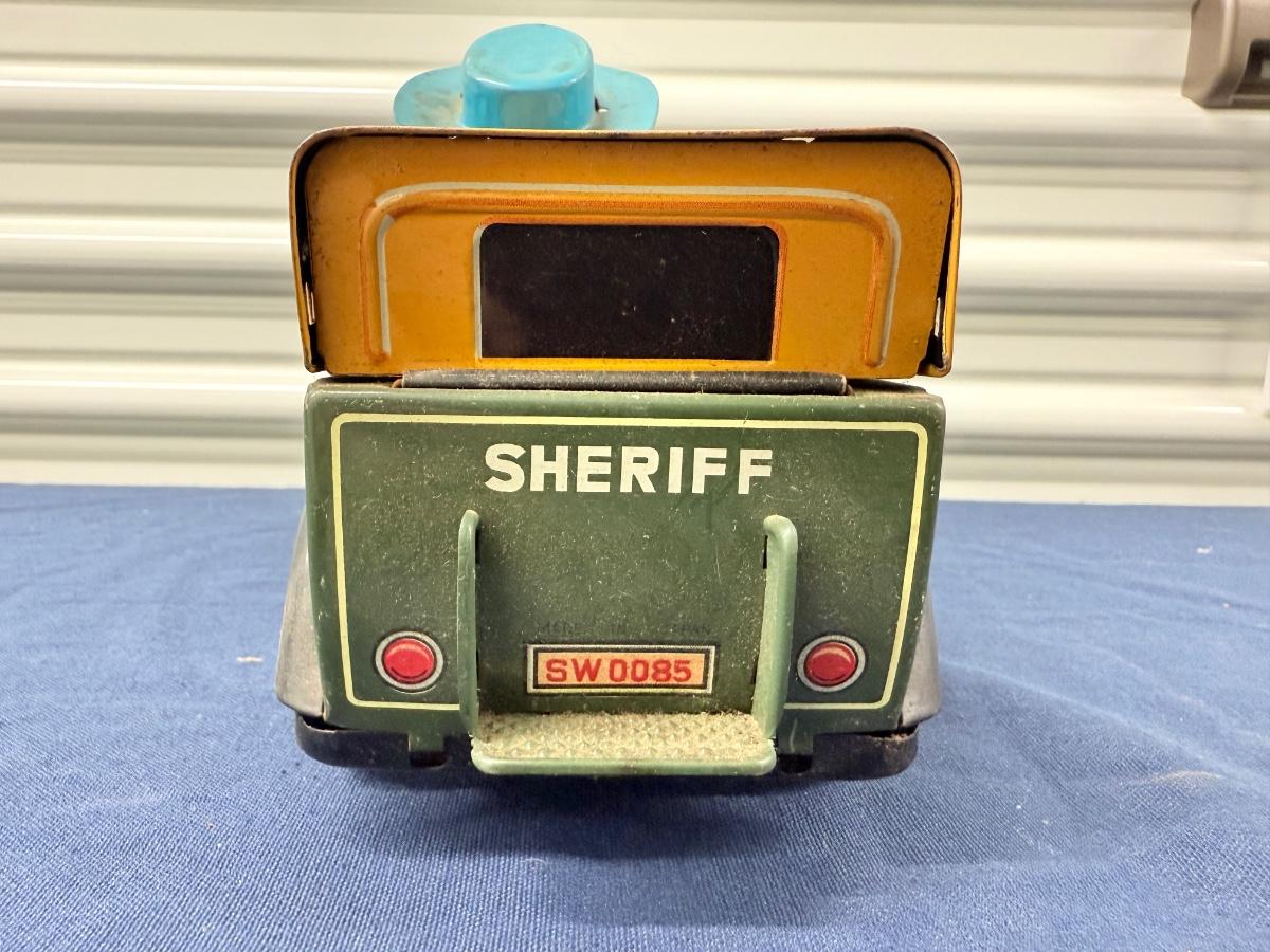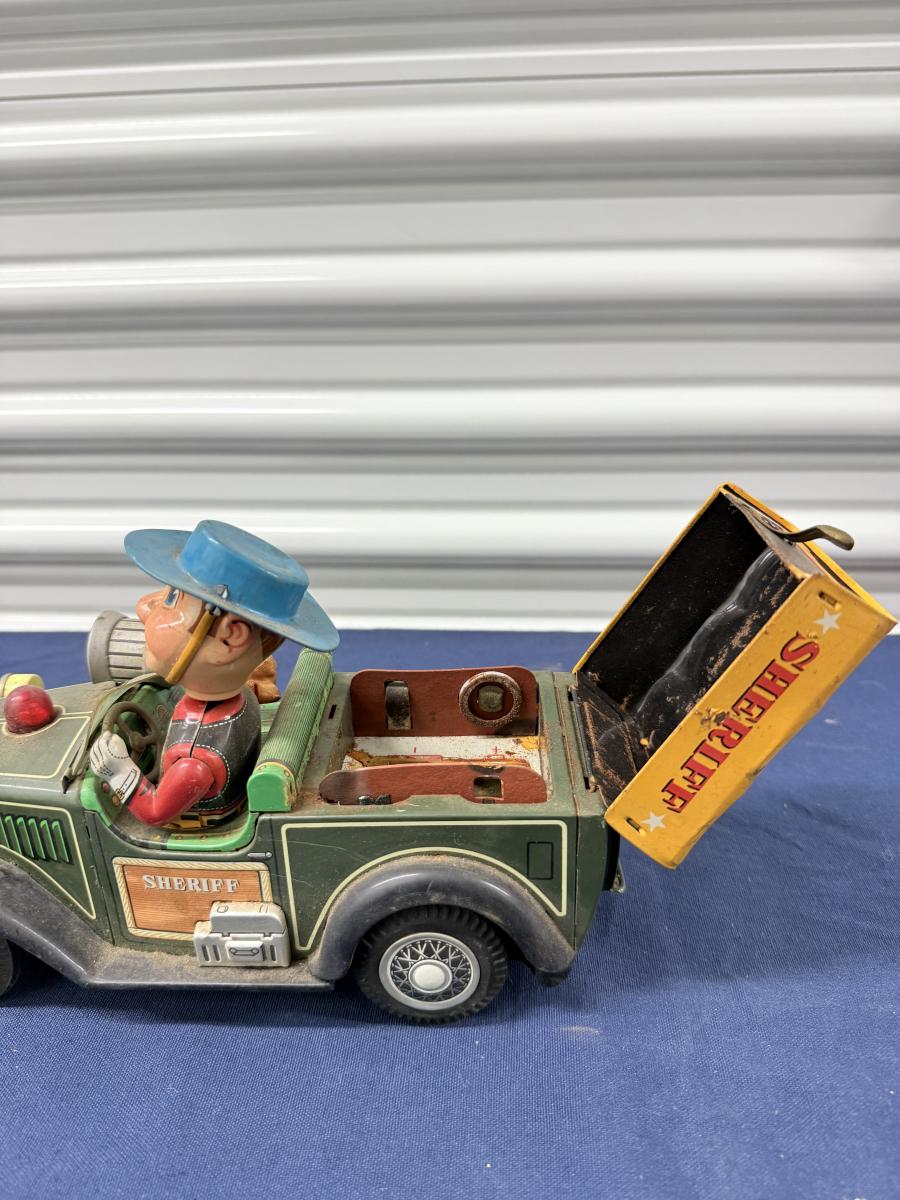 Vintage Tin Litho Sheriff Jeep Toy w/ Driver Figure Battery Operated