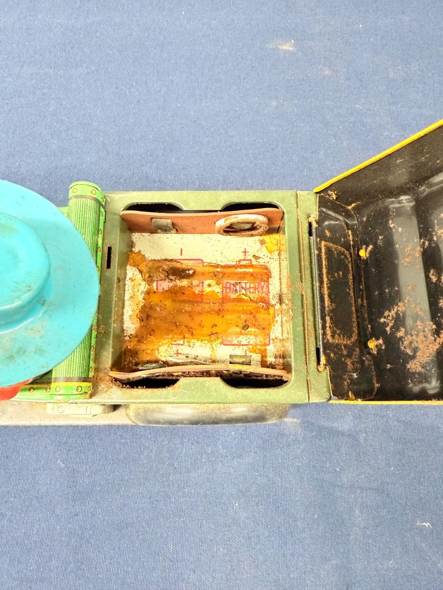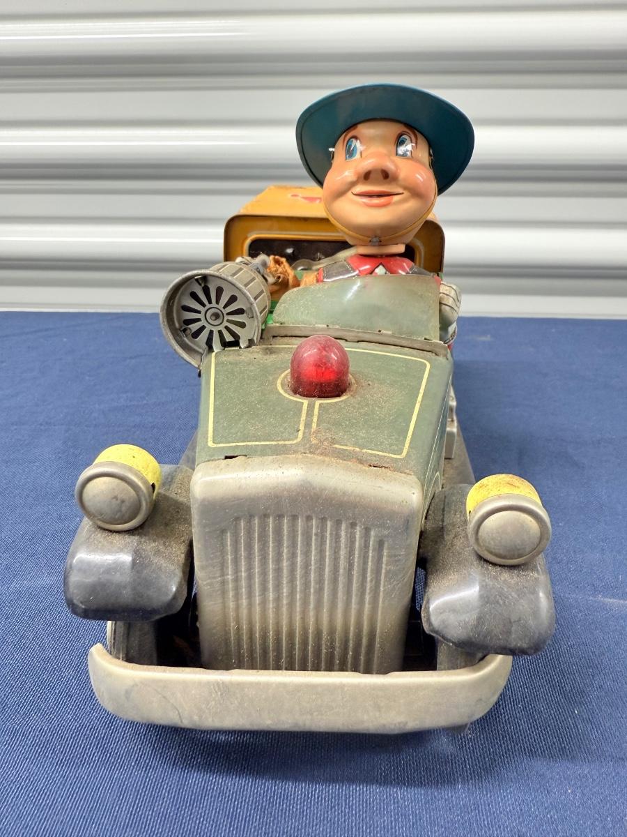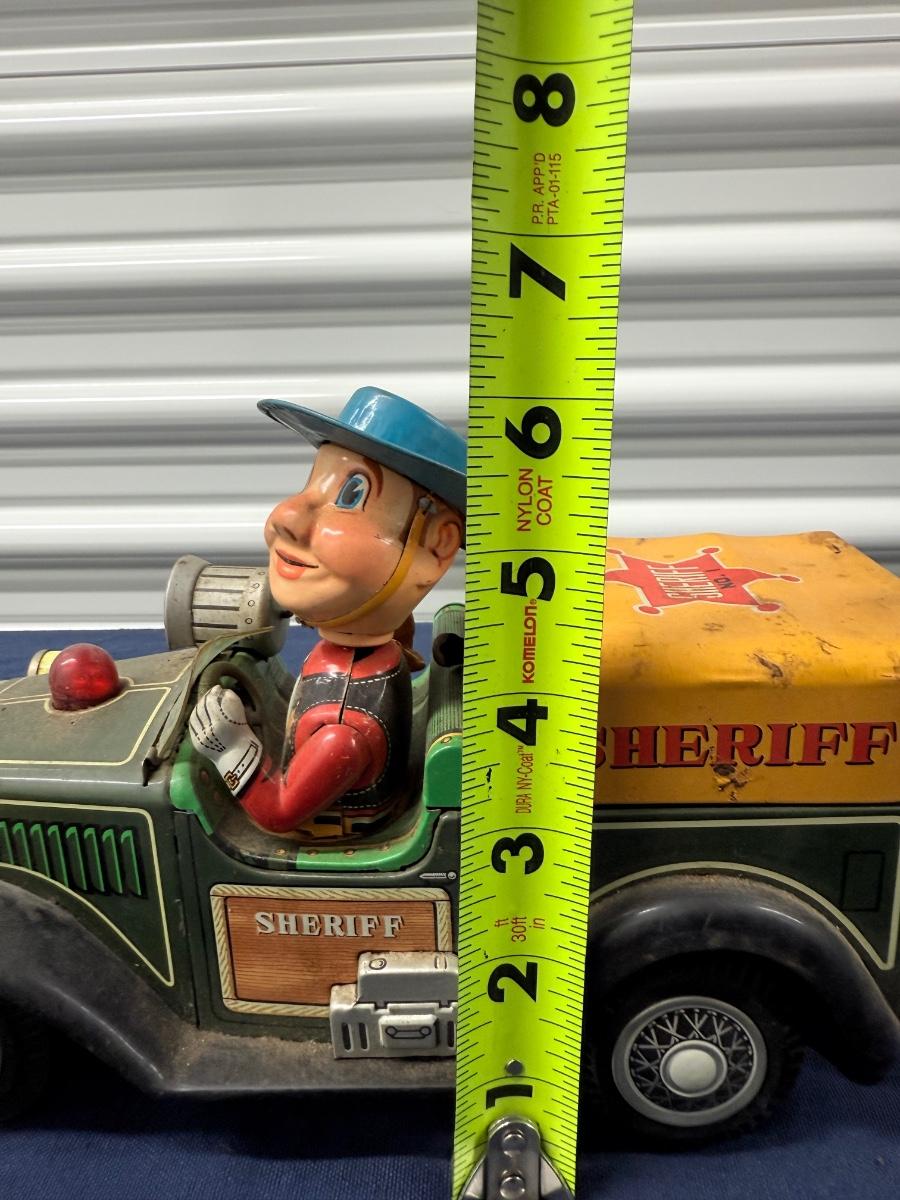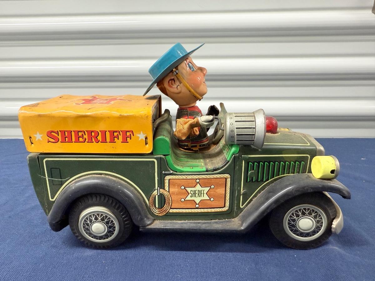 Vintage Tin Litho Sheriff Jeep Toy w/ Driver Figure Battery Operated