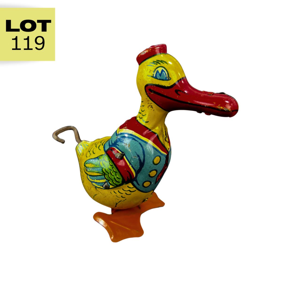 This Waddling Duck was produced in the mid 1900s by J. Chein in the USA. This duck has vibrant colors and has been cared for, you can tell. **Works, Video of Function on YouTube Video, Has Key** Please see photos for details and condition. **|** ::: Shipping is available on this lot. If you require shipping you must let us know at the close of the auction. We will coordinate with you after the item has been won. Shipping fees will include insurance up to or exceeding the value of all items being mailed. If you have any questions regarding this lot please contact the auctioneer either via this website, by direct email or by phone. PICK UP TIMES and other important information can be found in the TERMS and DESCRIPTION of the auction. Please take a look for pertinent information. Thanks!