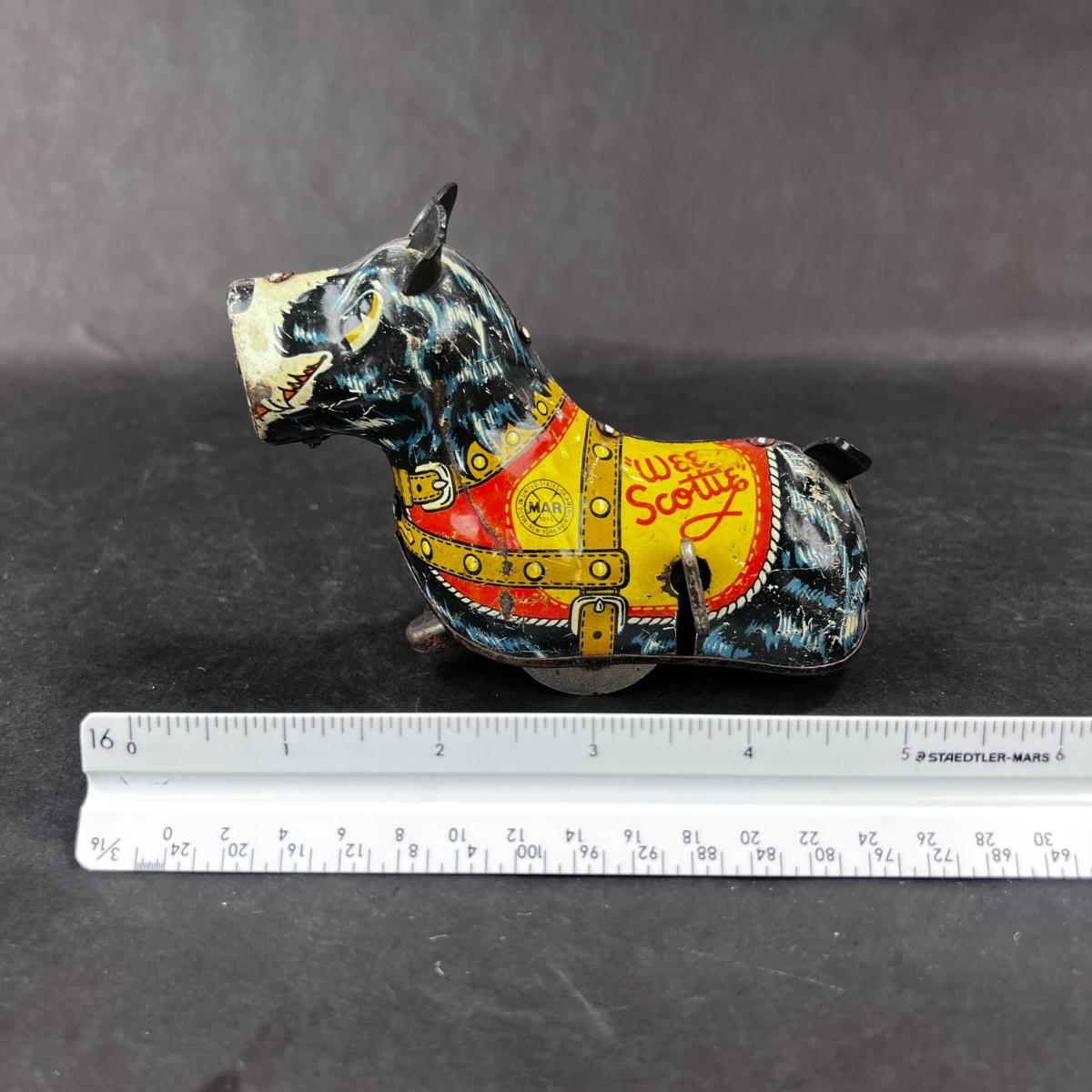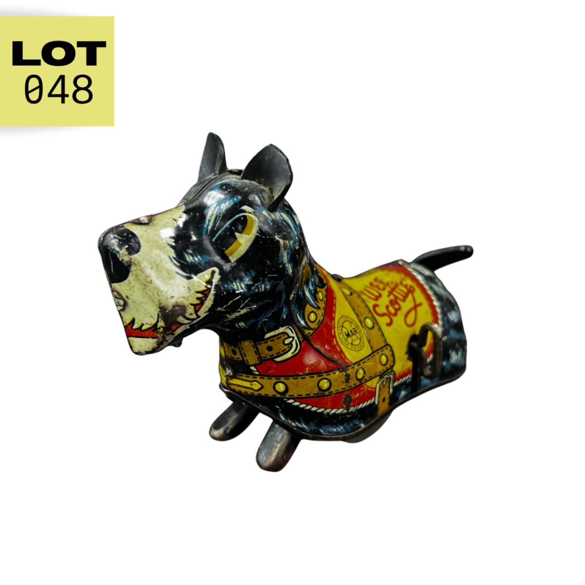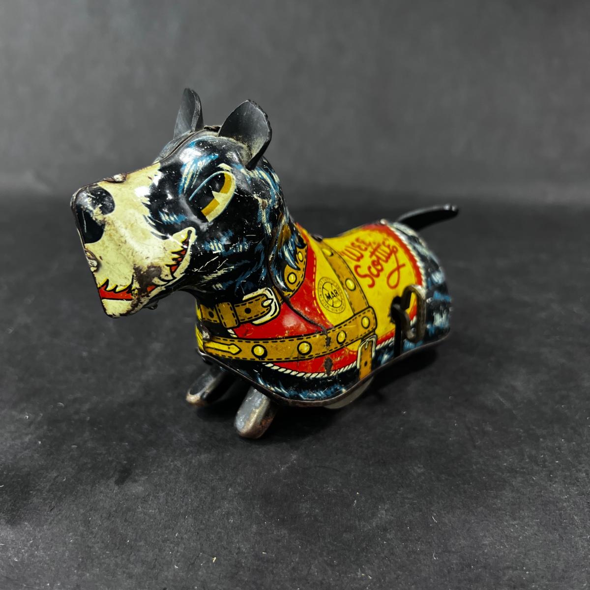This Wee Scottie - let me tell you. His little paws, as he moves across the floor - precious. This piece has excellent color. **Works, Video of Function on YouTube Video, Has Key** Produced by Marx this piece was made to last! **|** Please see photos for details and condition. ::: Shipping is available on this lot. If you require shipping you must let us know at the close of the auction. We will coordinate with you after the item has been won. Shipping fees will include insurance up to or exceeding the value of all items being mailed. If you have any questions regarding this lot please contact the auctioneer either via this website, by direct email or by phone. PICK UP TIMES and other important information can be found in the TERMS and DESCRIPTION of the auction. Please take a look for pertinent information. Thanks!