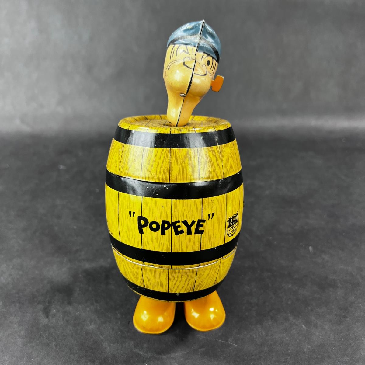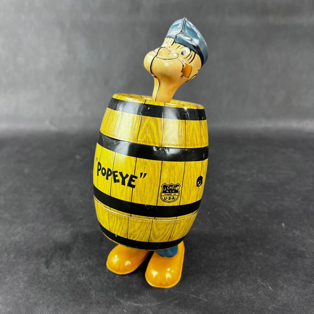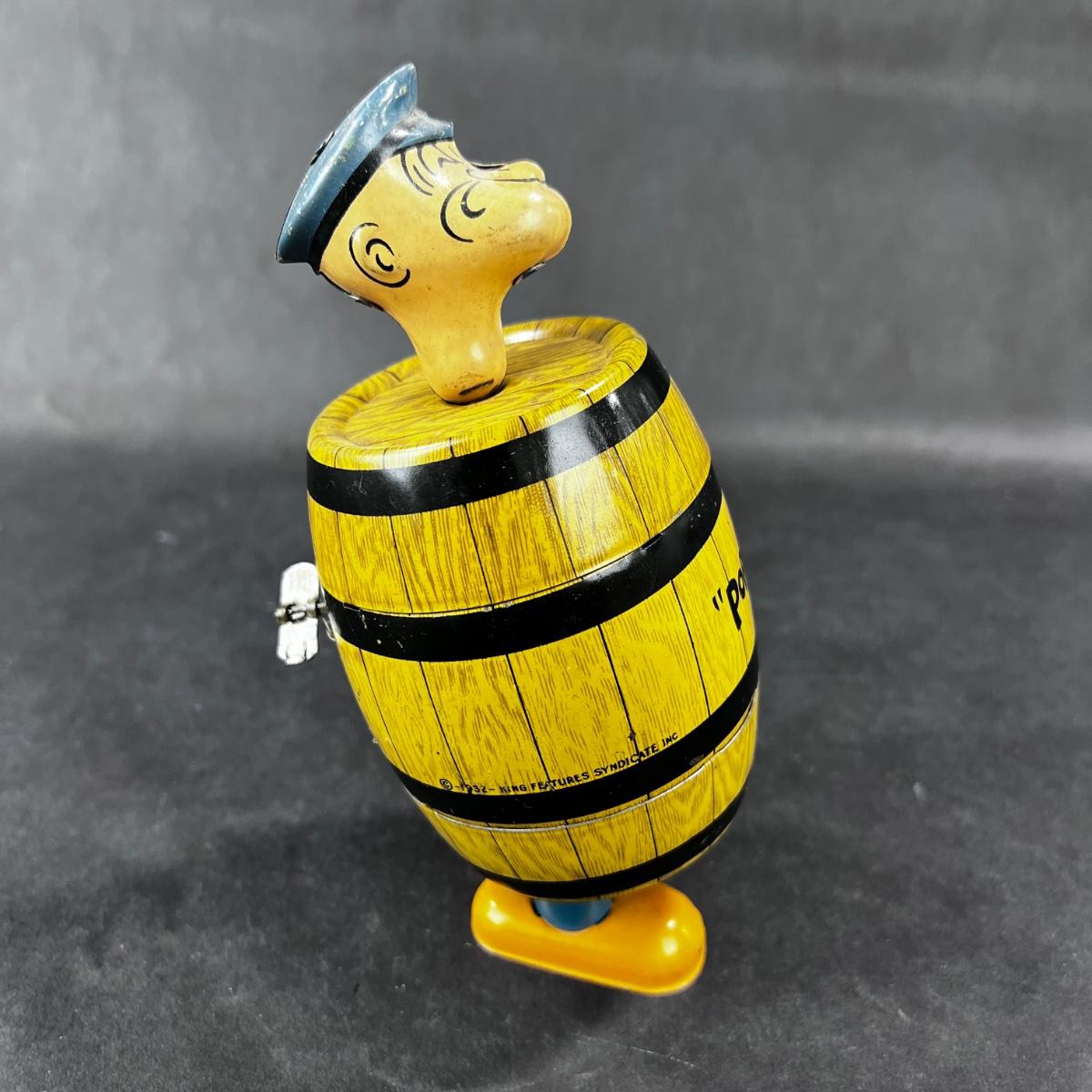 Vintage Tin Litho | Wind-Up Popeye in Barrel | J. Chein & Co.