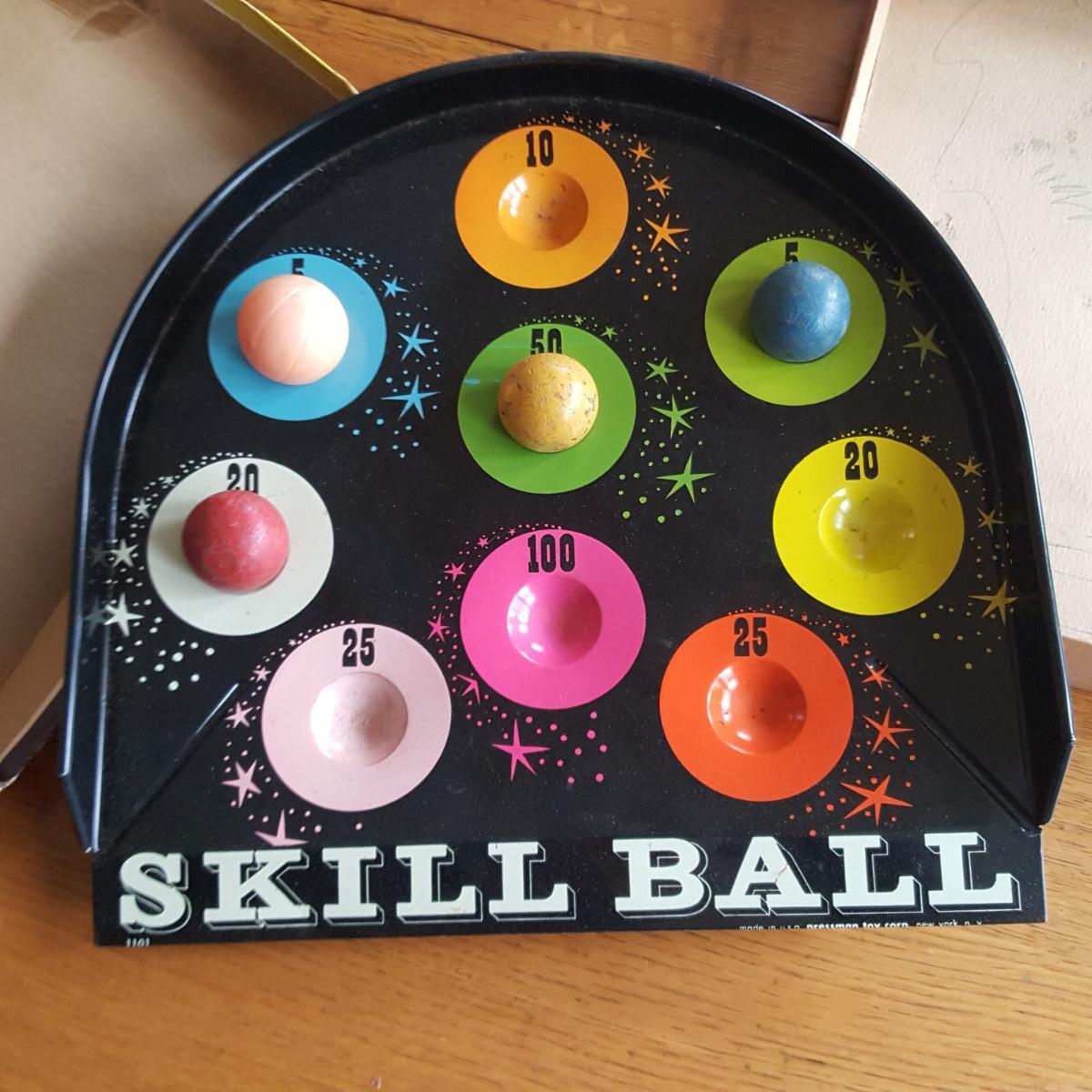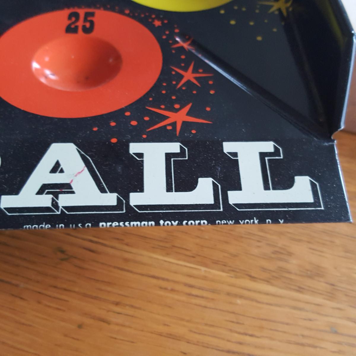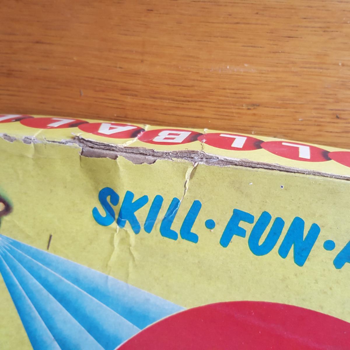 This auction lot is for a Vintage Tin Skillball Game. The game piece is tin with terrific graphics. There is a small bit of damage on the letter "A" on the game piece - see photo. Comes with 5 colored balls and a nifty box that also sports some nice vintage graphics, but has some wear and tear. Box measures about 13-inches square.