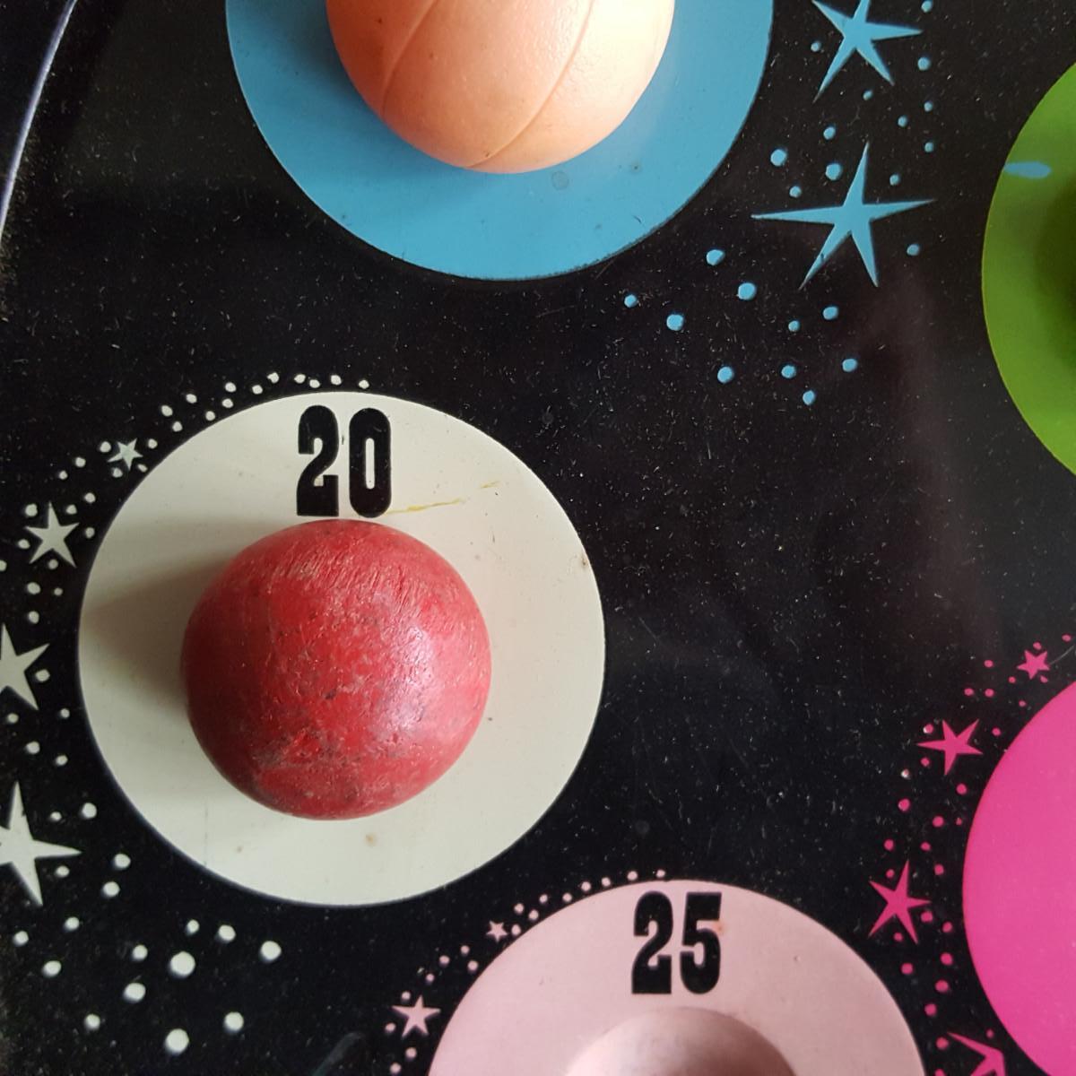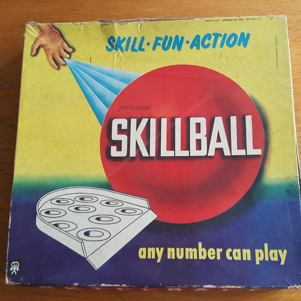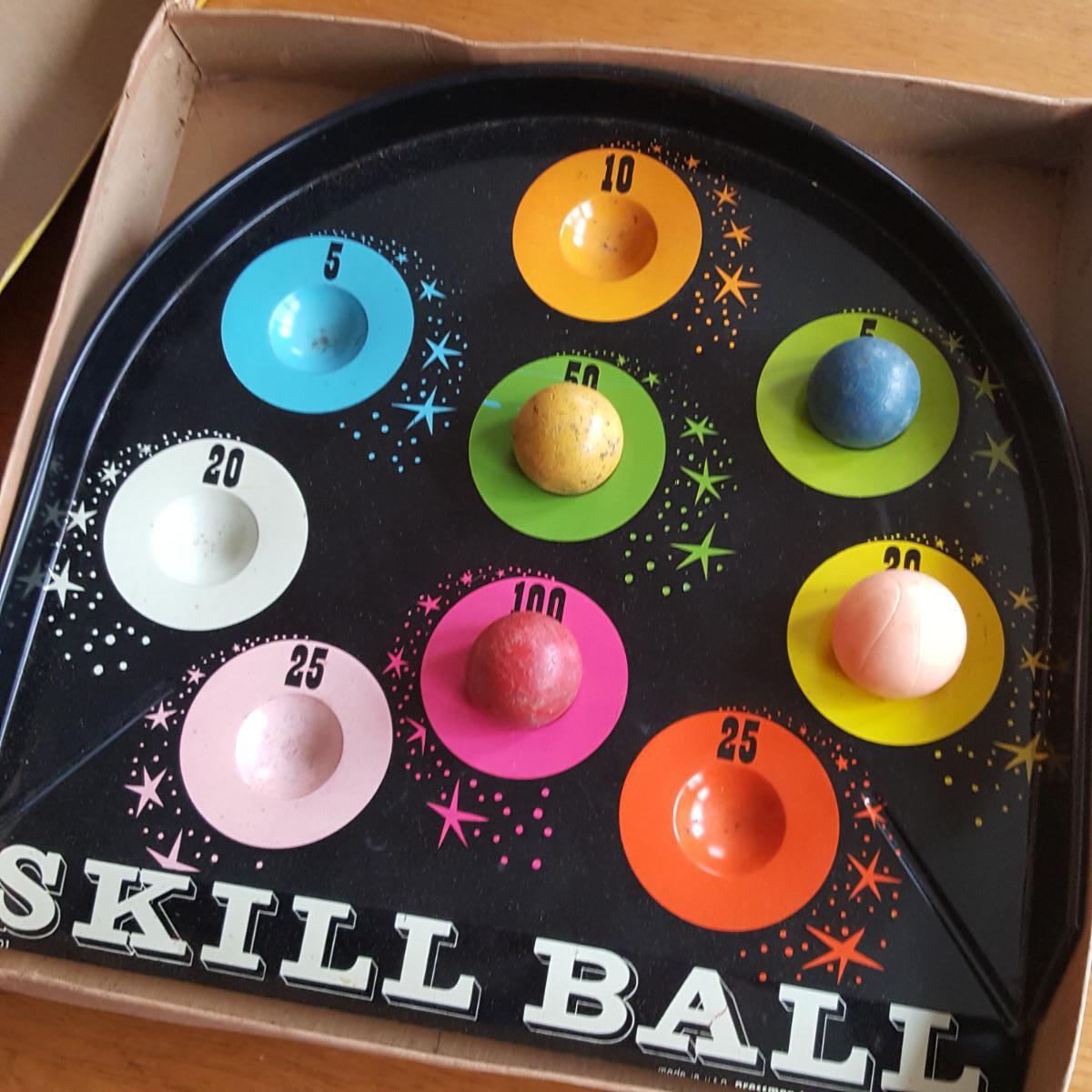 This auction lot is for a Vintage Tin Skillball Game. The game piece is tin with terrific graphics. There is a small bit of damage on the letter "A" on the game piece - see photo. Comes with 5 colored balls and a nifty box that also sports some nice vintage graphics, but has some wear and tear. Box measures about 13-inches square.