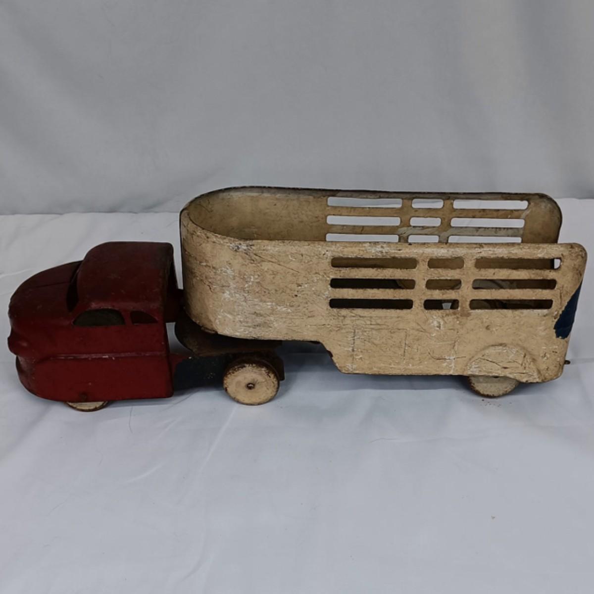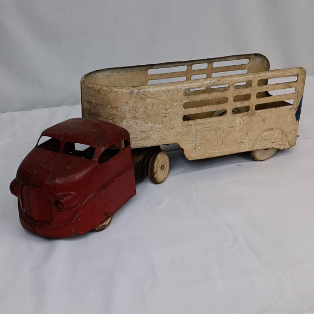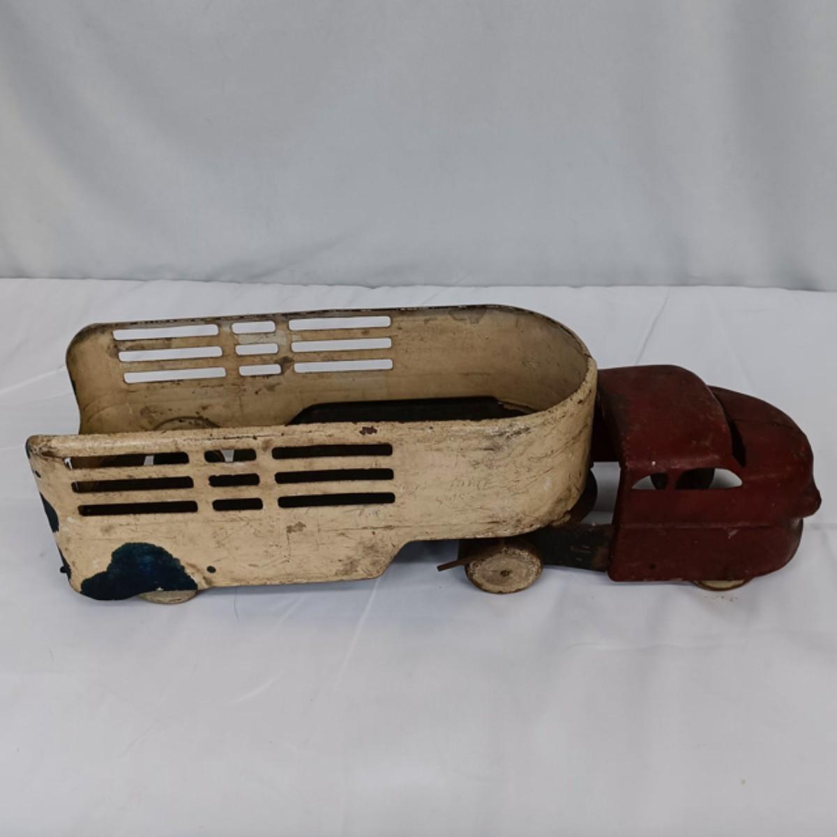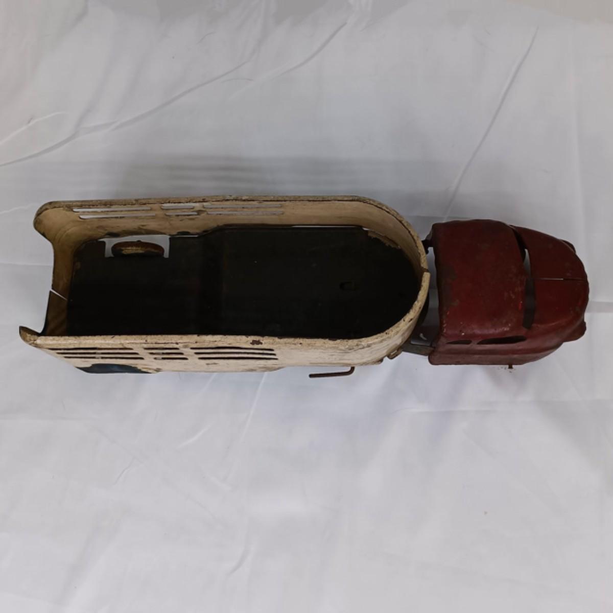 This vintage tin truck is in good condition considering its age and intended use. It has all it's wheels and rolls freely. As pictured.