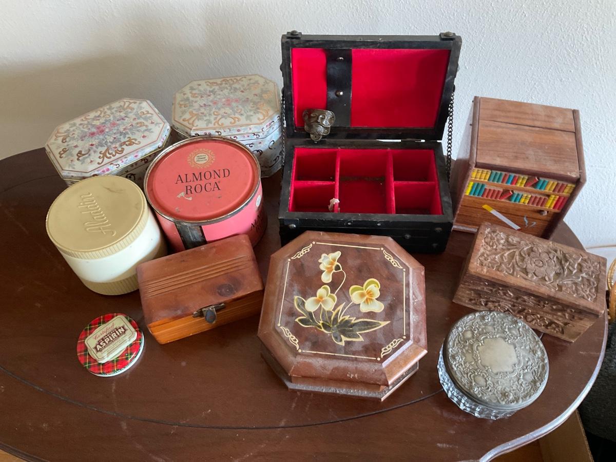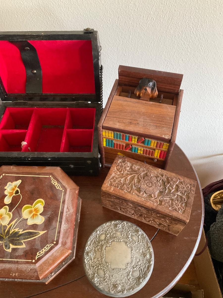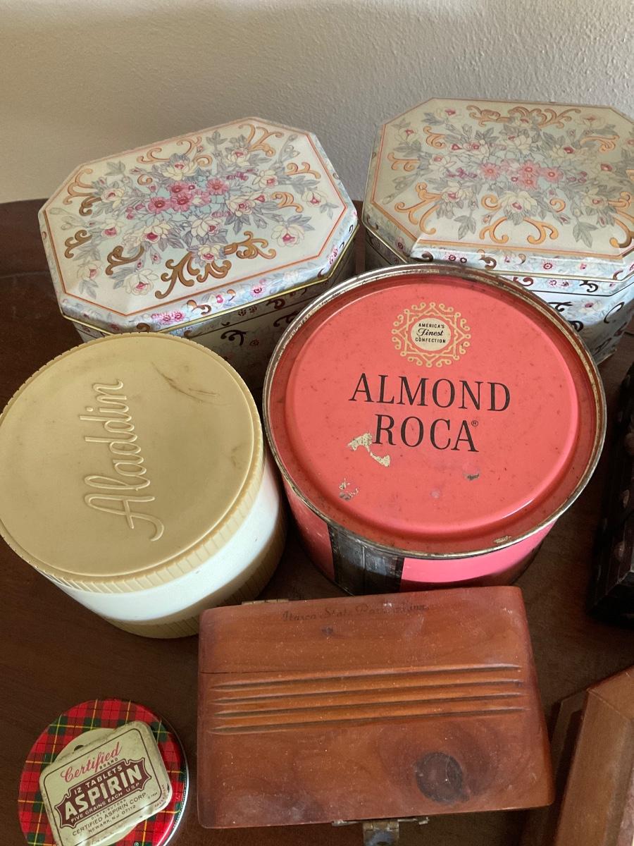 Vintage tin wood boxes & 1960s cigarette dispenser