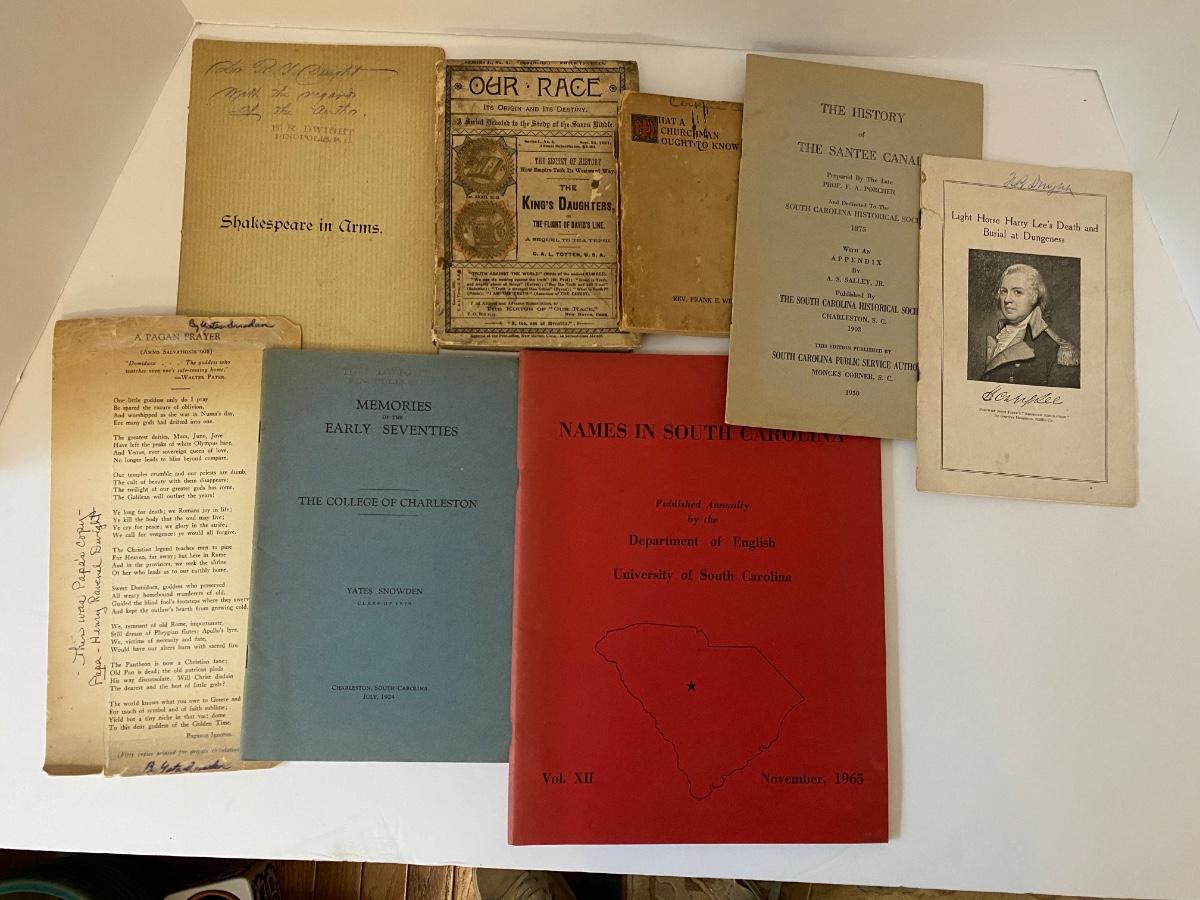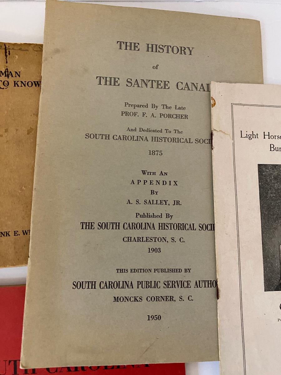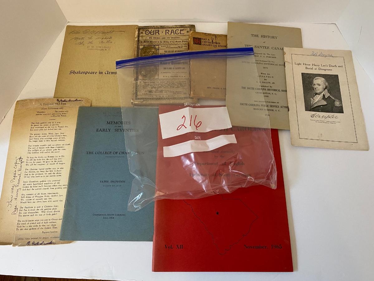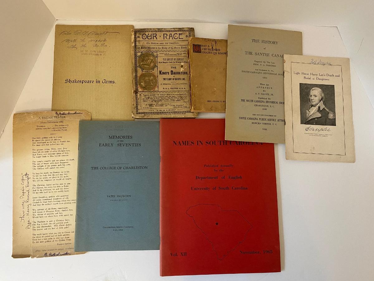 Vintage to Antique Printed Publications to include: History of Sante Canal (1950), A Church Man ought to know (1921), Our Race its origin and its Destiny (1891), Memories of the early 70's (College of Charleston) (1924 AUTHOR SIGNED), Shakespeare in Arms an address Col John P Thomas at Clemson College (1897), Names in SC (1965) as pictured