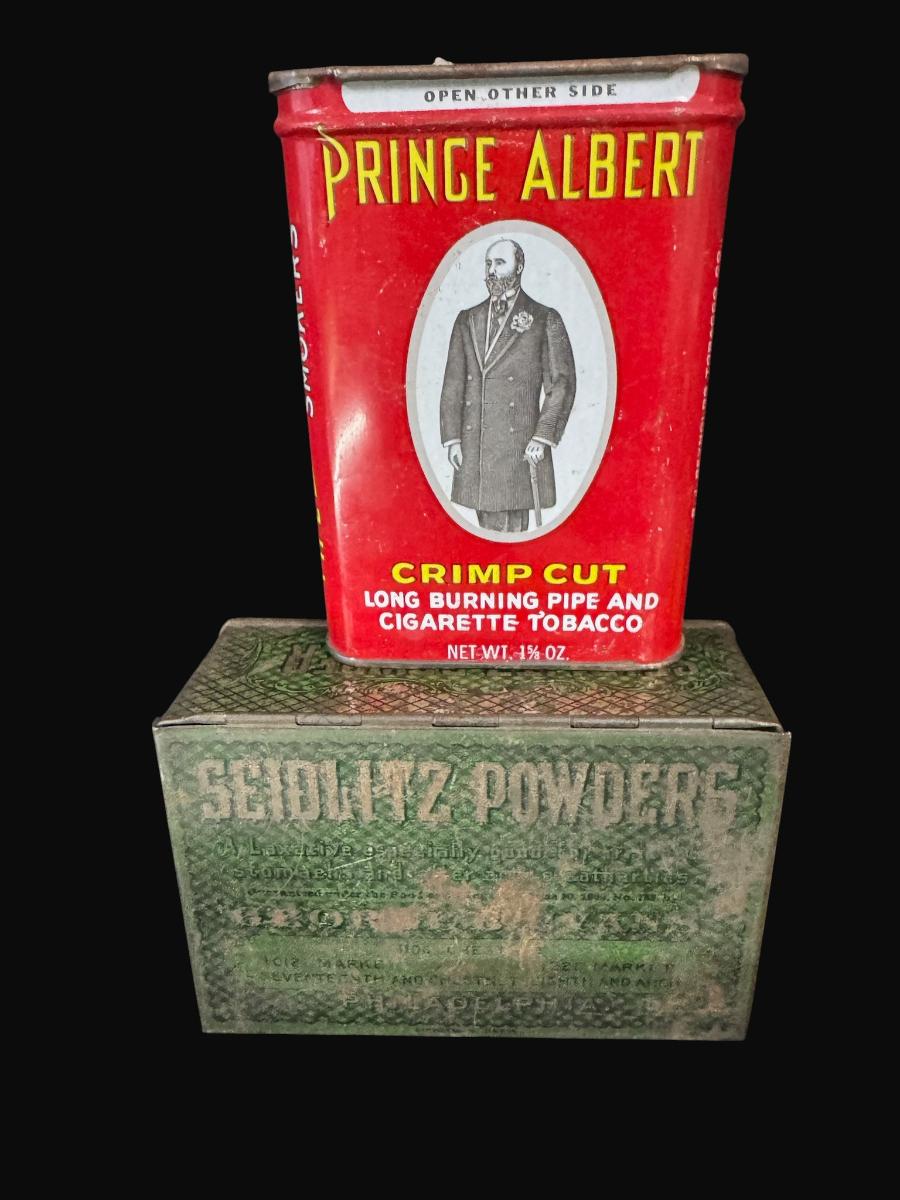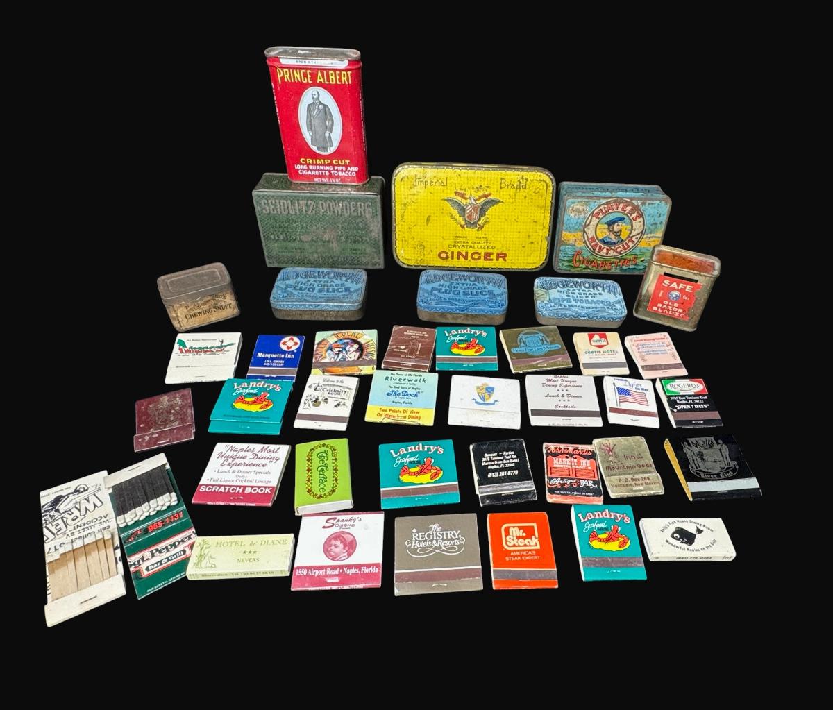 Includes tobacco tins and matchbooks, Names include Ginger, Players, Edgeworth, and more. Also includes a razor blade safe. Total of 40 pieces. [CS]