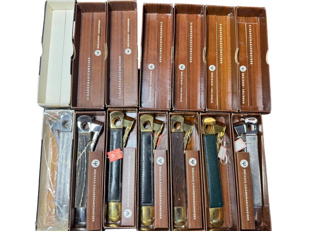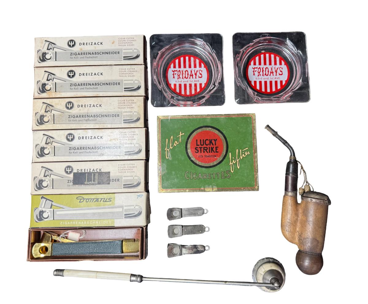 Includes six NOS unopened Dreizack cigar cutters, one unopened Dottatus cutter, two vintage ashtrays, a hunting pipe, and a candle snuffer, and more. Total of 15 pieces. [JL]