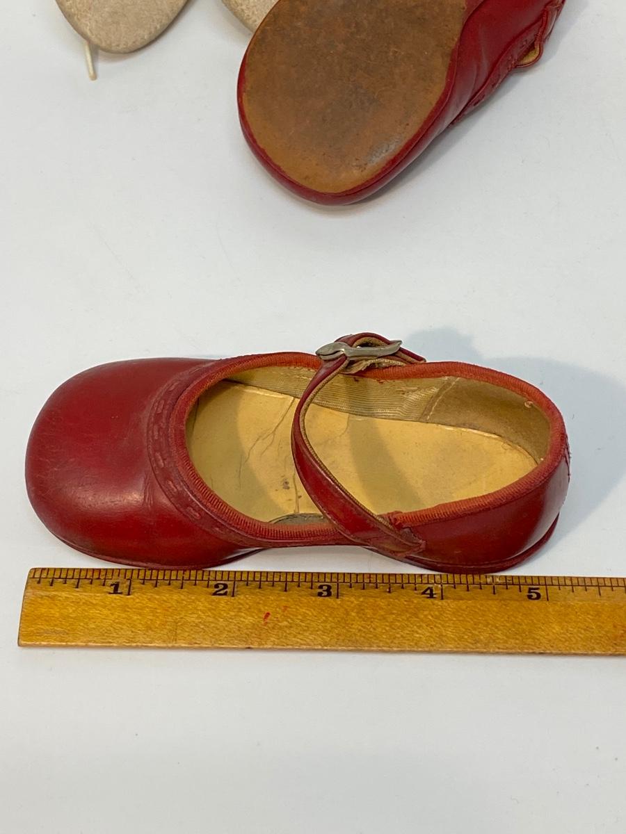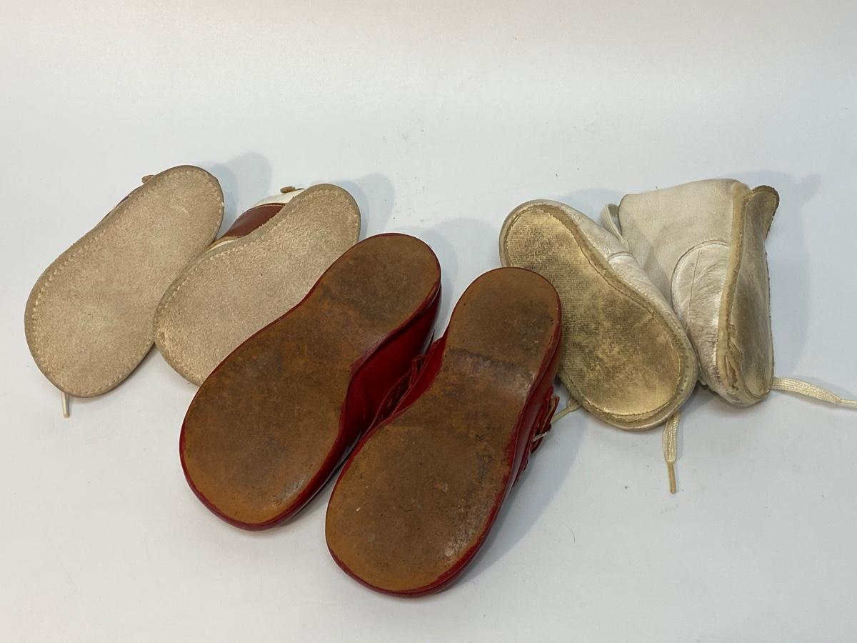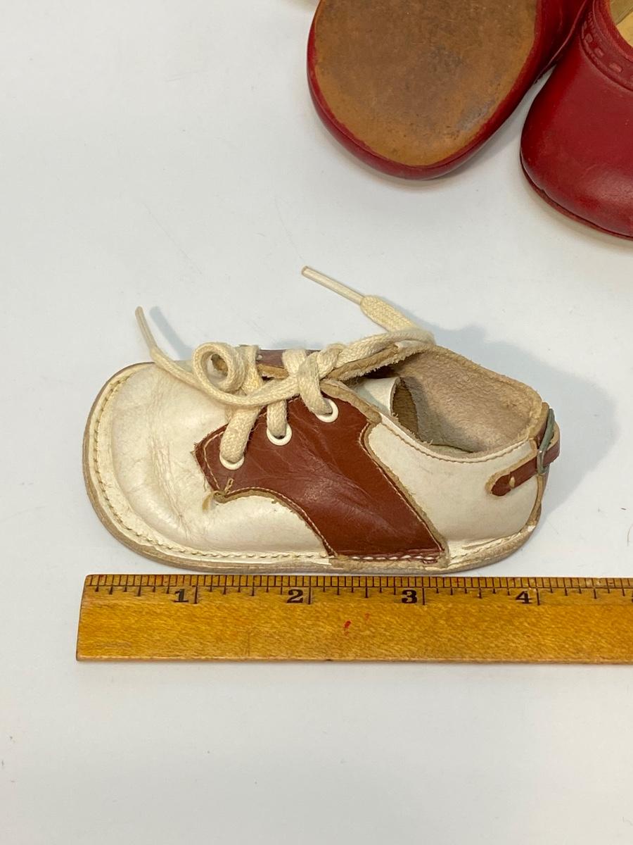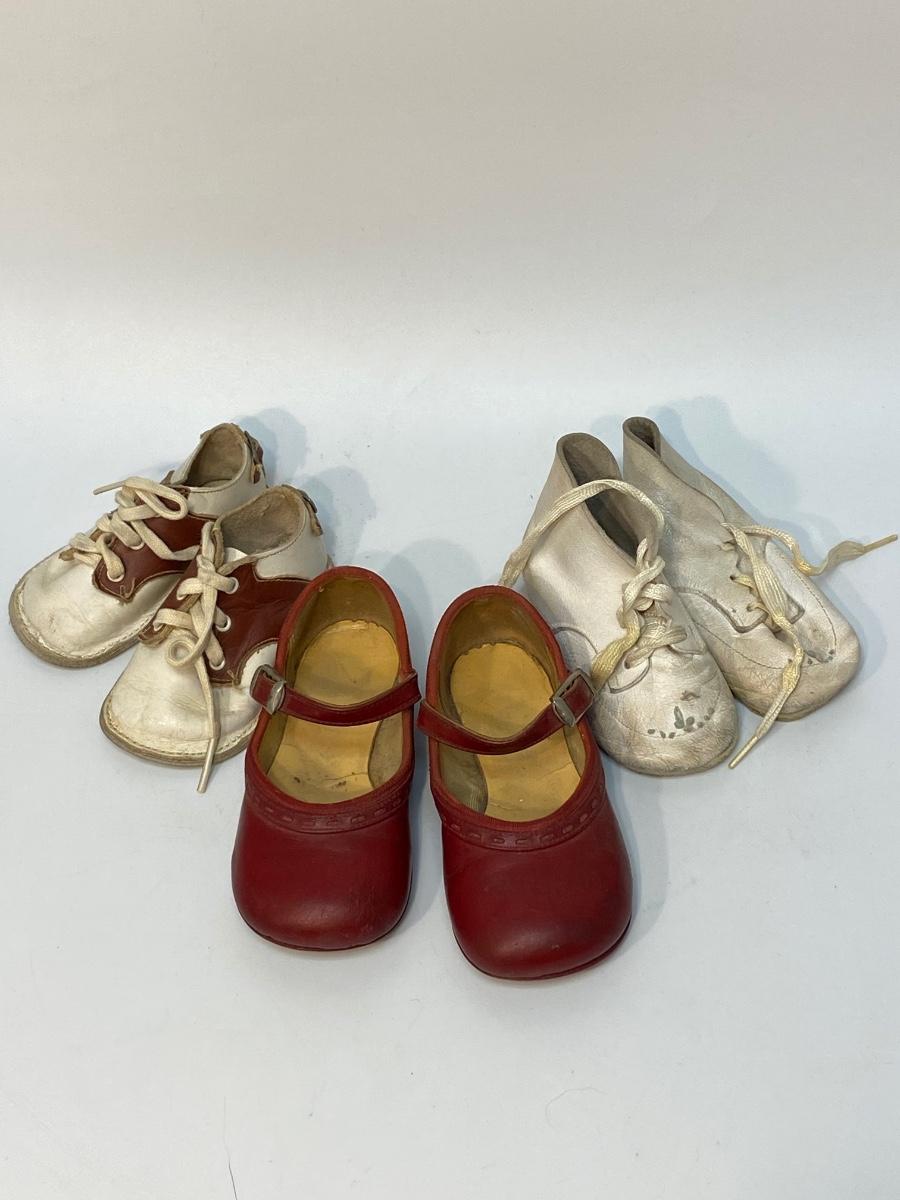 Three pairs of vintage baby and toddler shoes. Worn. Good for dolls or crafting projects.