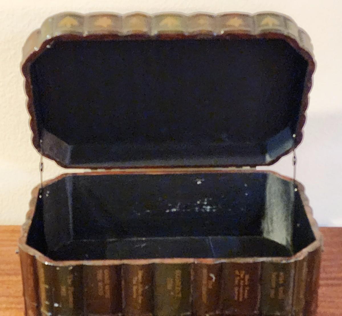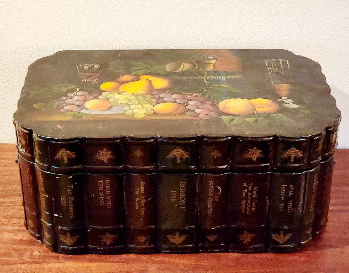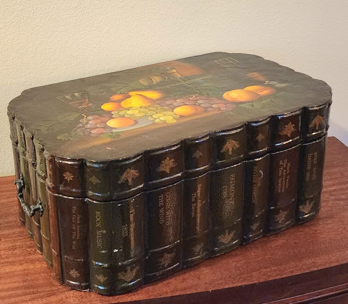 Super cute, large decorative trunk. Sides are scalloped to look like book spines. Top looks like a still life painting. Metal handles on the sides. Lined with black satin. Bottom is covered with maroon felt.
