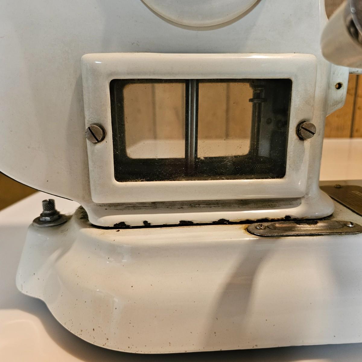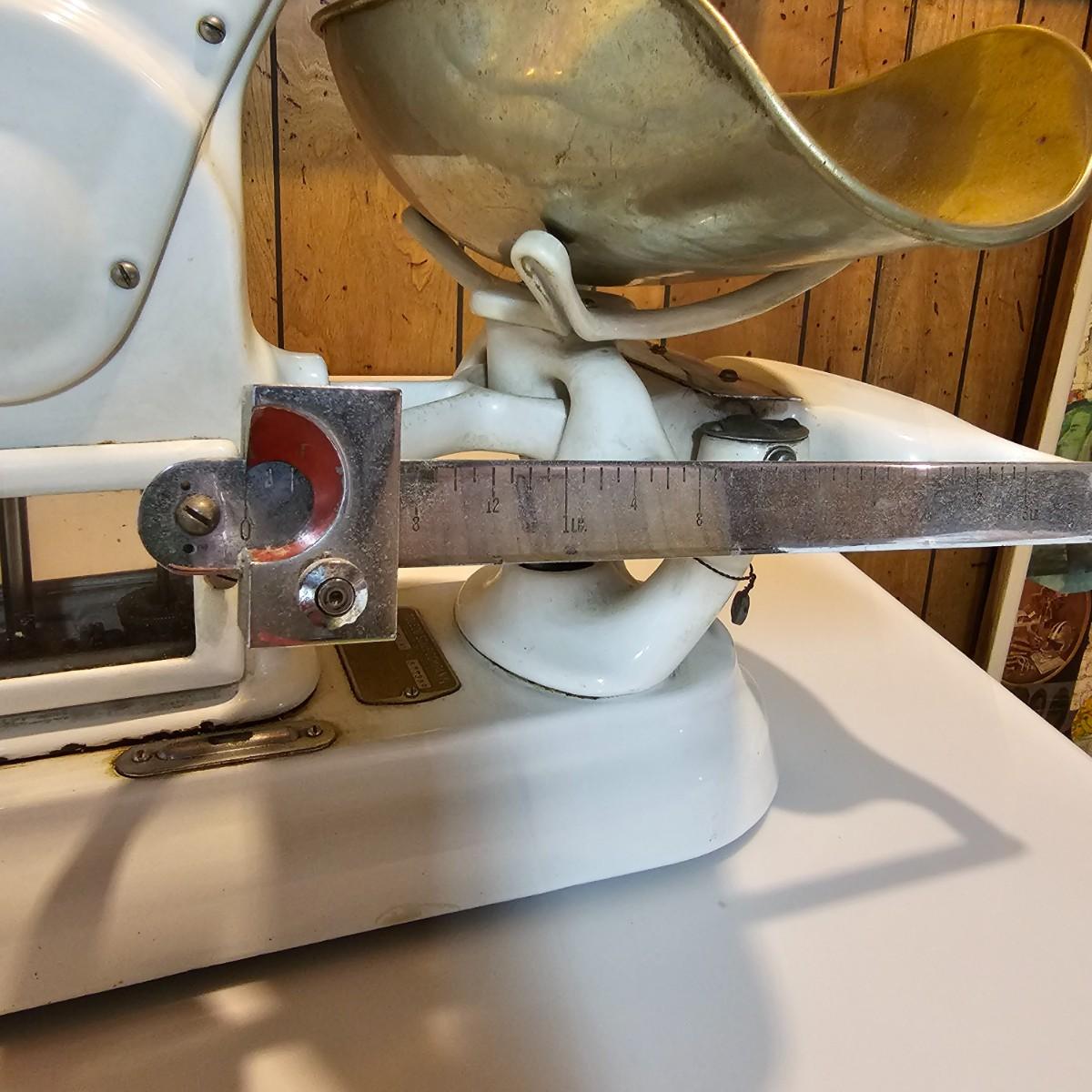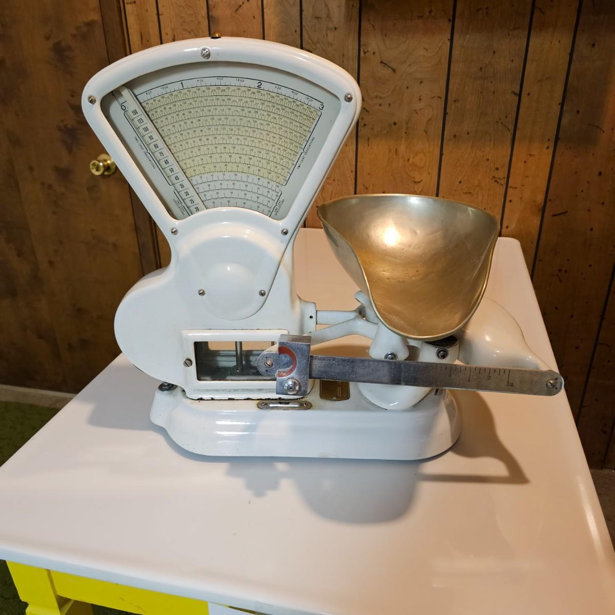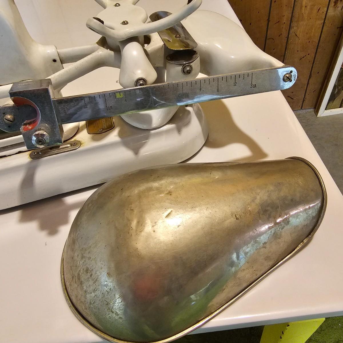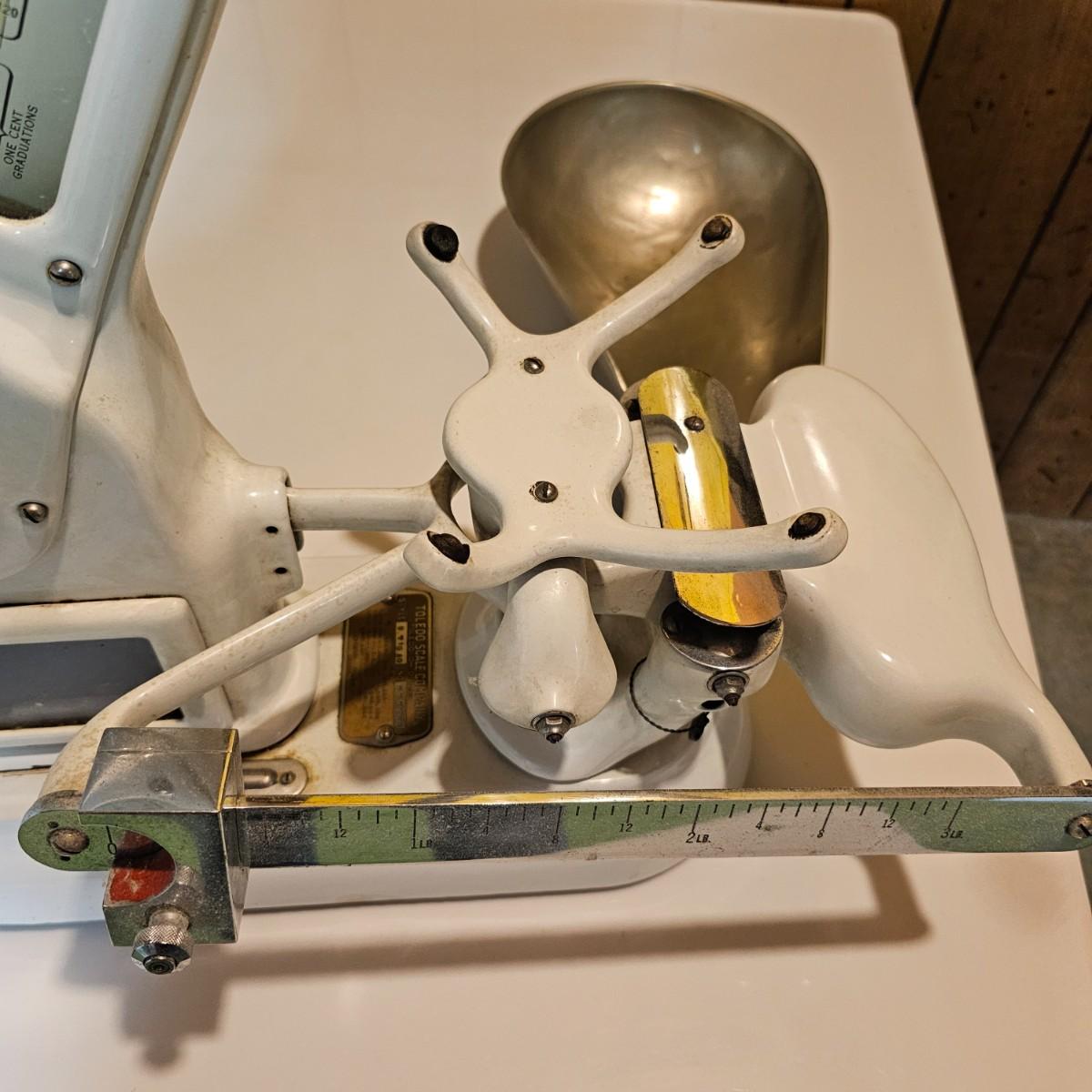 An old style counter scale, made by Toledo Scale Company of Ohio. White enamel over cast metal base, with stainless bsr and counterweight. Includes the aluminum scoop for weighing and dispensing. Scale is 22" x 10" x 20"H. Scoop is 9" x 13" x 3"H. Scale was originally used in a candy store. No guarantee on validity of weight. See photos for details. Local pickup only.