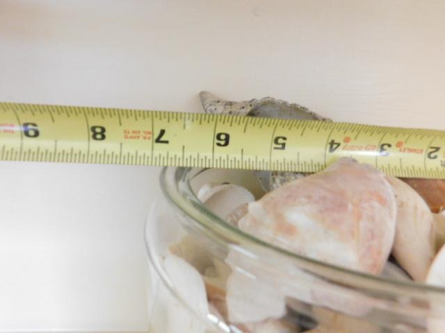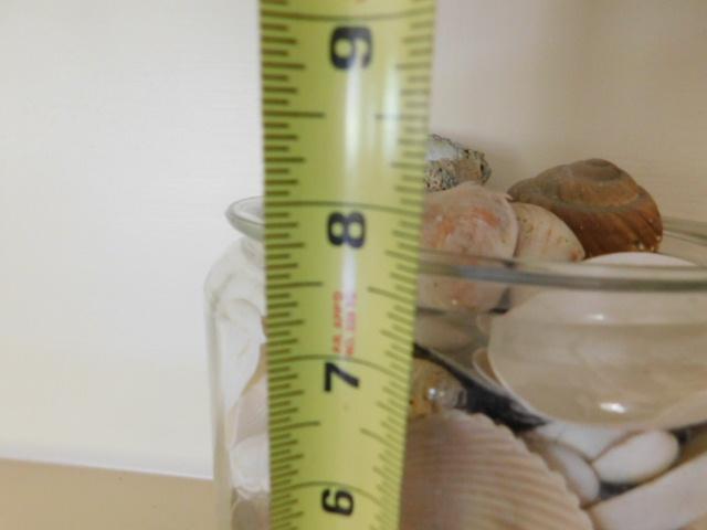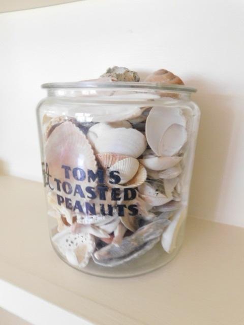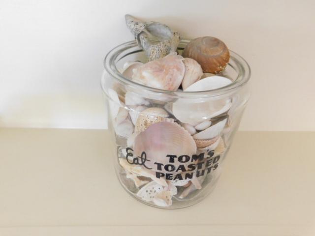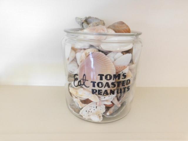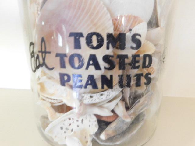 Vintage Tom's Peanuts Glass Jar Filled with Sea Shells jar has no lid.