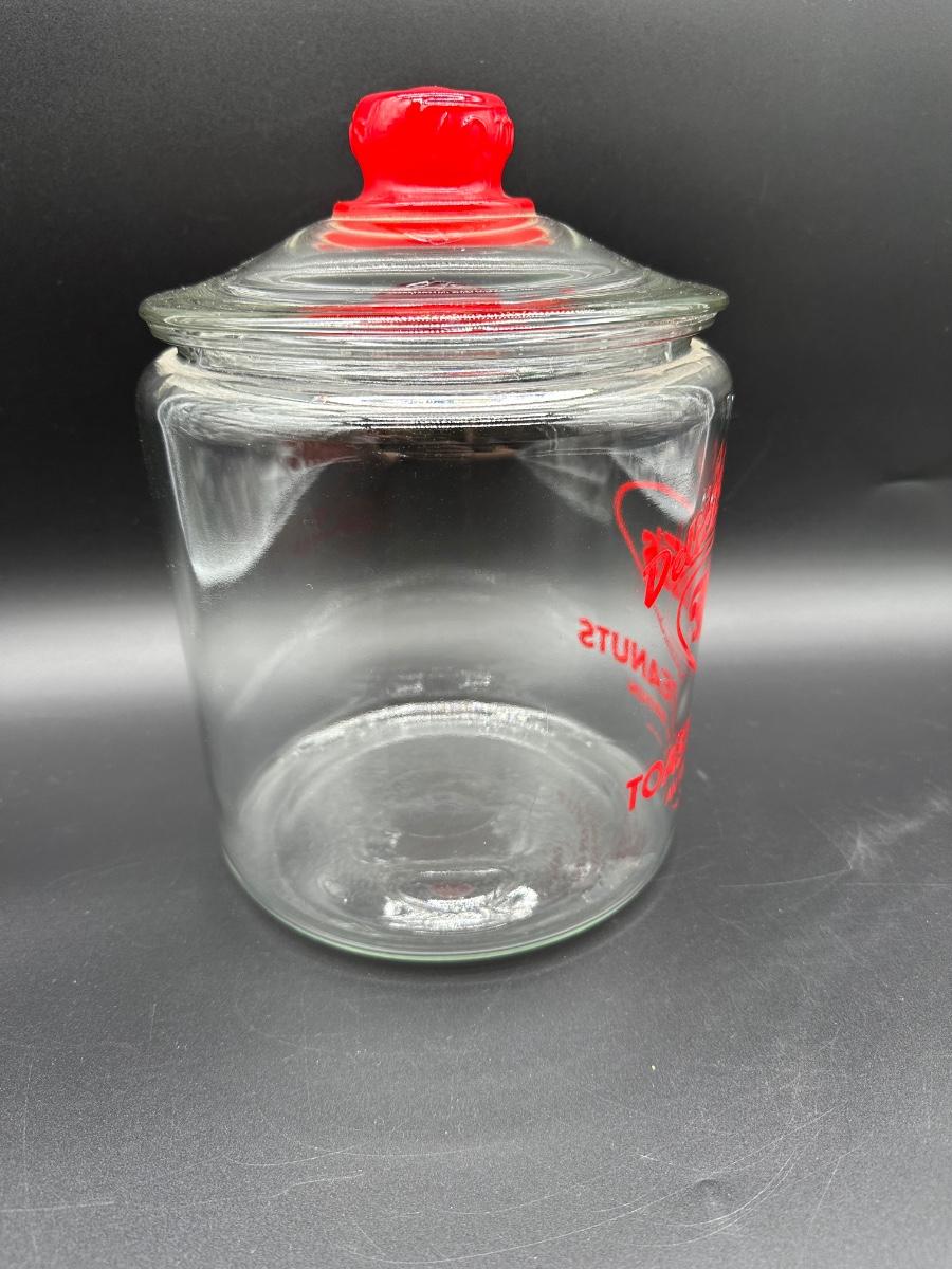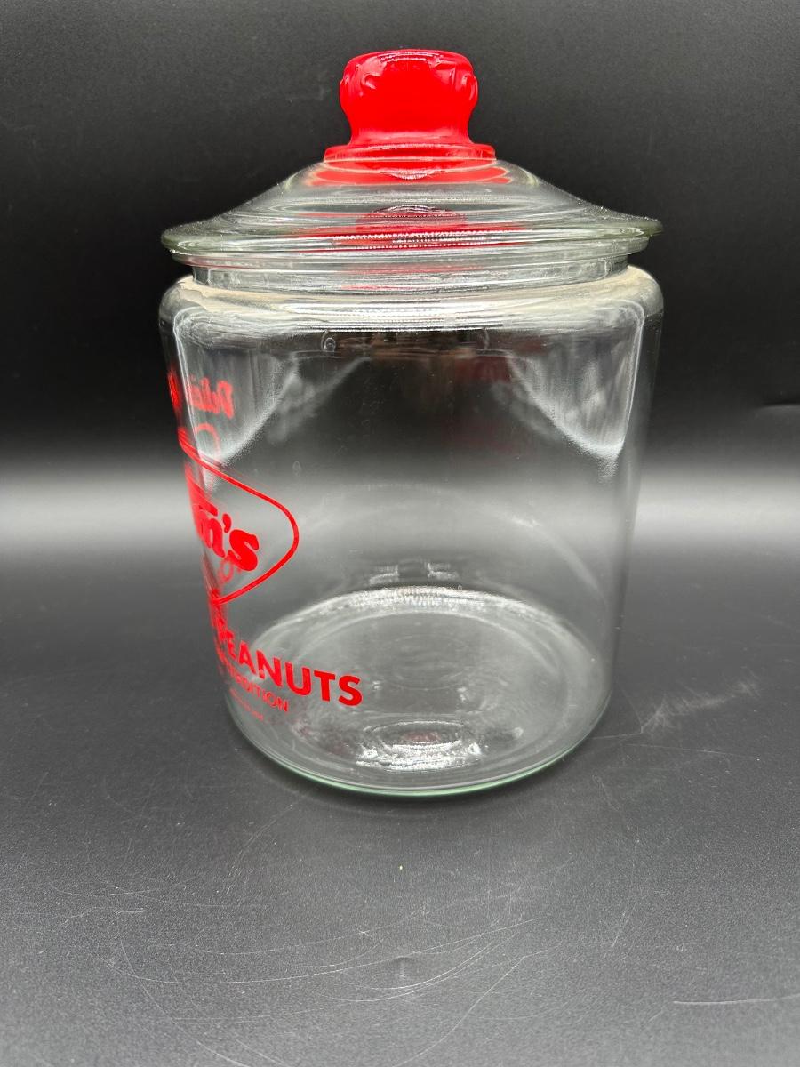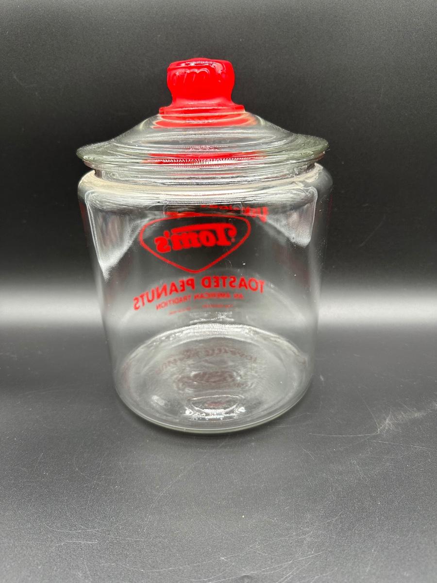 Vintage original Tom’s Toasted Peanuts glass store display jar with original red glass lid.