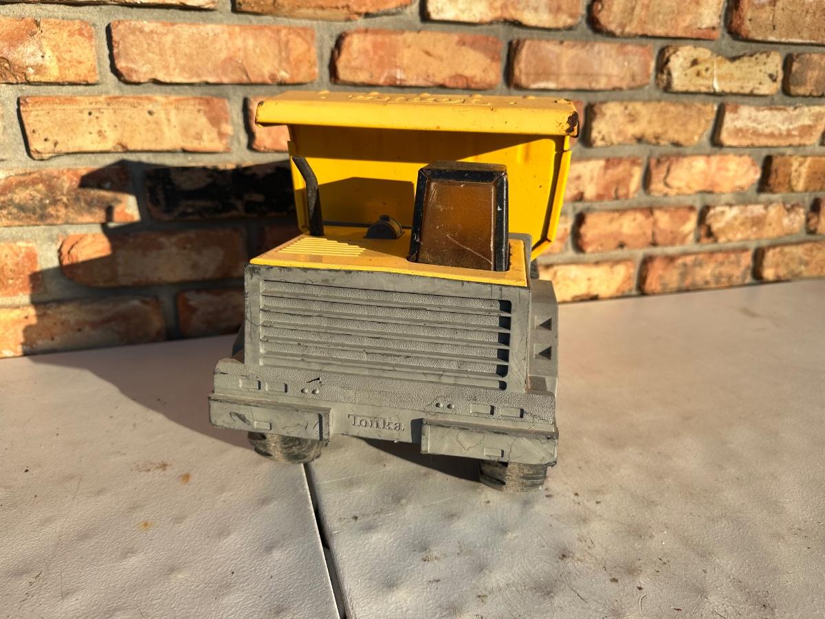 Vintage Tonka No. 354 dump truck featuring the classic yellow dump bed with gray cab and chassis. This is a mixed-material Tonka (pressed steel dump bed with plastic body components), typical of later Tonka production.