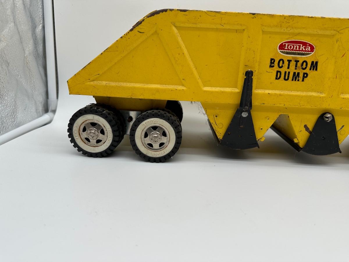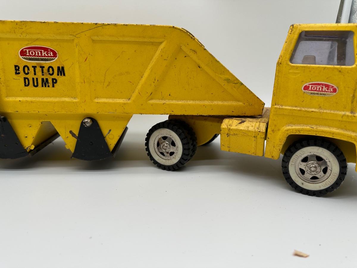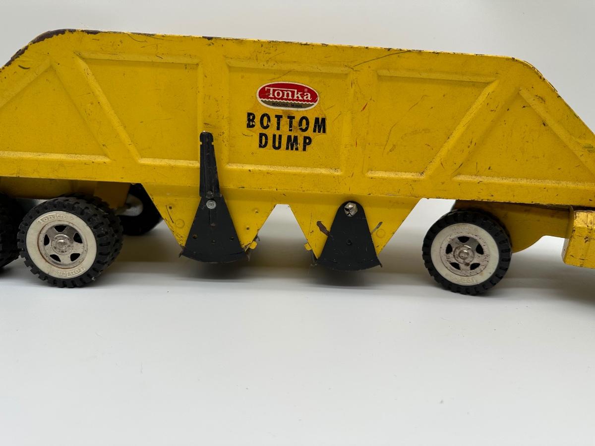 Classic vintage Tonka Bottom Dump pressed steel truck in original yellow paint. Features working bottom dump release, multiple axles, and original Tonka decals. Large, heavy-duty construction toy—great display piece or restoration candidate.