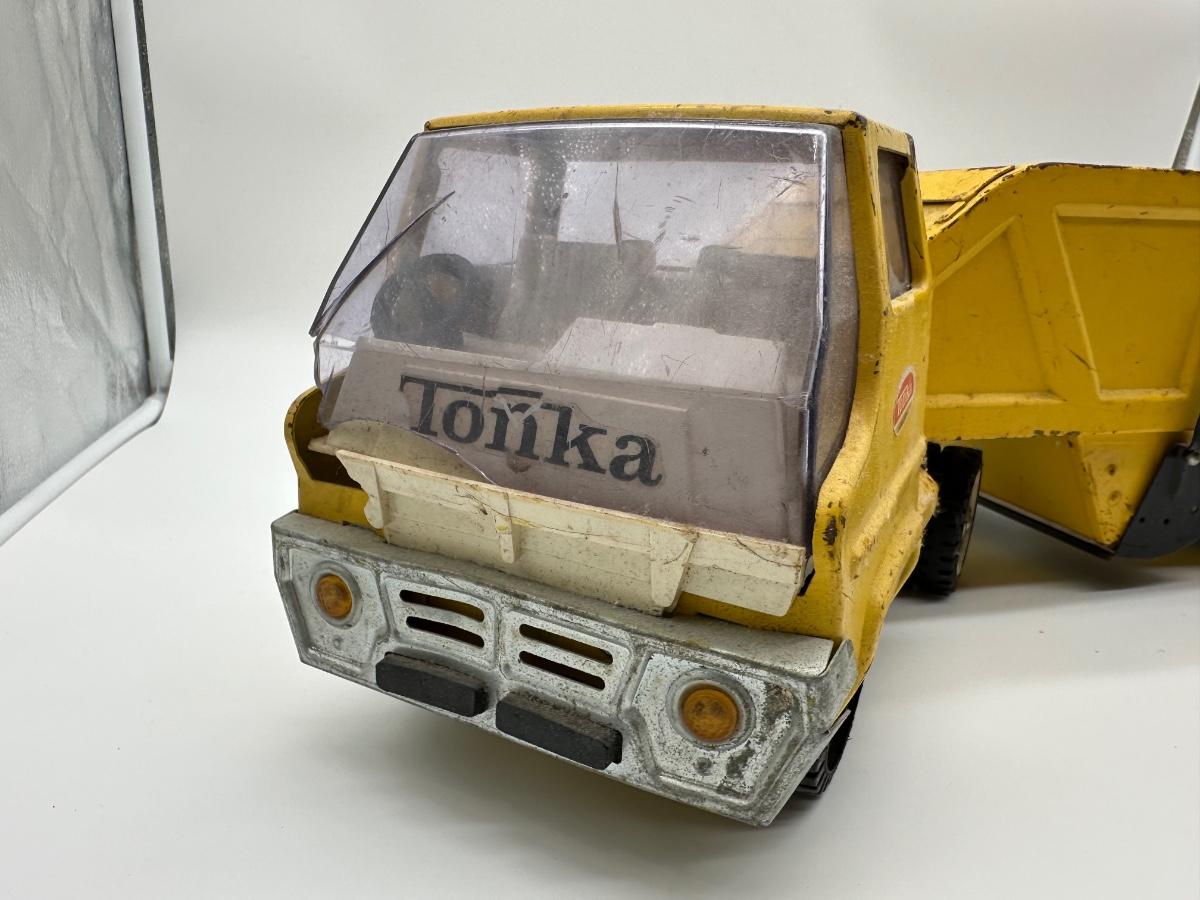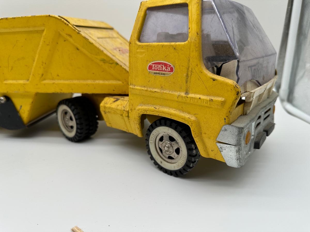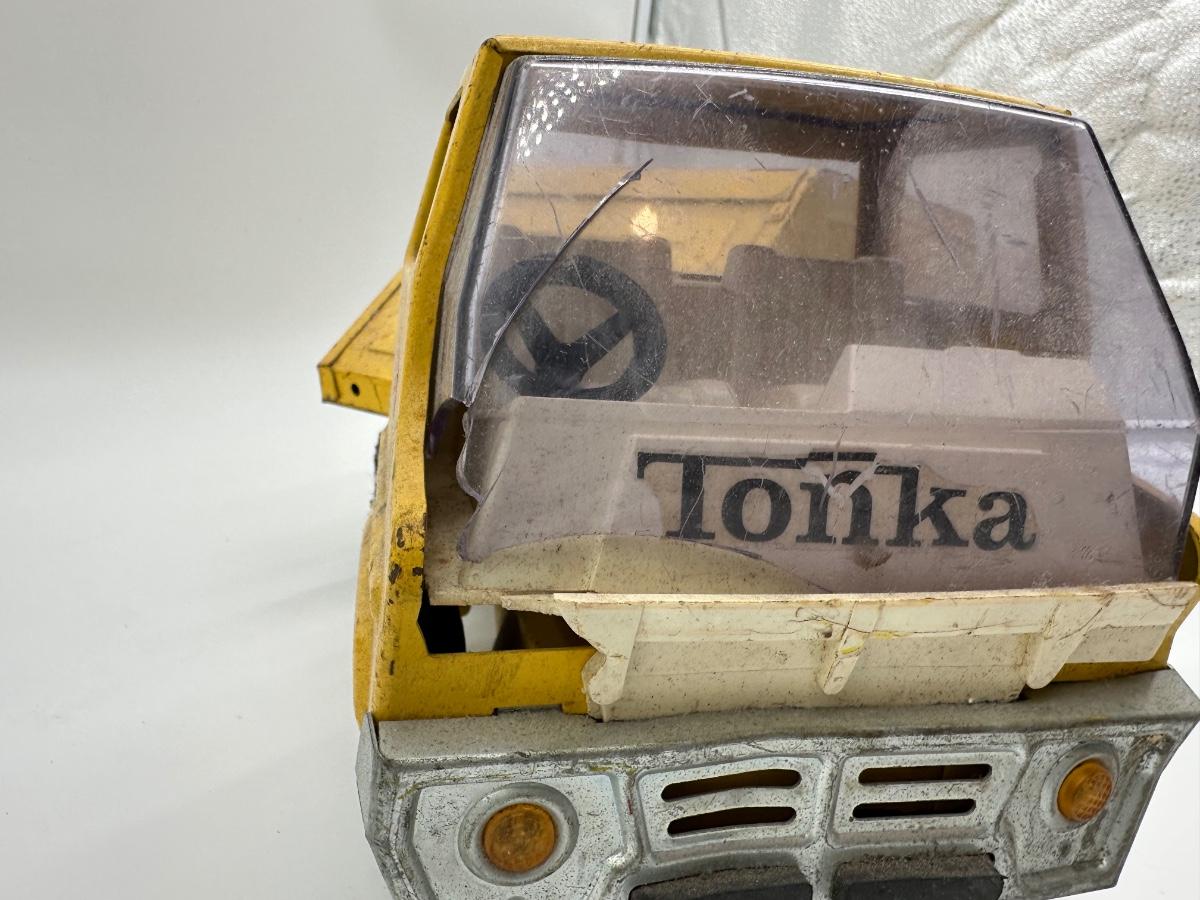 Visible play wear, paint loss, scuffs, and surface rust. Cab windshield shows cracking and wear. Dump mechanism appears intact. All wheels present. See photos for overall condition.