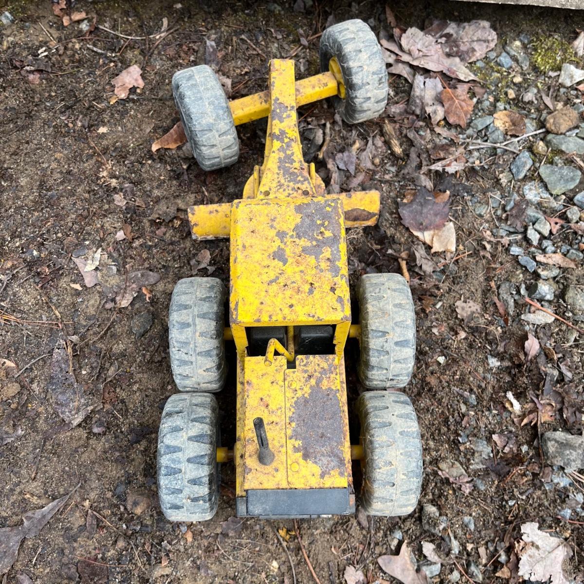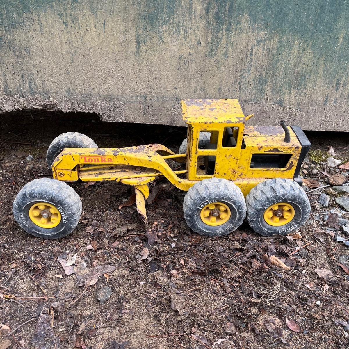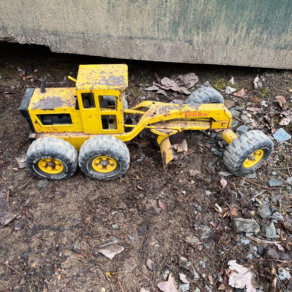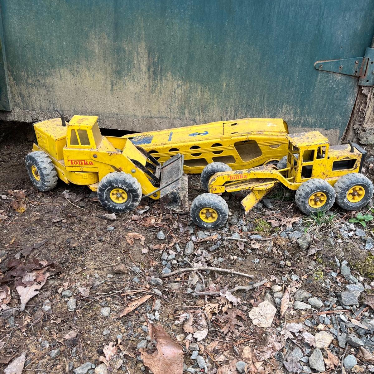 Lot includes a metal Tonka Grader, articulated bulldozer and a car trailer. The bulldozer measures 8.5” x 19” x 9”.