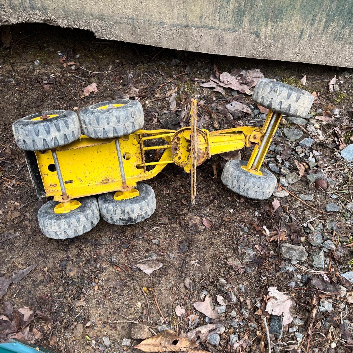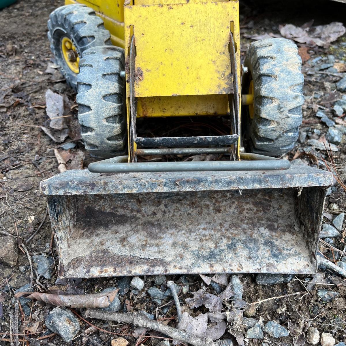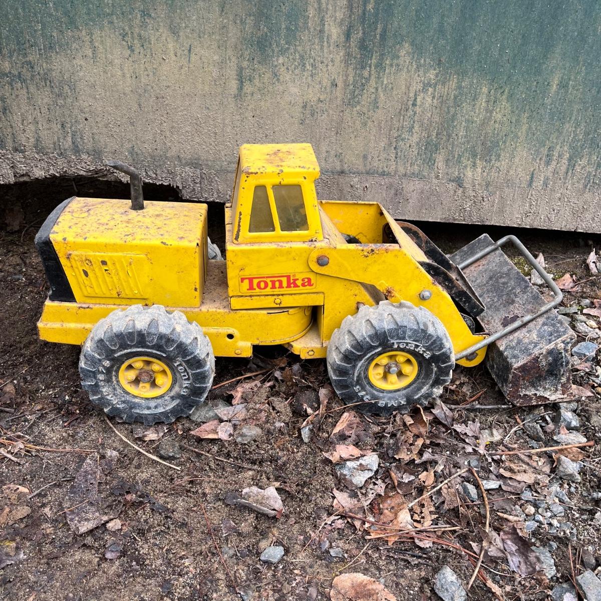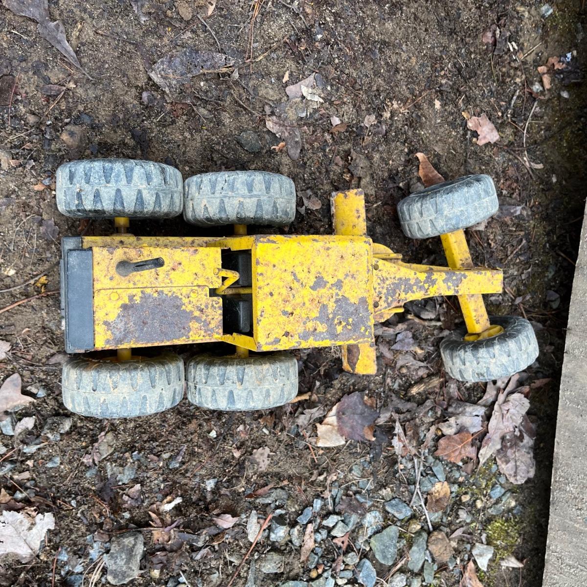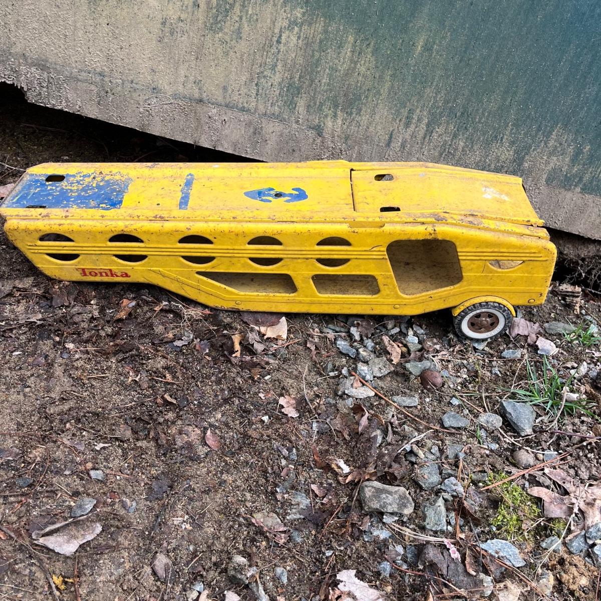 Lot includes a metal Tonka Grader, articulated bulldozer and a car trailer. The bulldozer measures 8.5” x 19” x 9”.