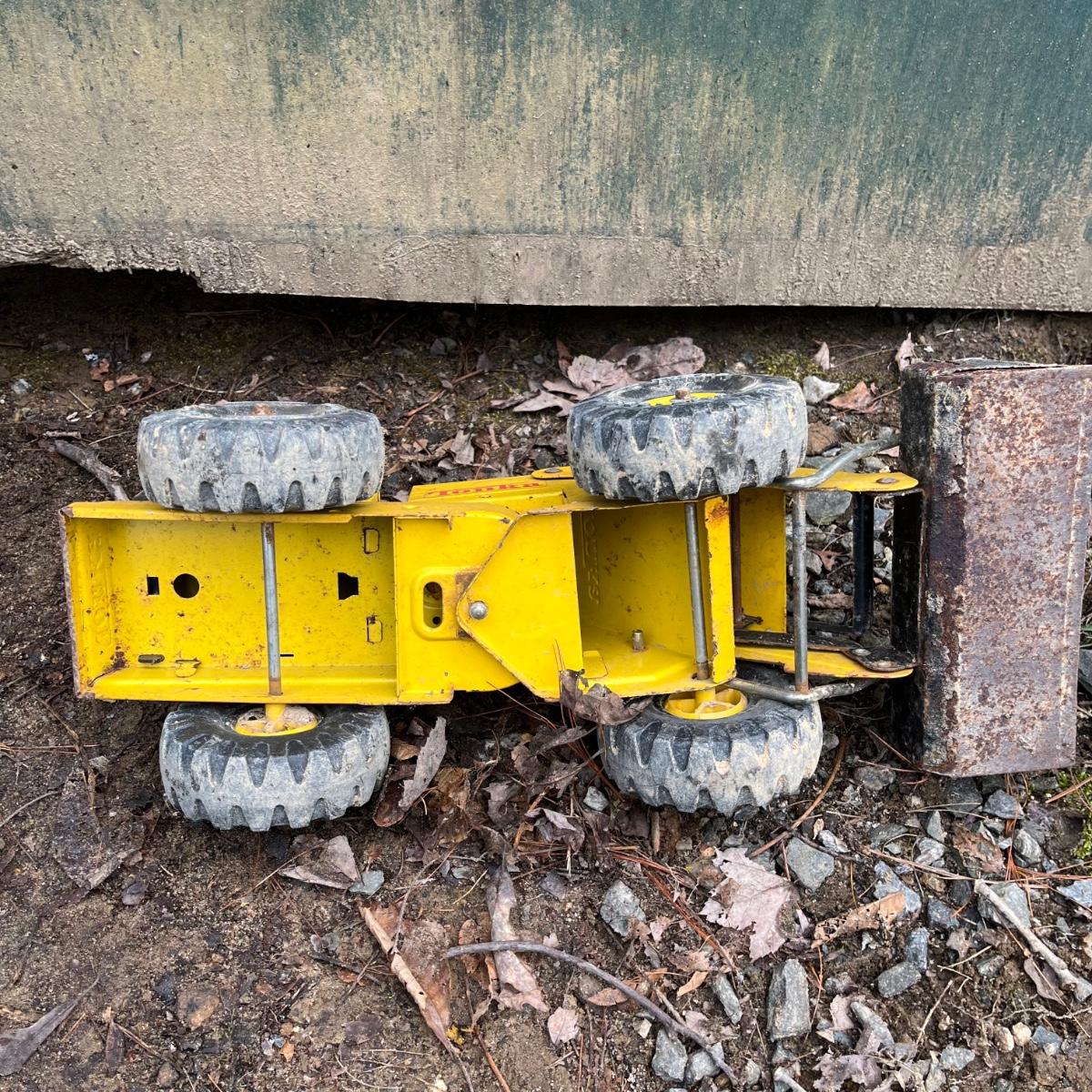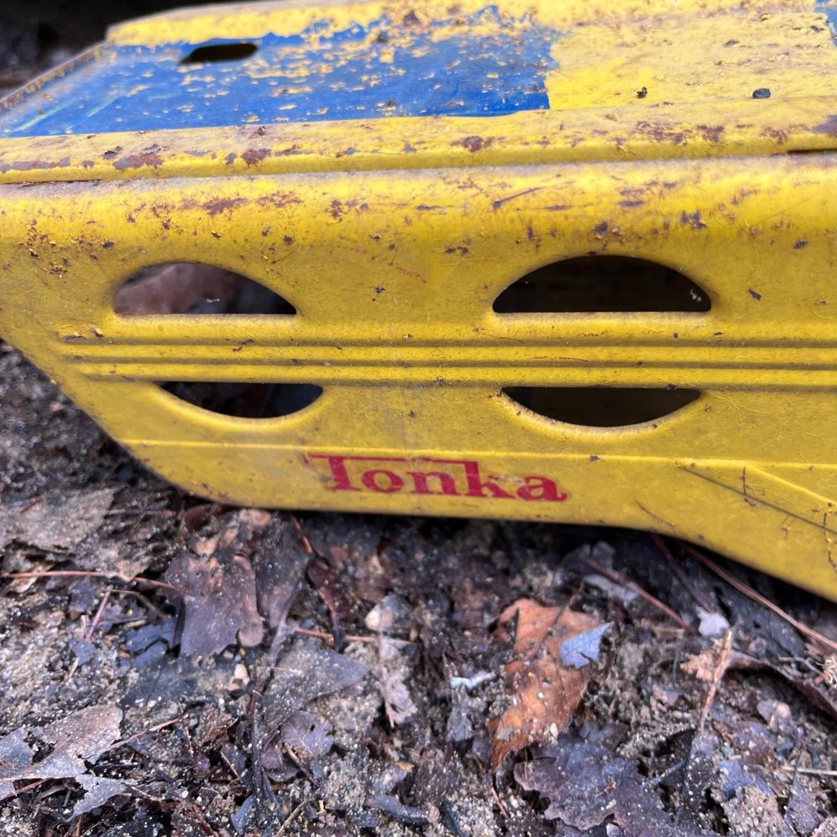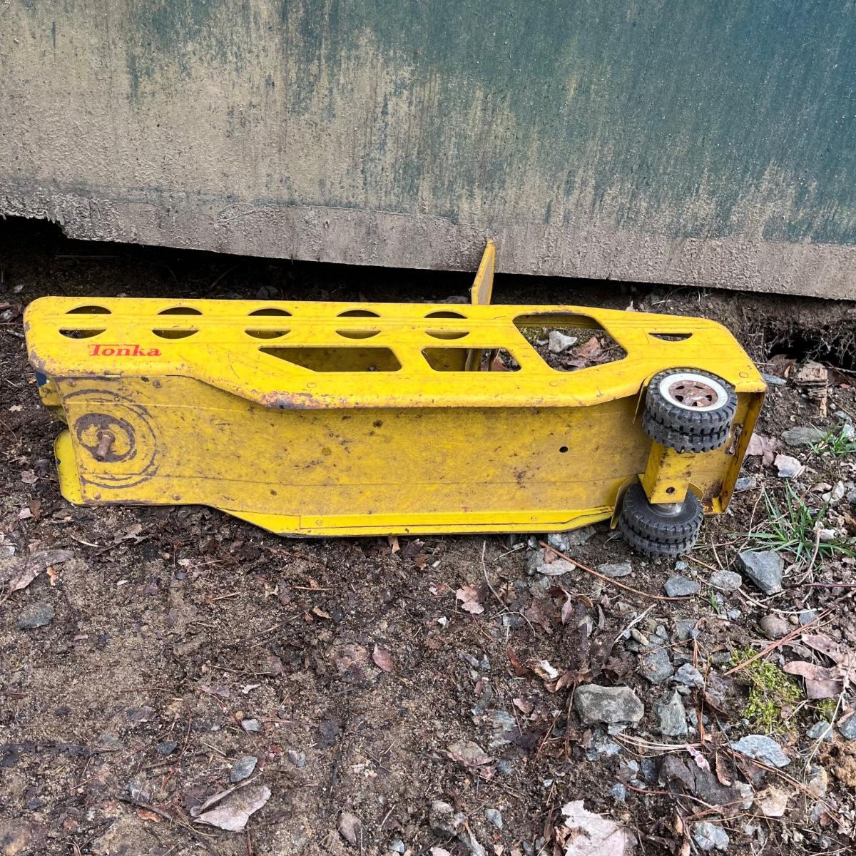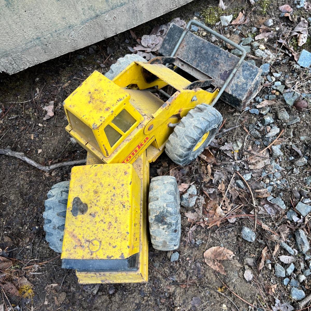 Lot includes a metal Tonka Grader, articulated bulldozer and a car trailer. The bulldozer measures 8.5” x 19” x 9”.