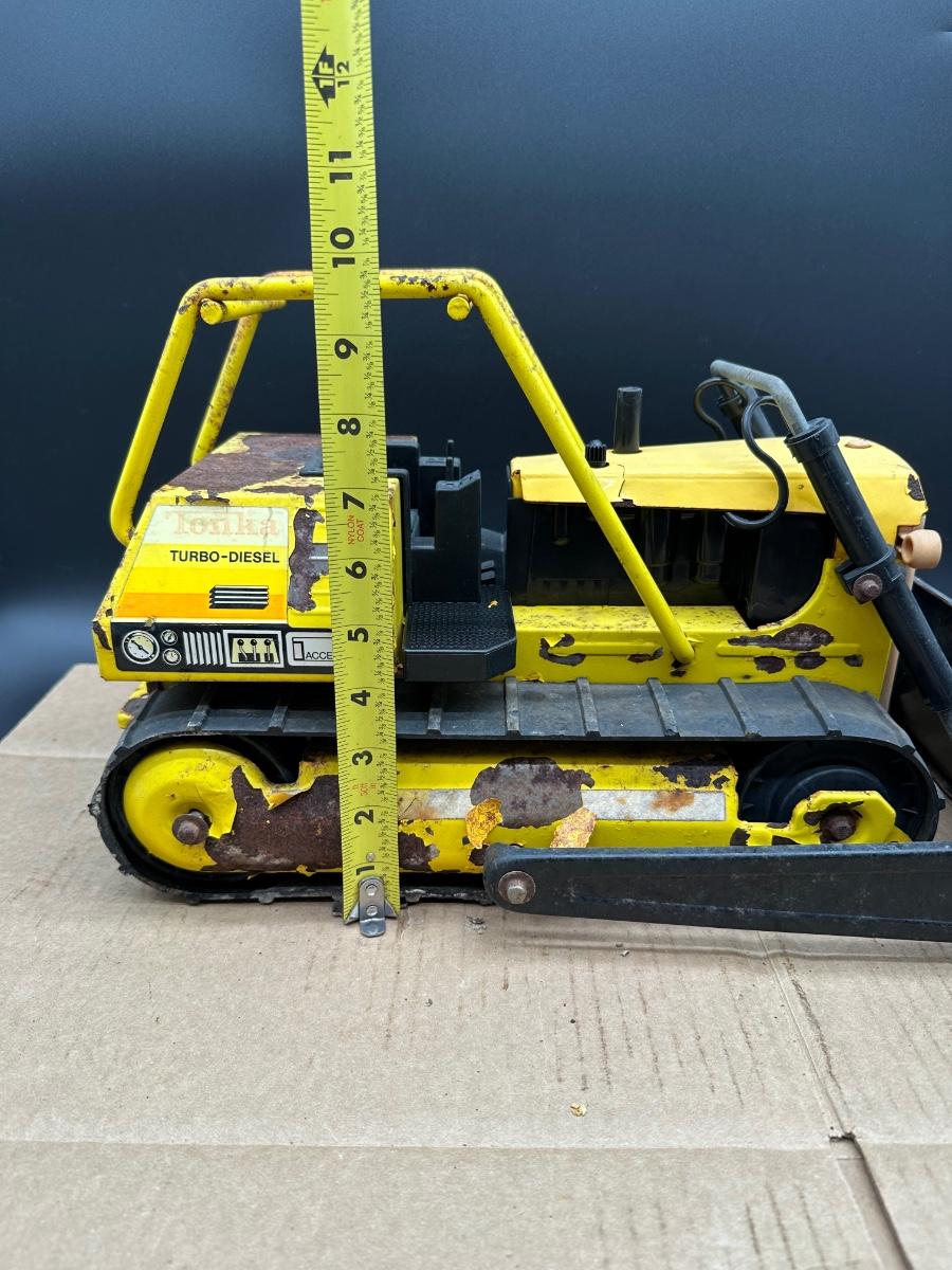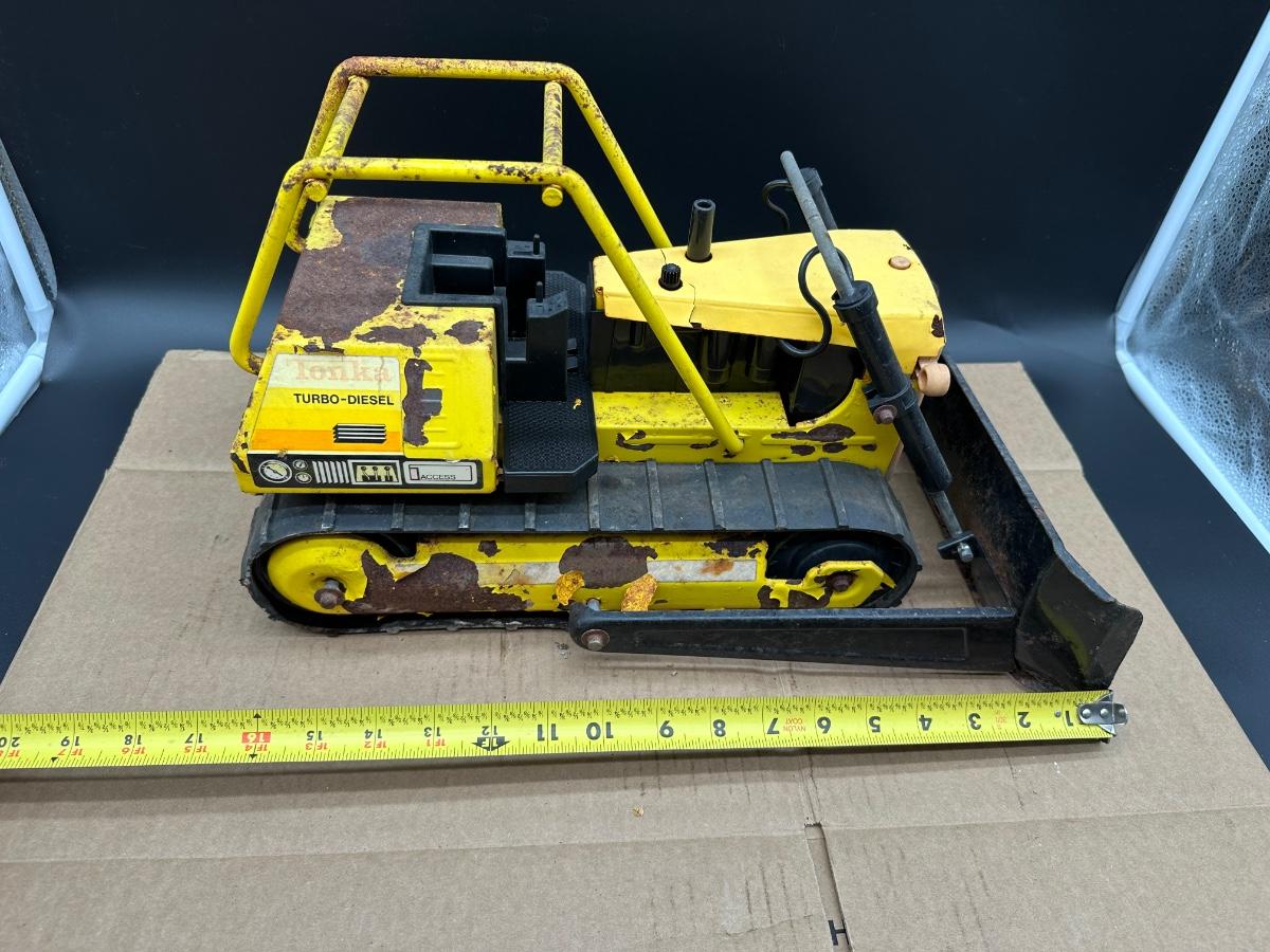 Up for sale is a vintage Tonka Turbo-Diesel crawler bulldozer, a classic 1970s pressed steel construction toy built to last.