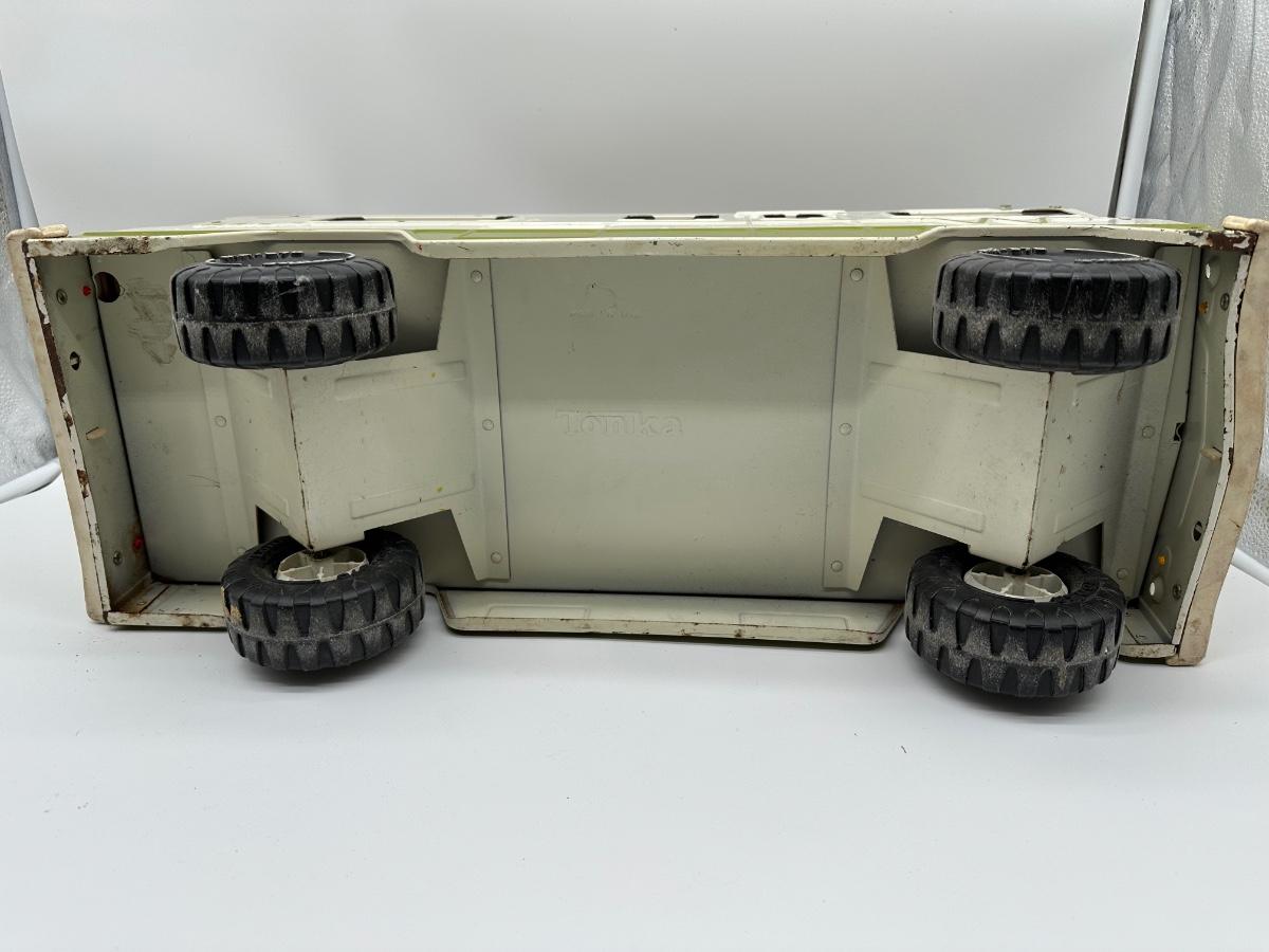 Original vintage Tonka Winnebago Indian camper toy featuring the classic cream and green color scheme. Includes opening roof with interior detail, original wheels and tires, and figures inside. Shows honest wear, scuffs, and paint loss consistent with age.