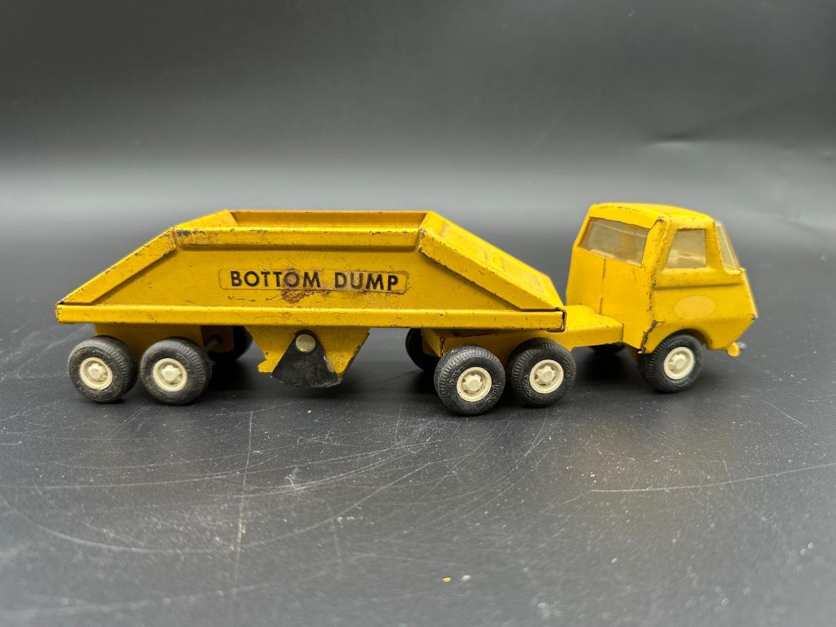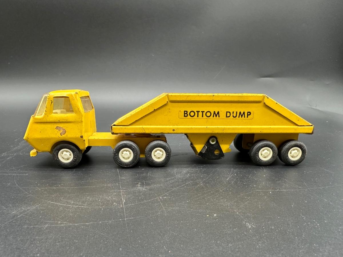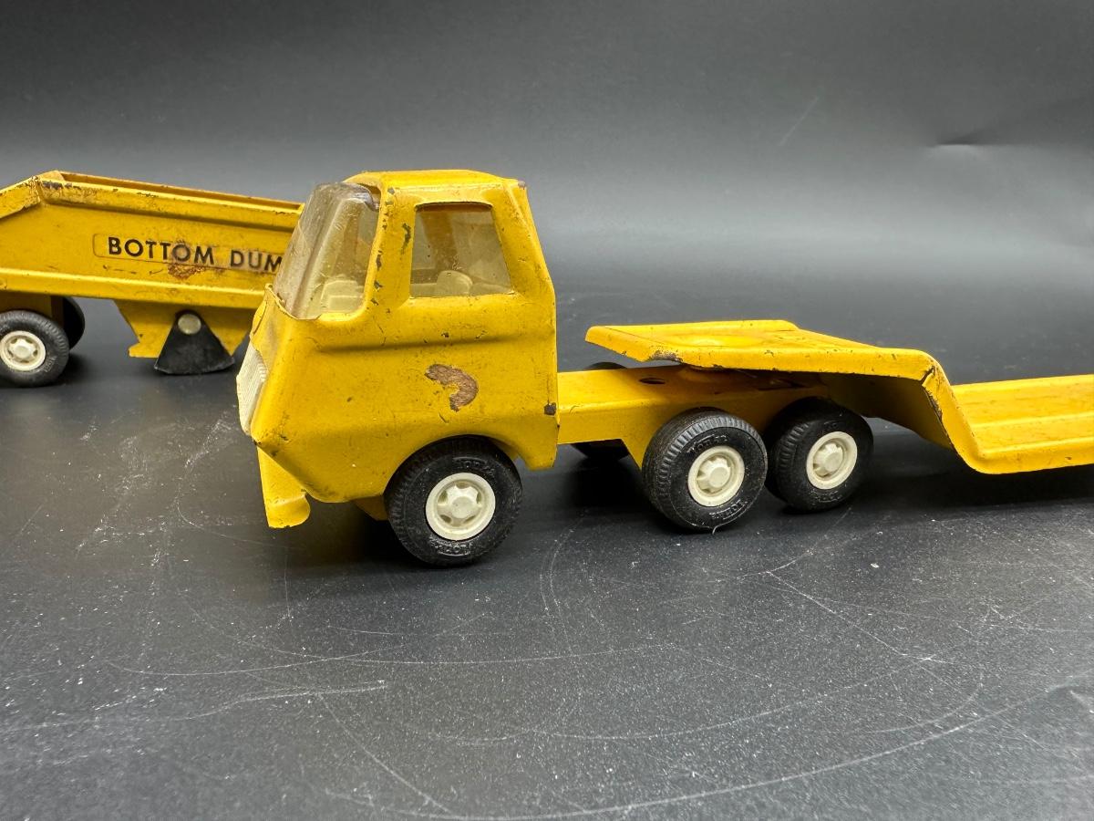 Vintage Tonka pressed steel truck and trailer set in classic construction yellow. Includes cab with lowboy trailer and separate “Bottom Dump” trailer.