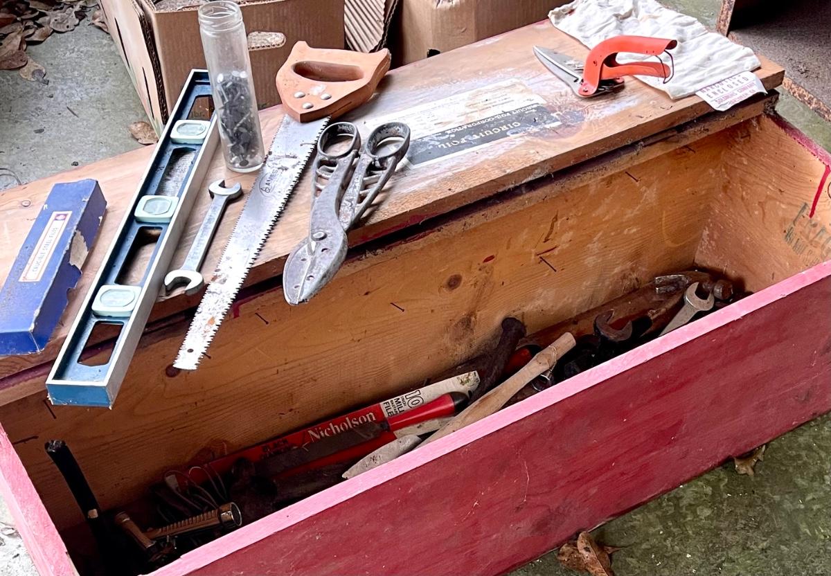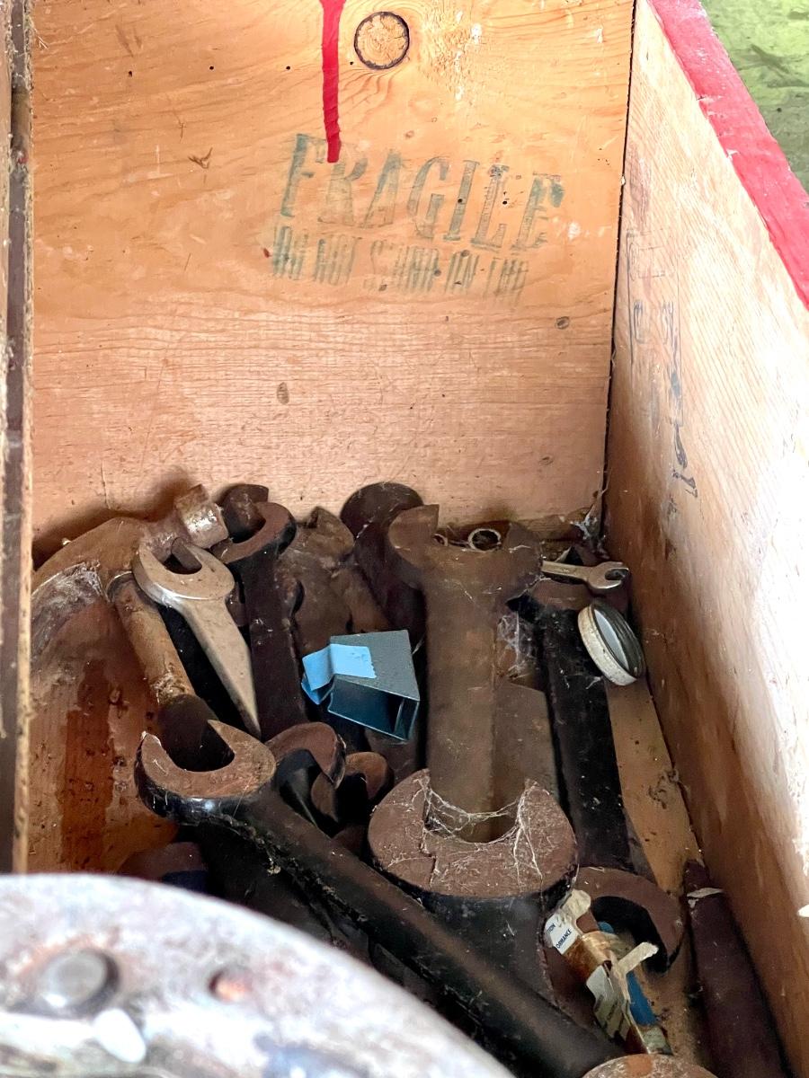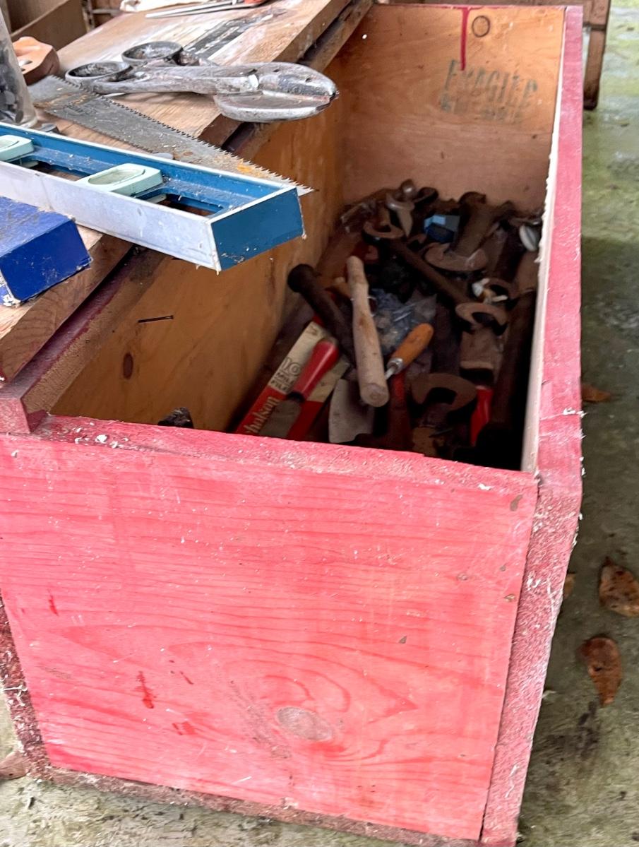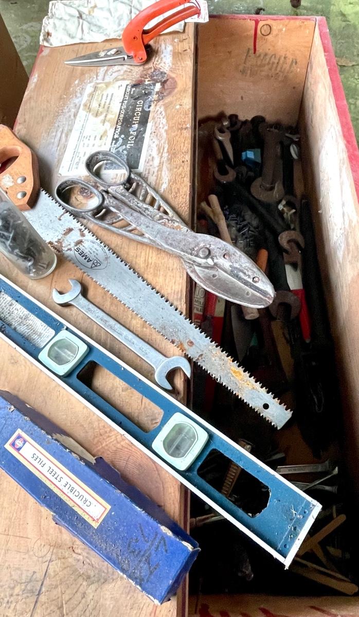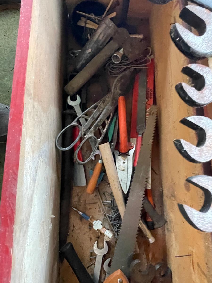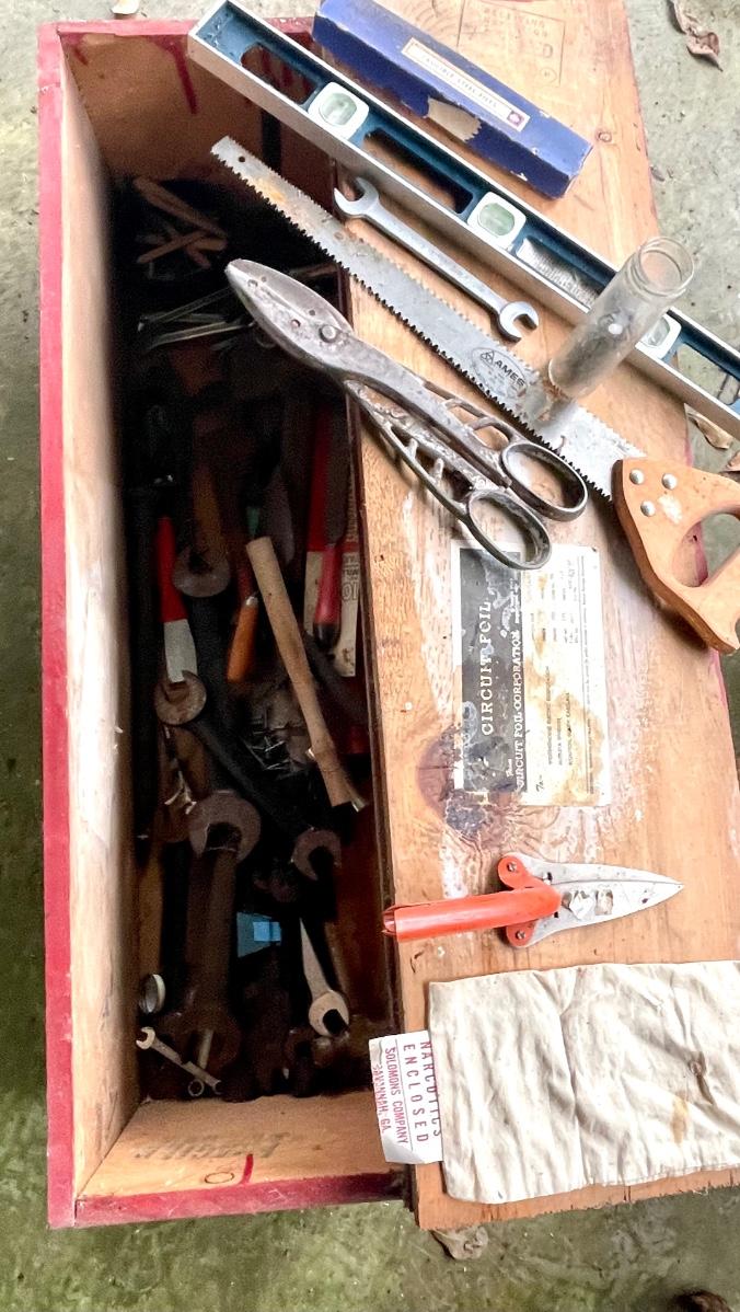 Vintage tool box with tools. Lots to see. Please check all pictures. Some nice old wrenches made in USA.