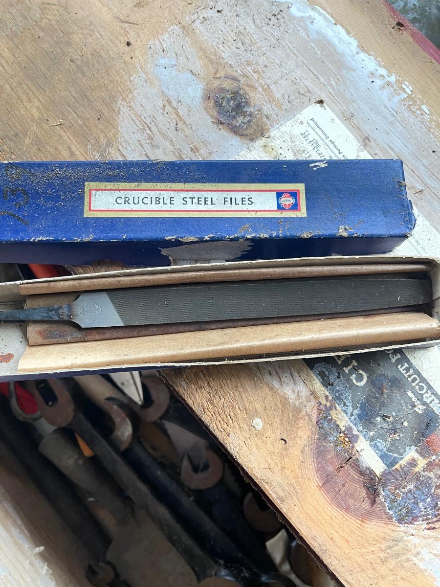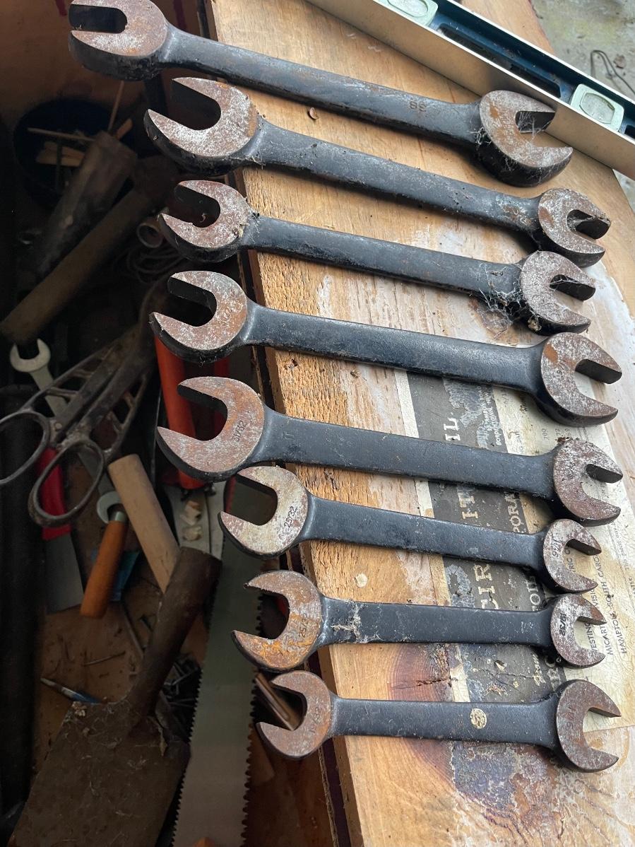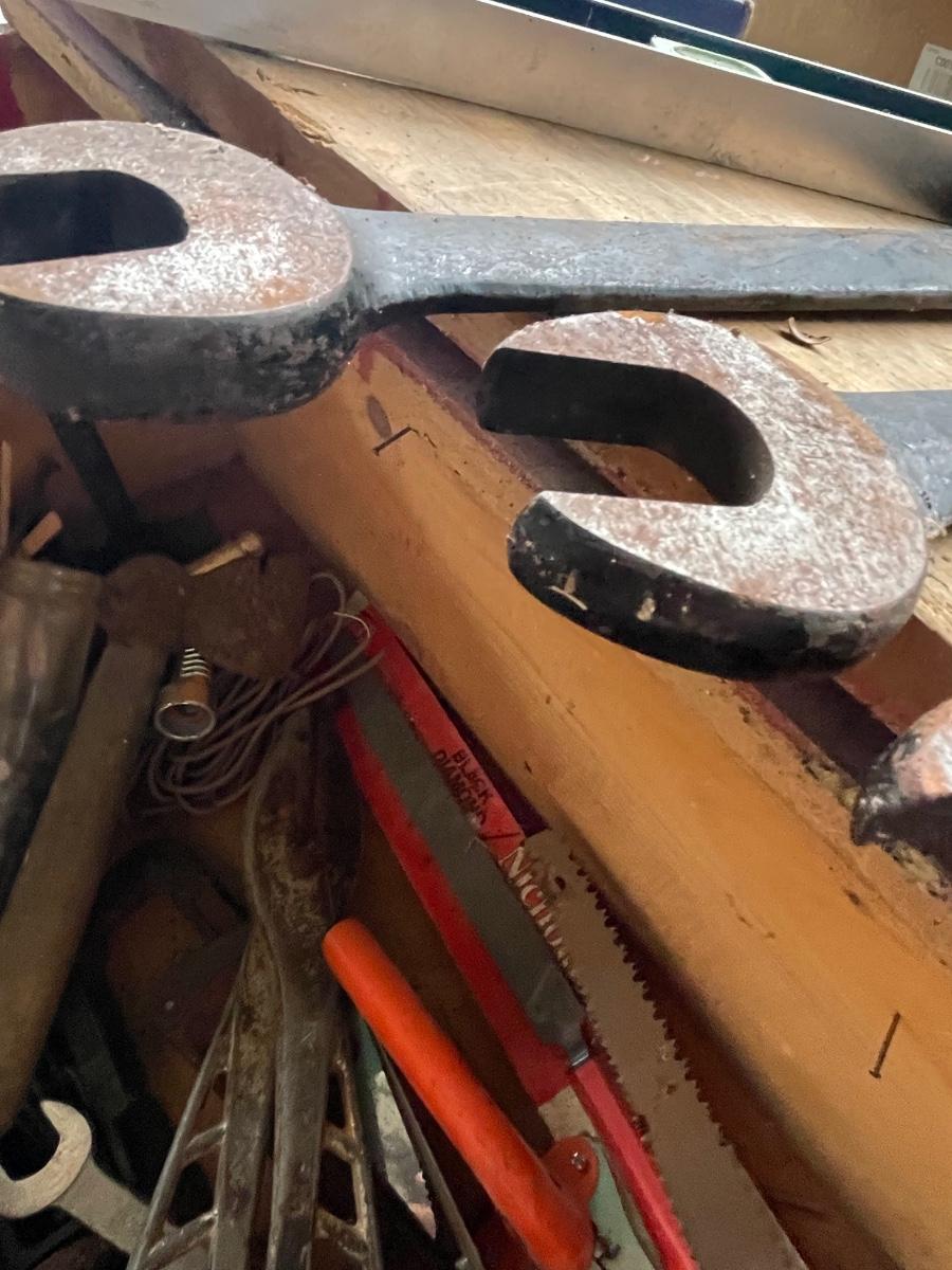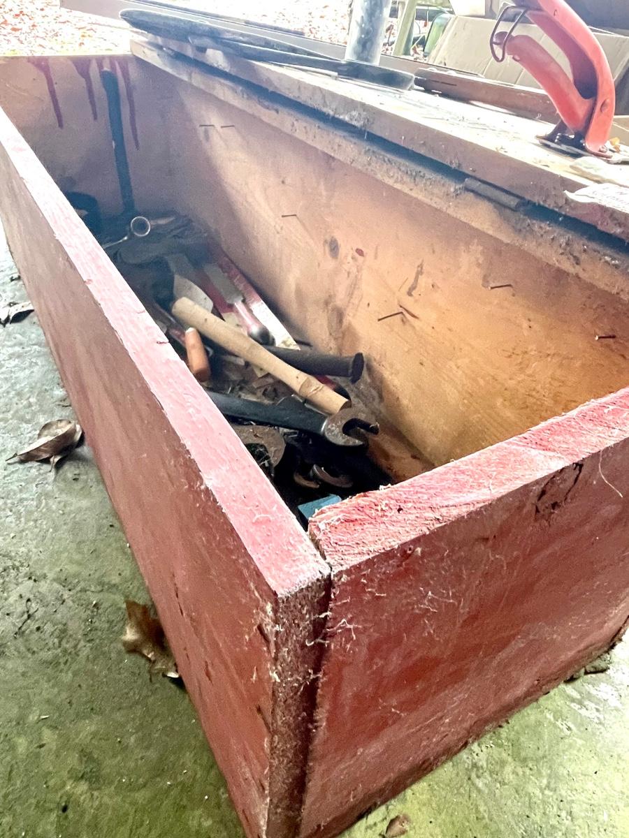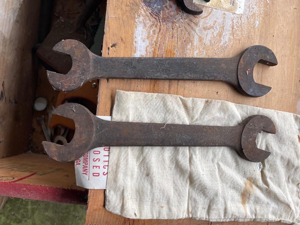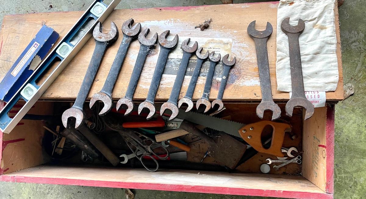 Vintage tool box with tools. Lots to see. Please check all pictures. Some nice old wrenches made in USA.