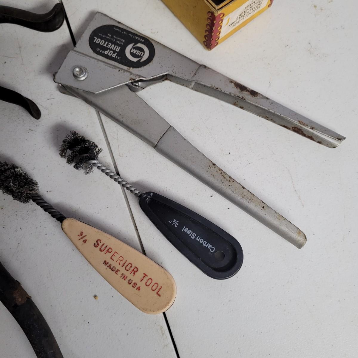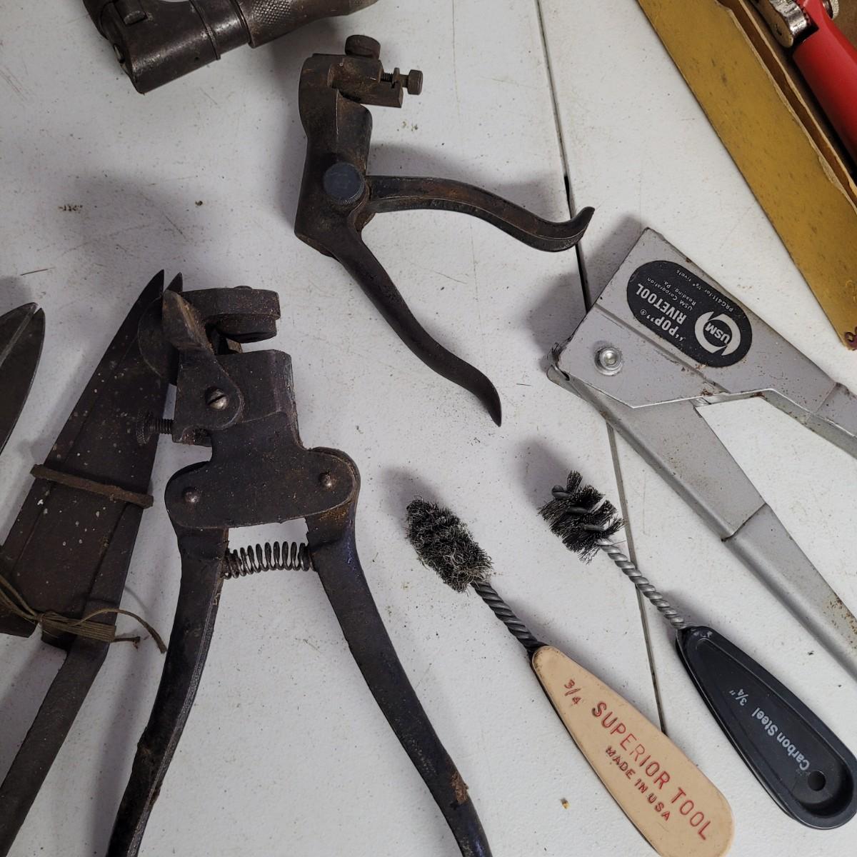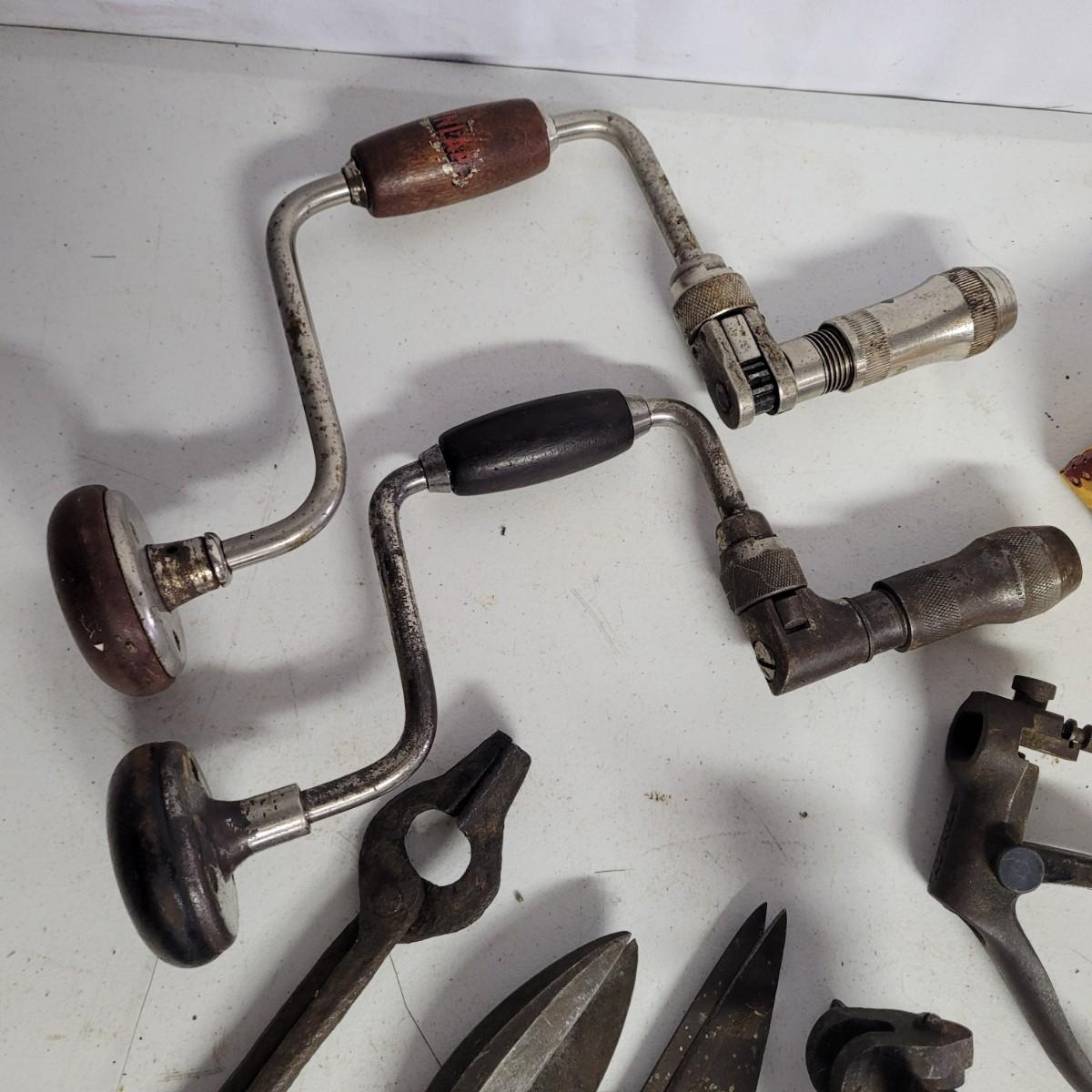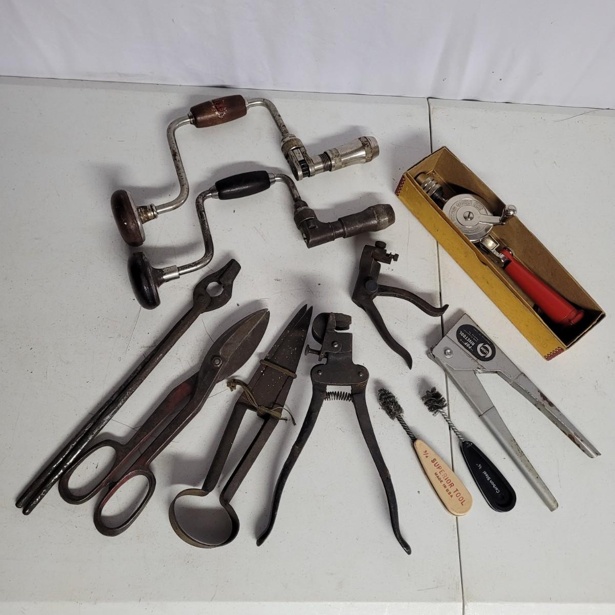 This lot includes a variety of vintage tools. Items include hand drills, tongs, shears, snips, brushes, hole punches, and pop rivet tool. The tongs measure 14.5" in length and the brushes measure 7" in length. These items are in varying conditions and from various timeframes. Several drill bits included to complement the brace and bit handles. See photos for more details on each individual item.