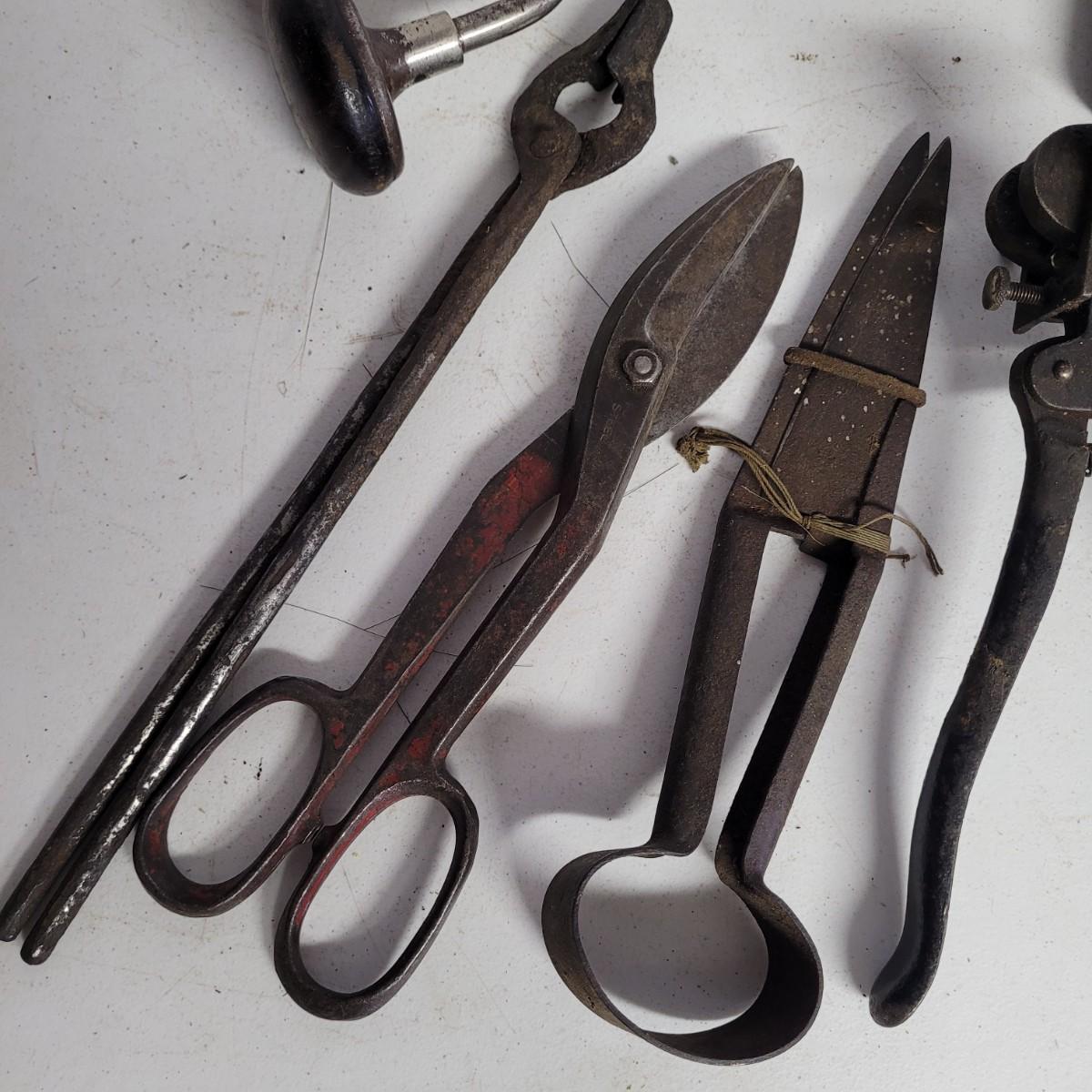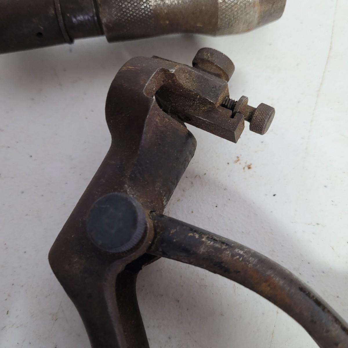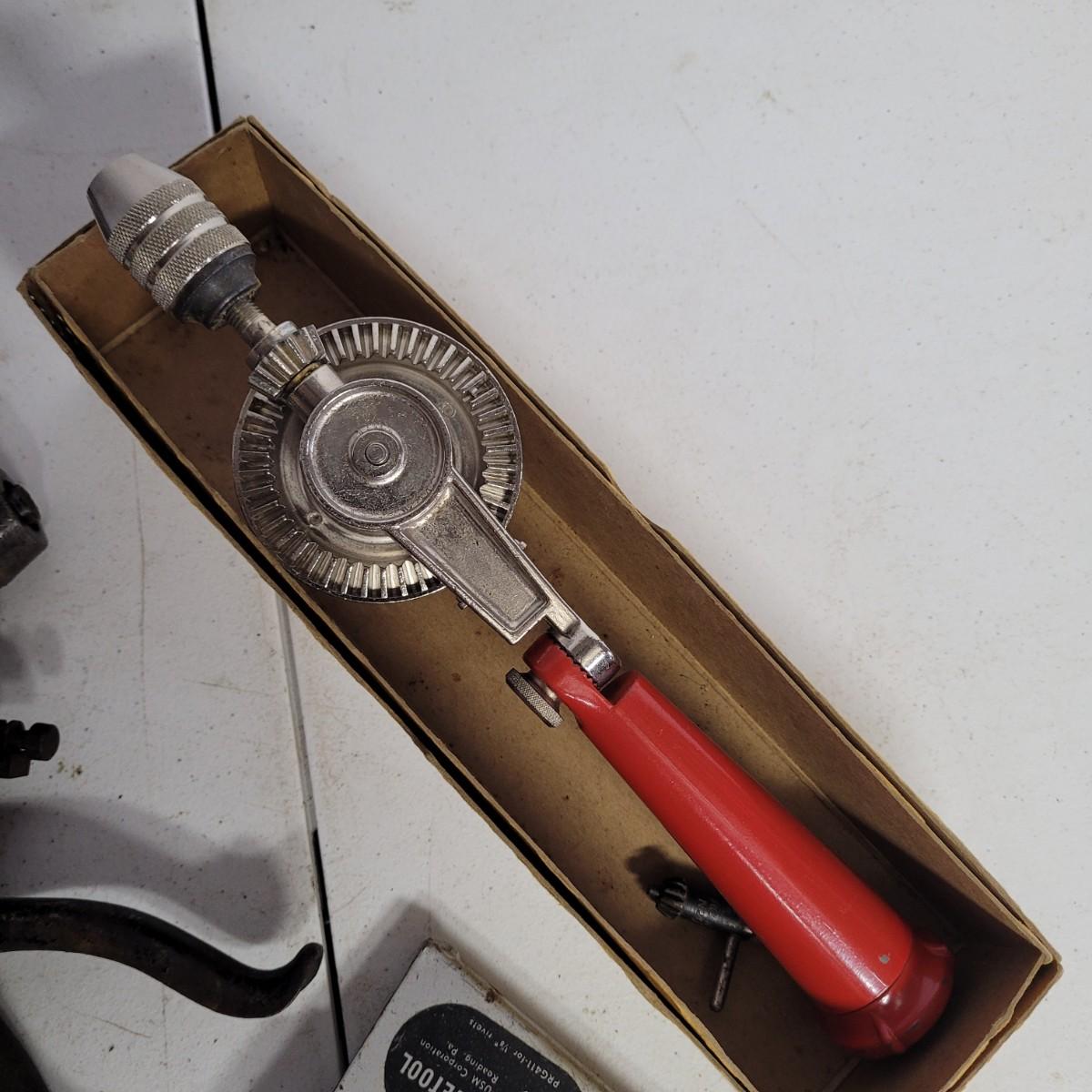 This lot includes a variety of vintage tools. Items include hand drills, tongs, shears, snips, brushes, hole punches, and pop rivet tool. The tongs measure 14.5" in length and the brushes measure 7" in length. These items are in varying conditions and from various timeframes. Several drill bits included to complement the brace and bit handles. See photos for more details on each individual item.