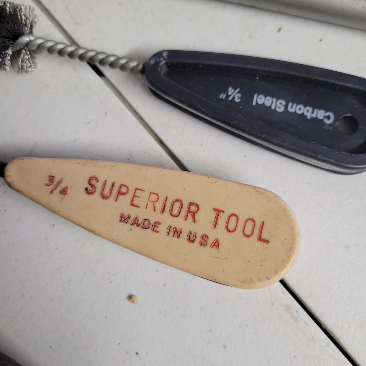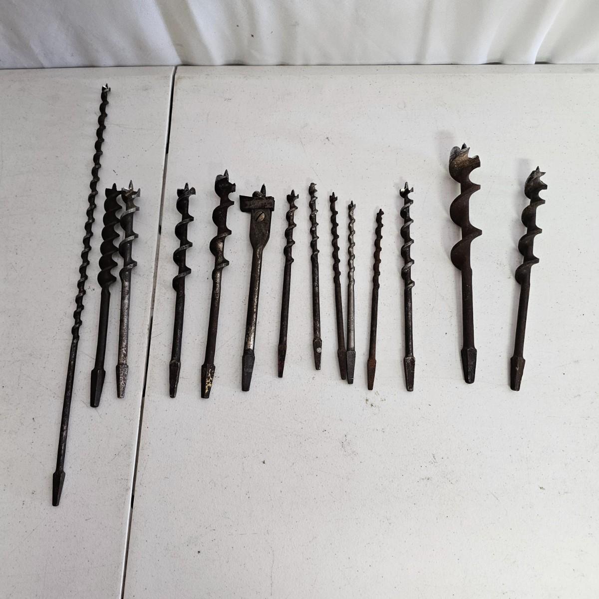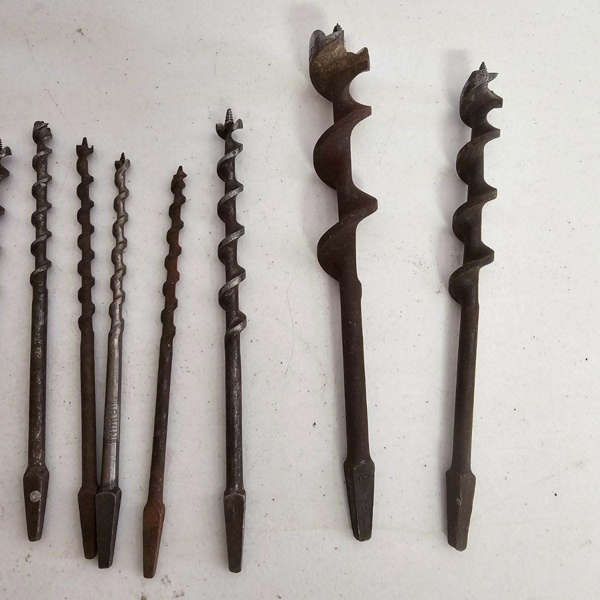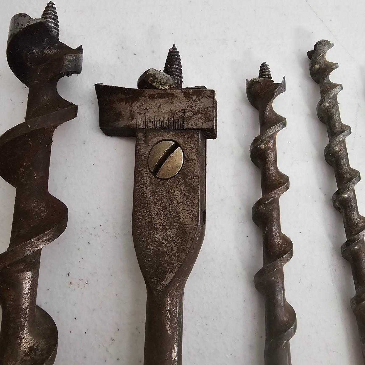 This lot includes a variety of vintage tools. Items include hand drills, tongs, shears, snips, brushes, hole punches, and pop rivet tool. The tongs measure 14.5" in length and the brushes measure 7" in length. These items are in varying conditions and from various timeframes. Several drill bits included to complement the brace and bit handles. See photos for more details on each individual item.