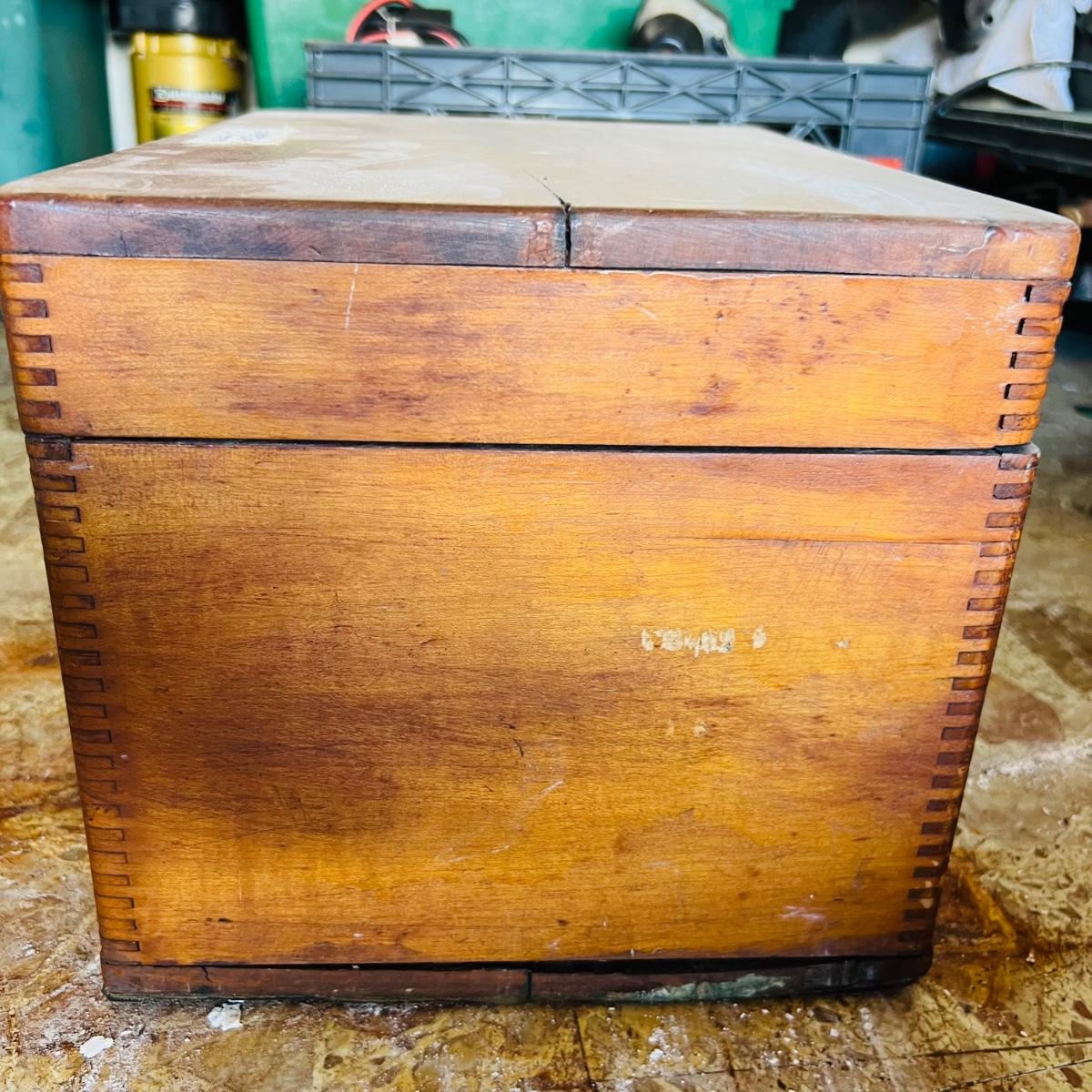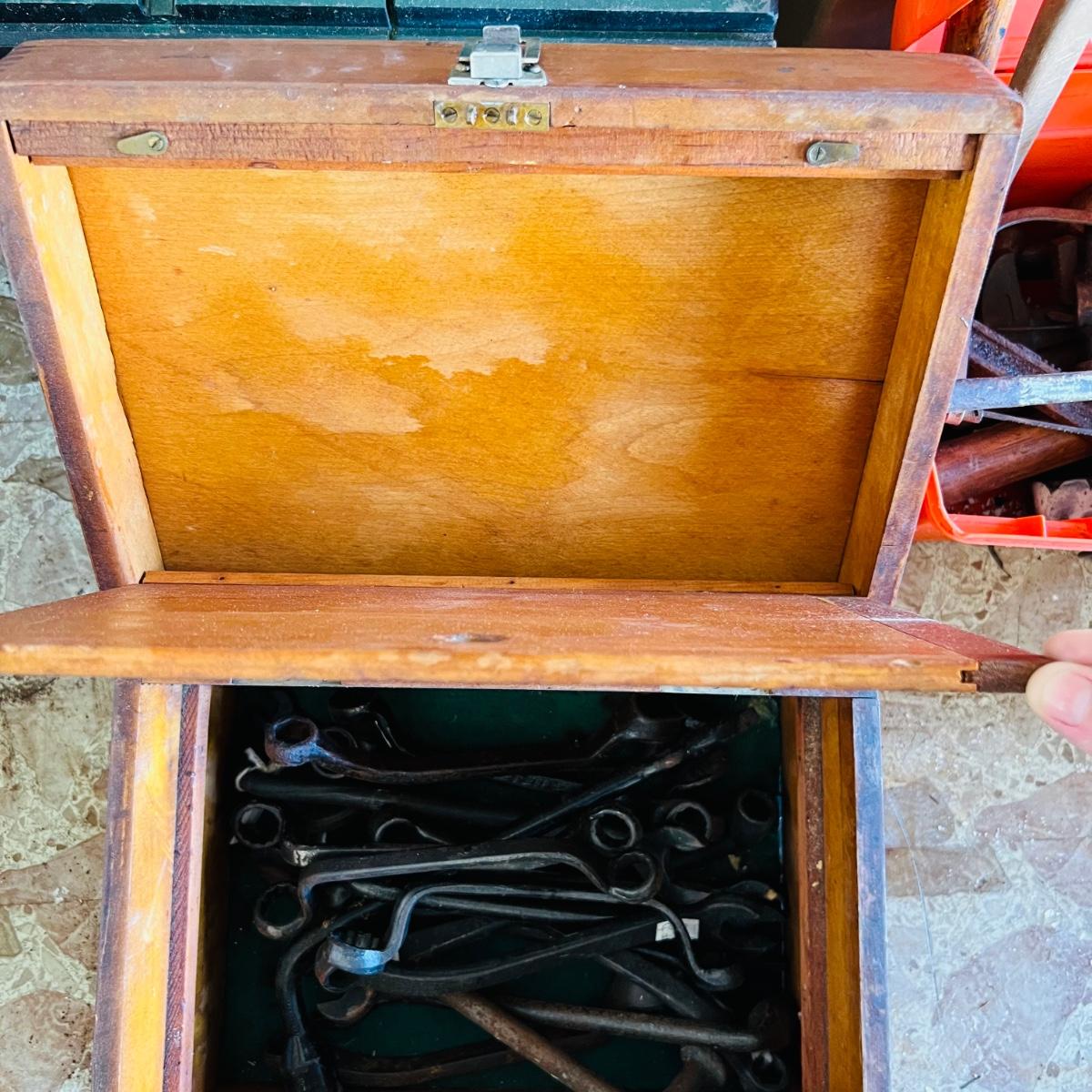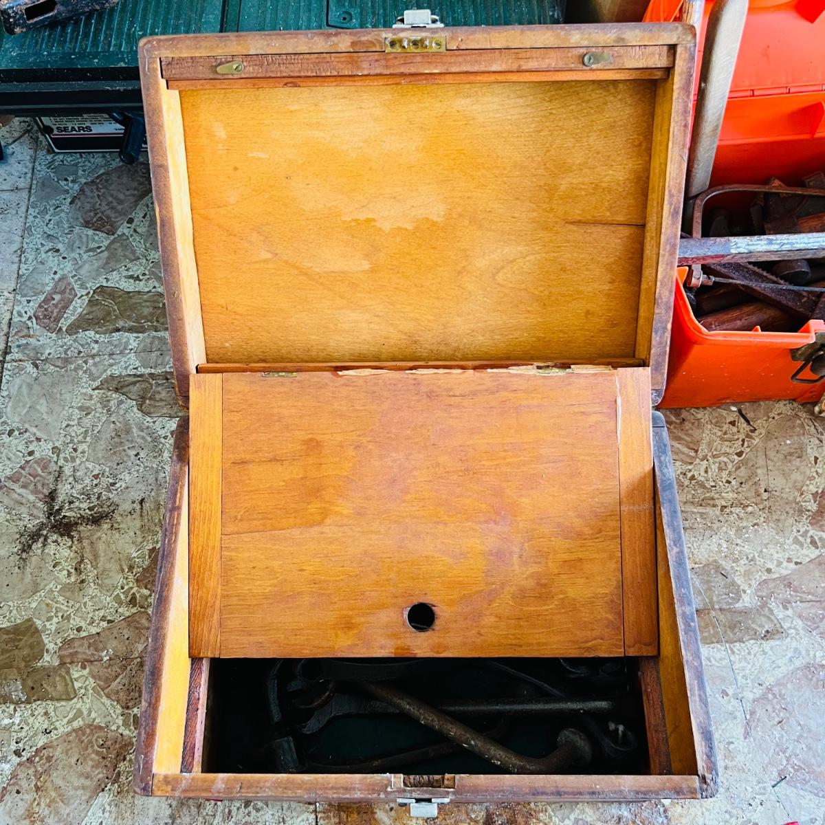 Cool l, detailed, wood tool box measures 14” x 10” x 9.5”H. Has nice Dove - tailed corners and hidden compartment in lid . Filled with Ford wrenches.