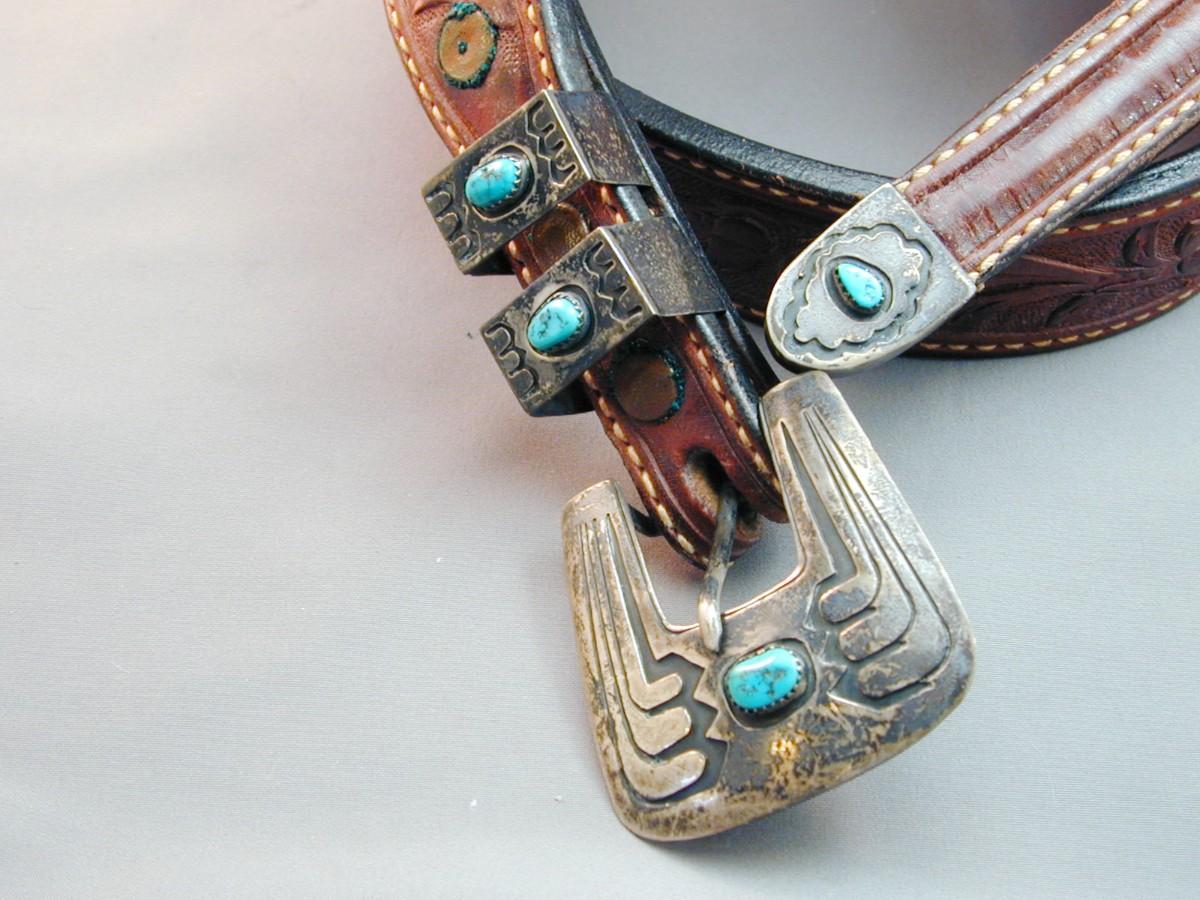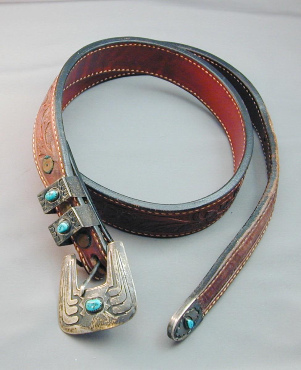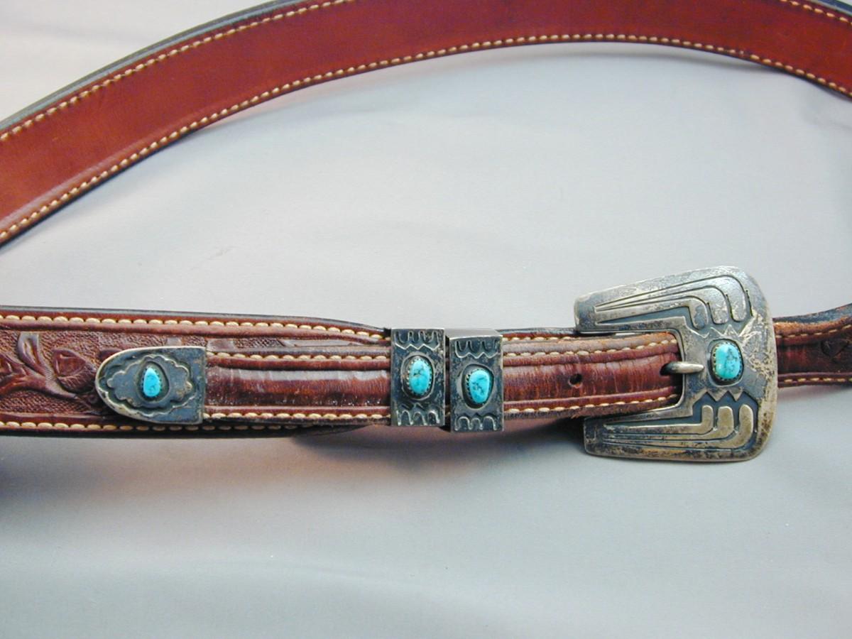 Vintage Tooled Leather Belt Sterling Turquoise Navajo Benson Sam 4 Piece Belt Buckle Lot 378