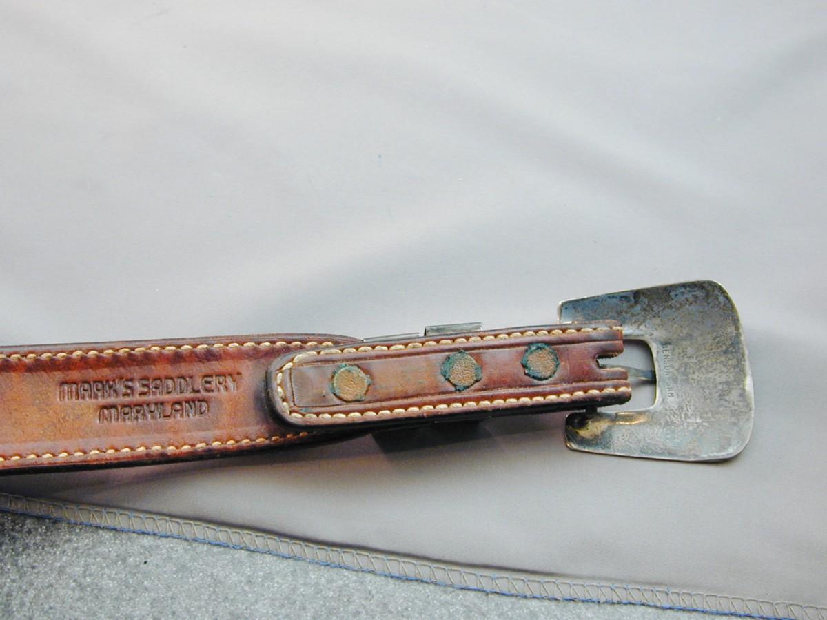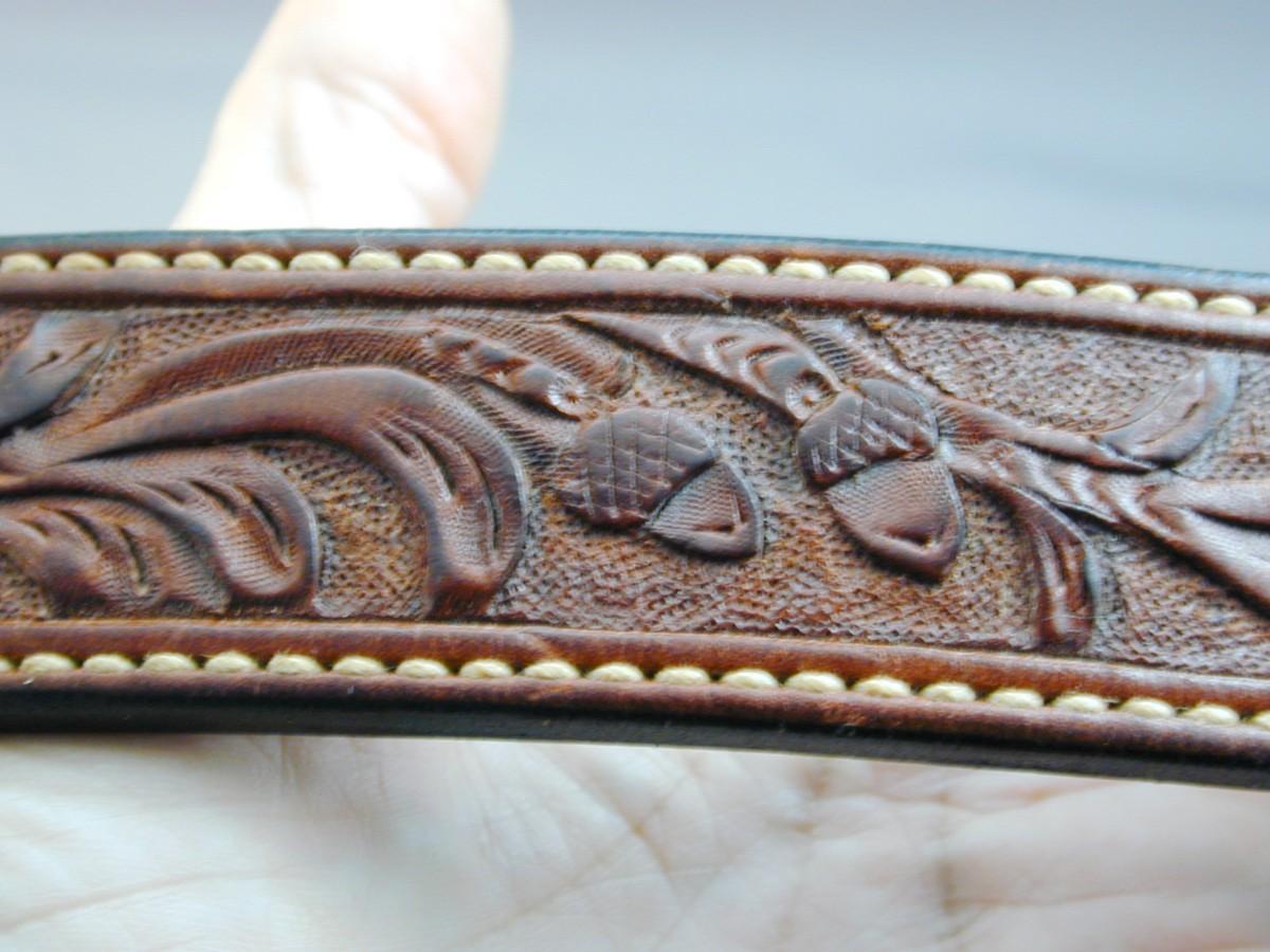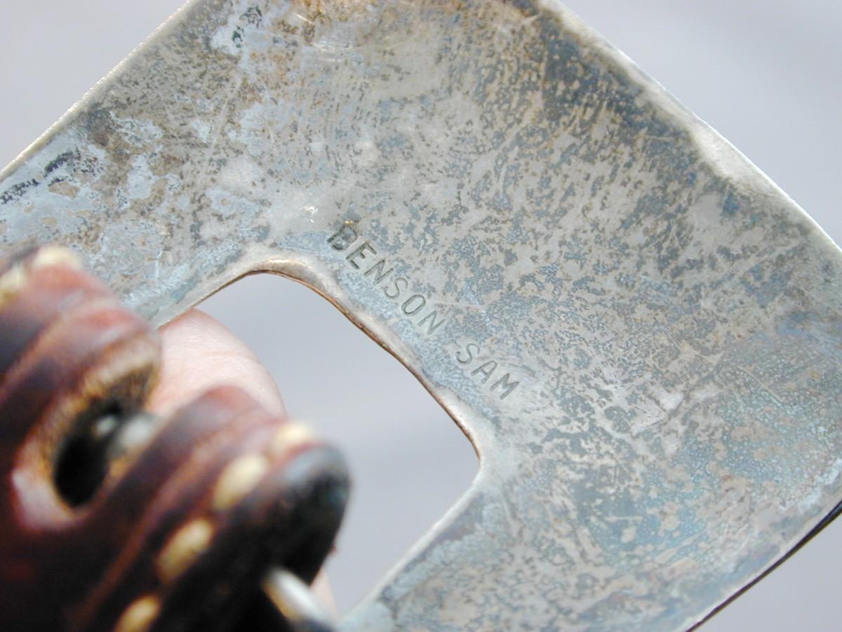 The tooled leather belt measures 40.5 inches long from end to end and is 1.25 inches wide at it's widest point. The belt shows minor wear from age and there is some green patina around the brass snaps. The buckle is signed by Navajo jewelry artisan Benson Sam and it is in great condition.