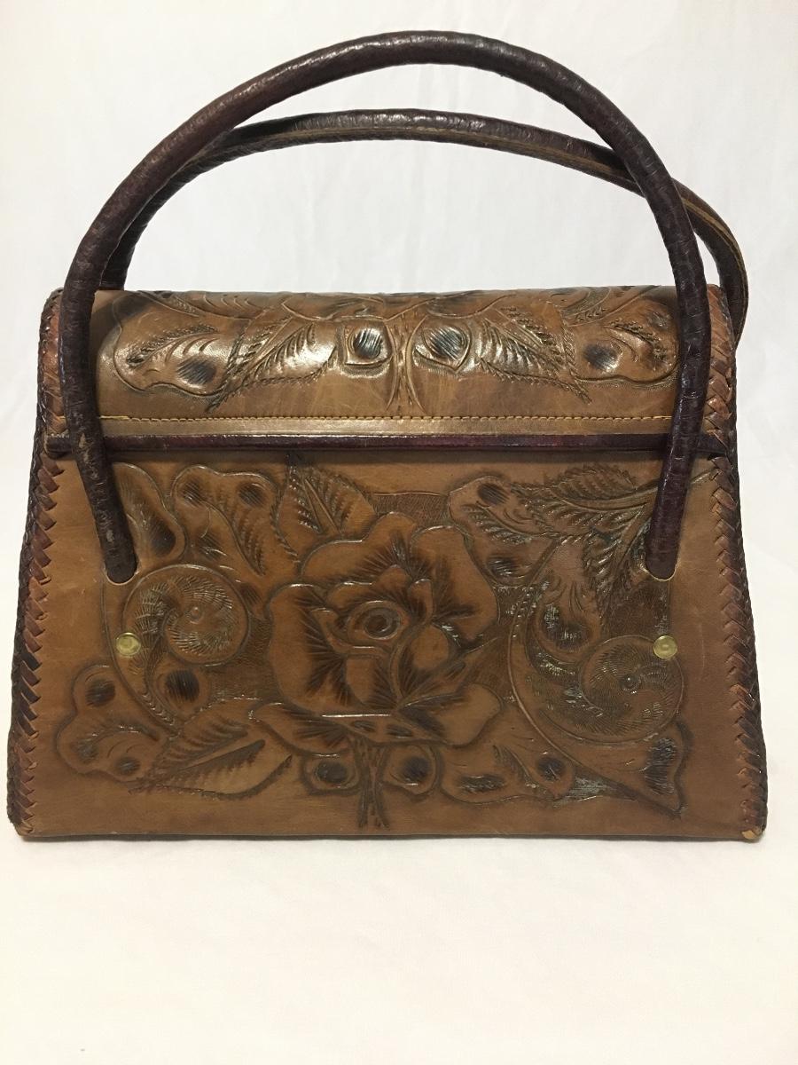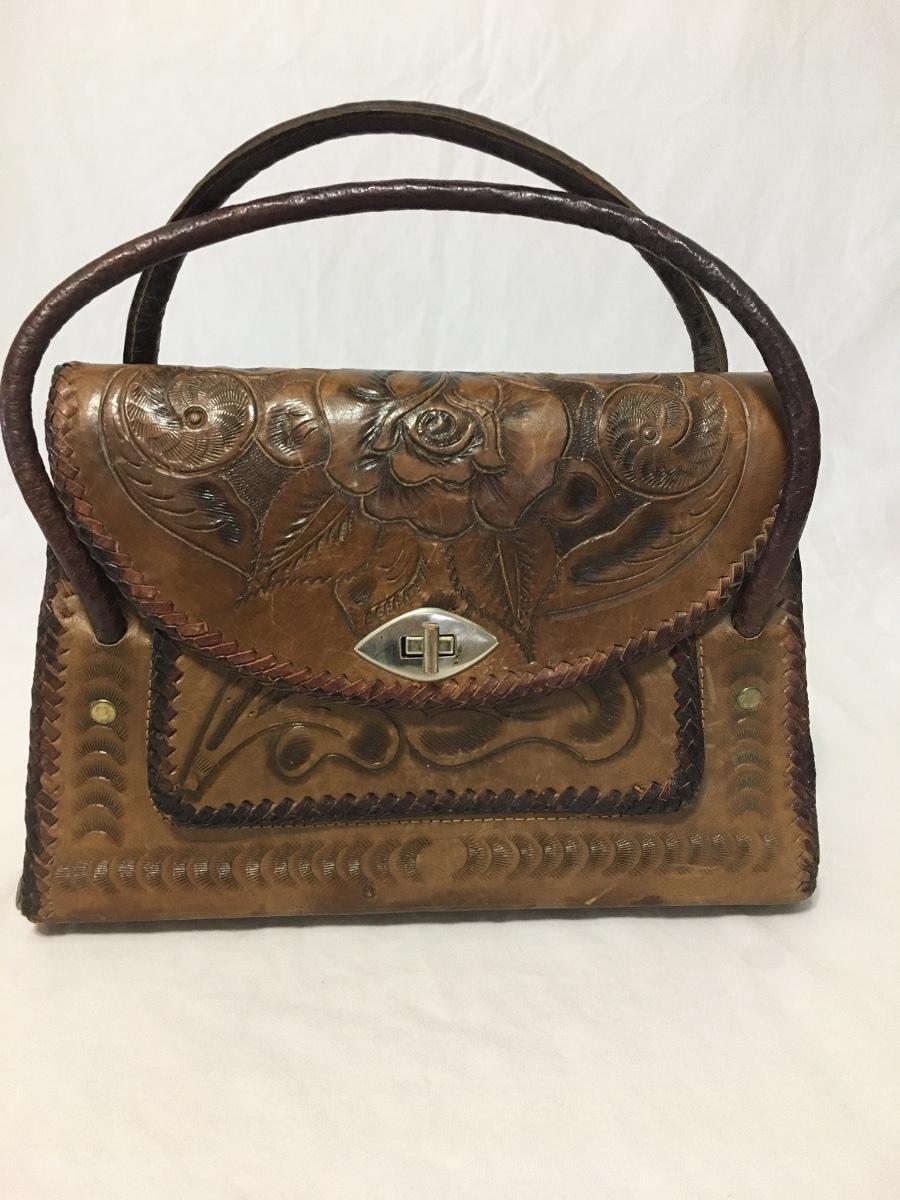 Vintage Tooled Leather Purse Hand Bag Brown Tan Floral Southwest