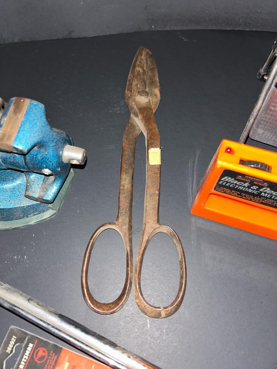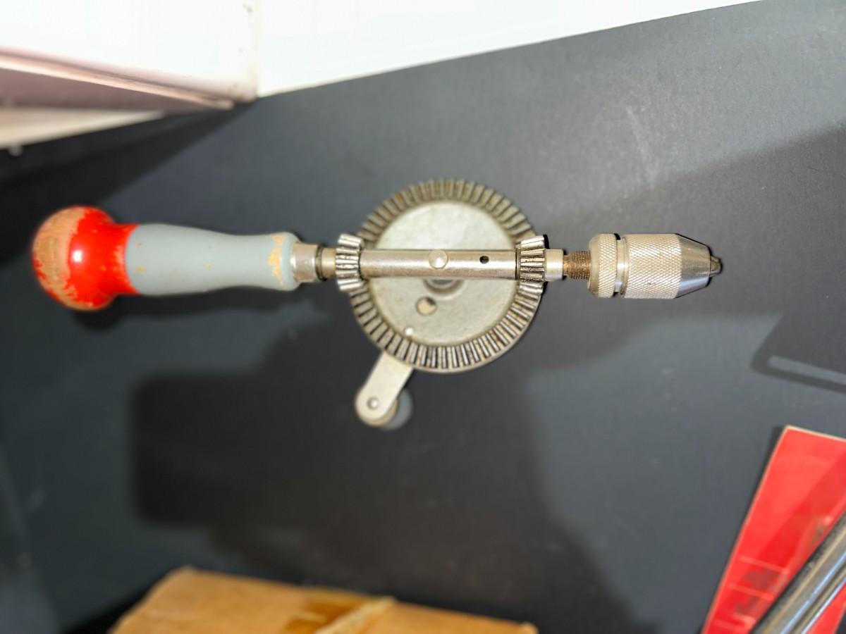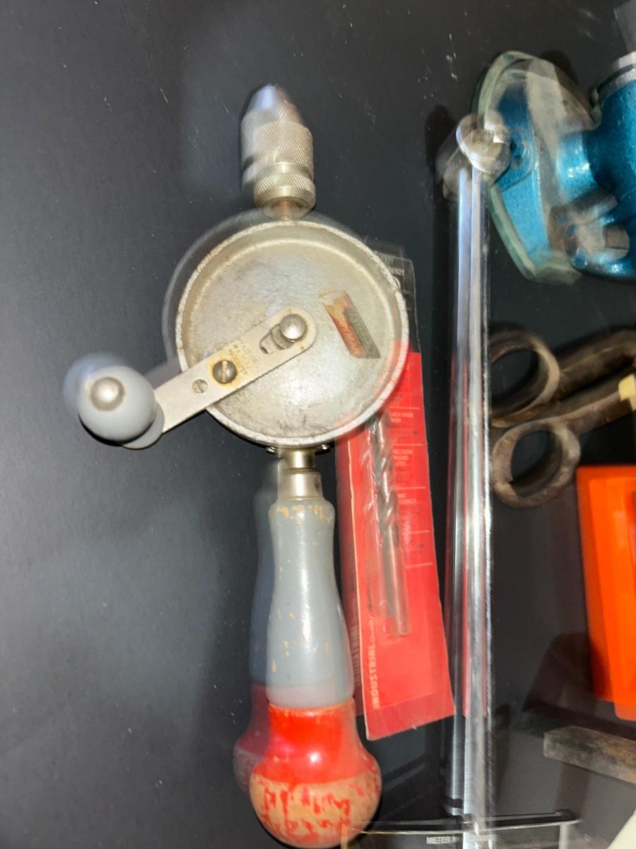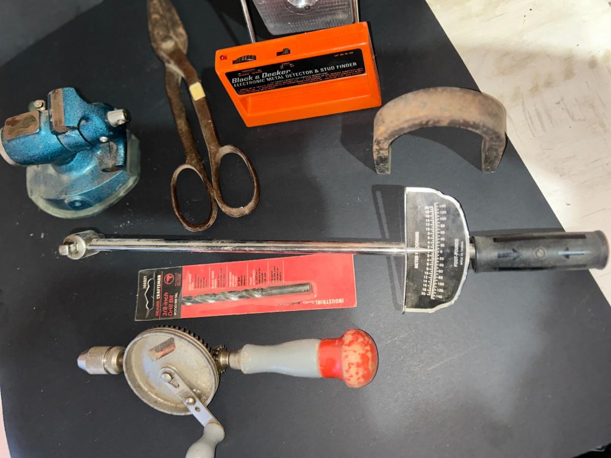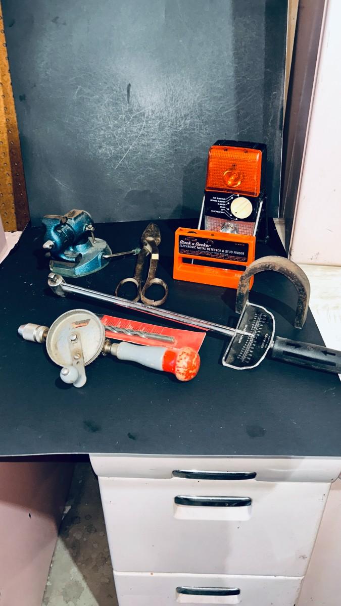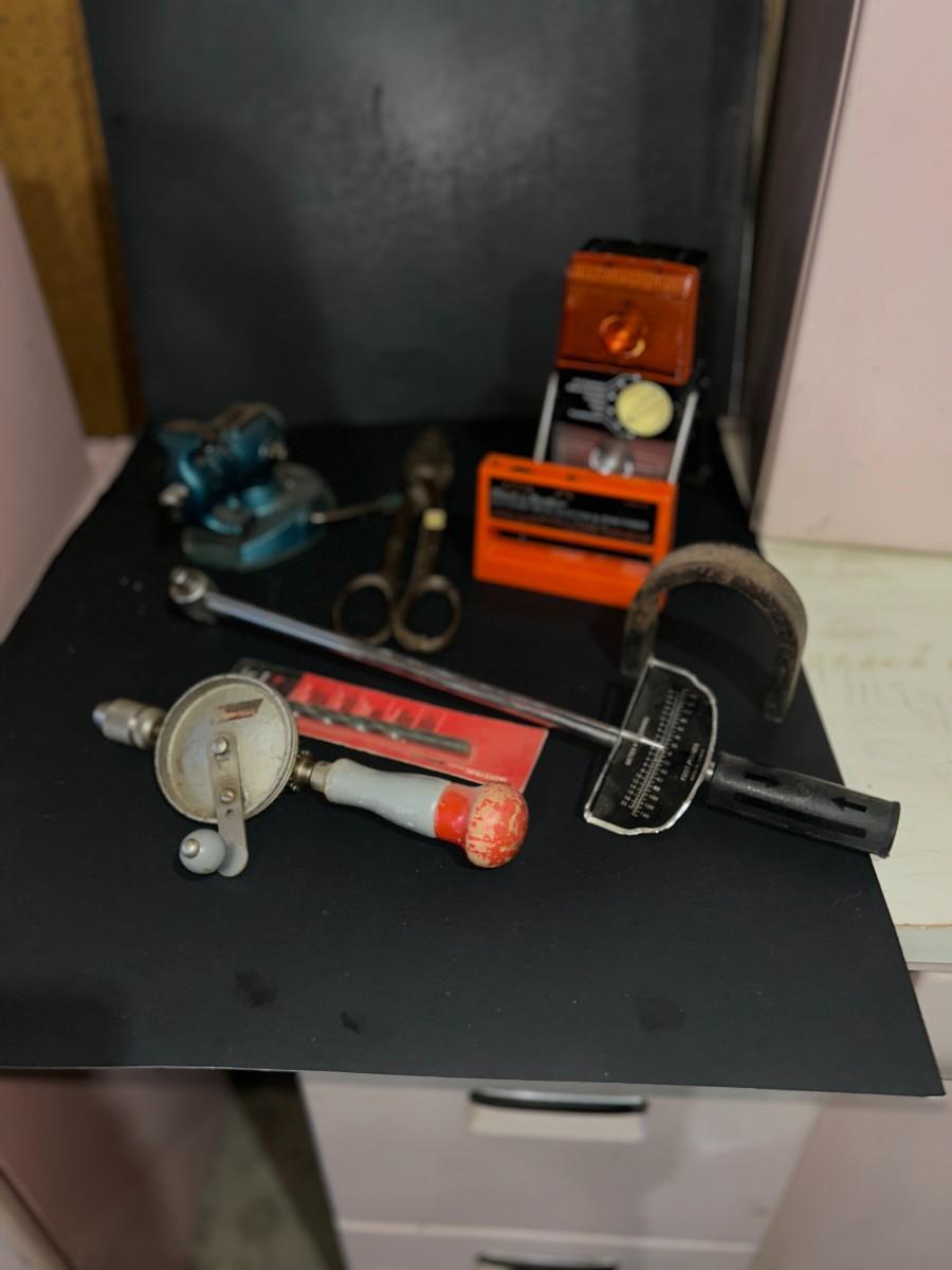 VINTAGE TOOLS, 1/4" TORQUE WRENCH, HAND DRILL., COUNTERTOP VISE AND MORE