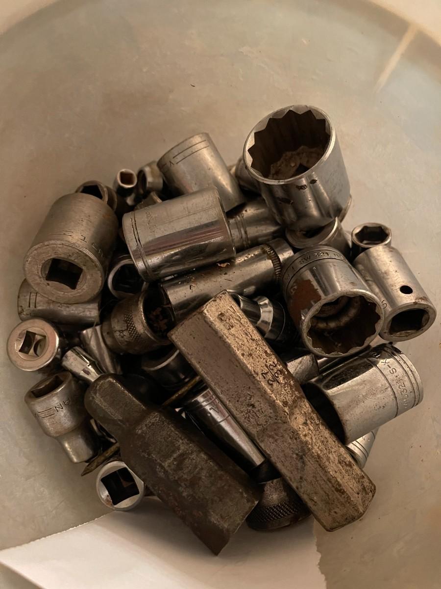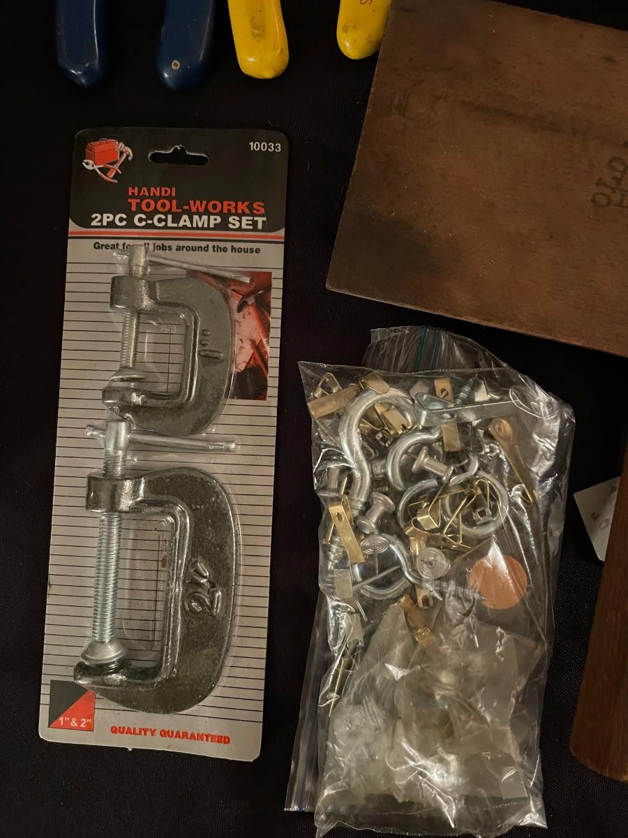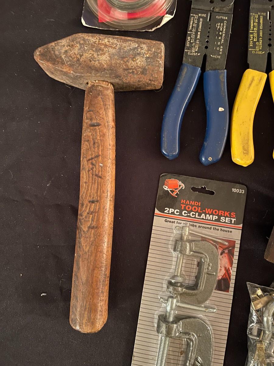 Huge misc. quality vintage tool lot - steelwire, clamps, hammer, 1890's old Whitmore No.8 wool, picture hangers, tub full of sockets, all sizes, dresser handles, (2) wire cutters, and more!