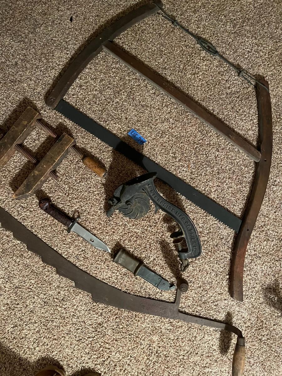 (5) Vintage Tools - "Enterprise MFG", (2) saws, (1) clamp, bayonet knife.