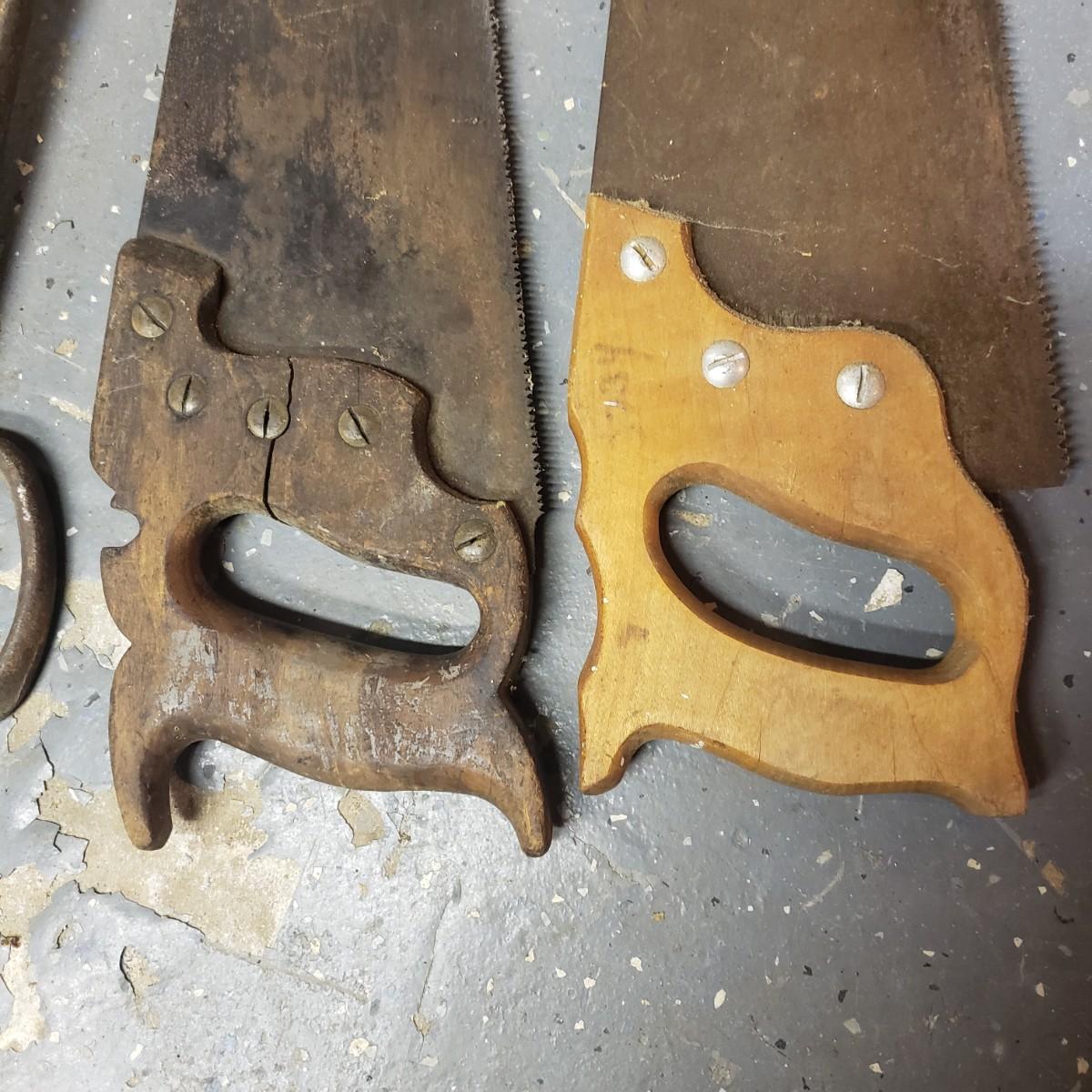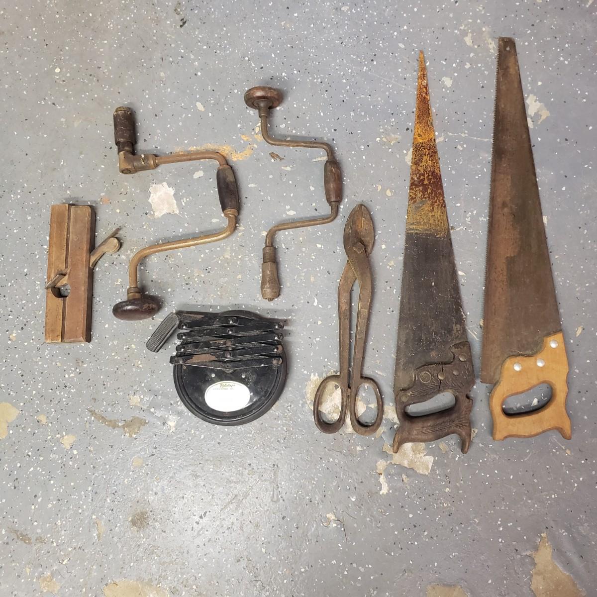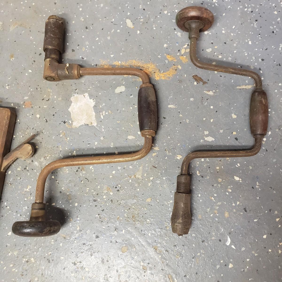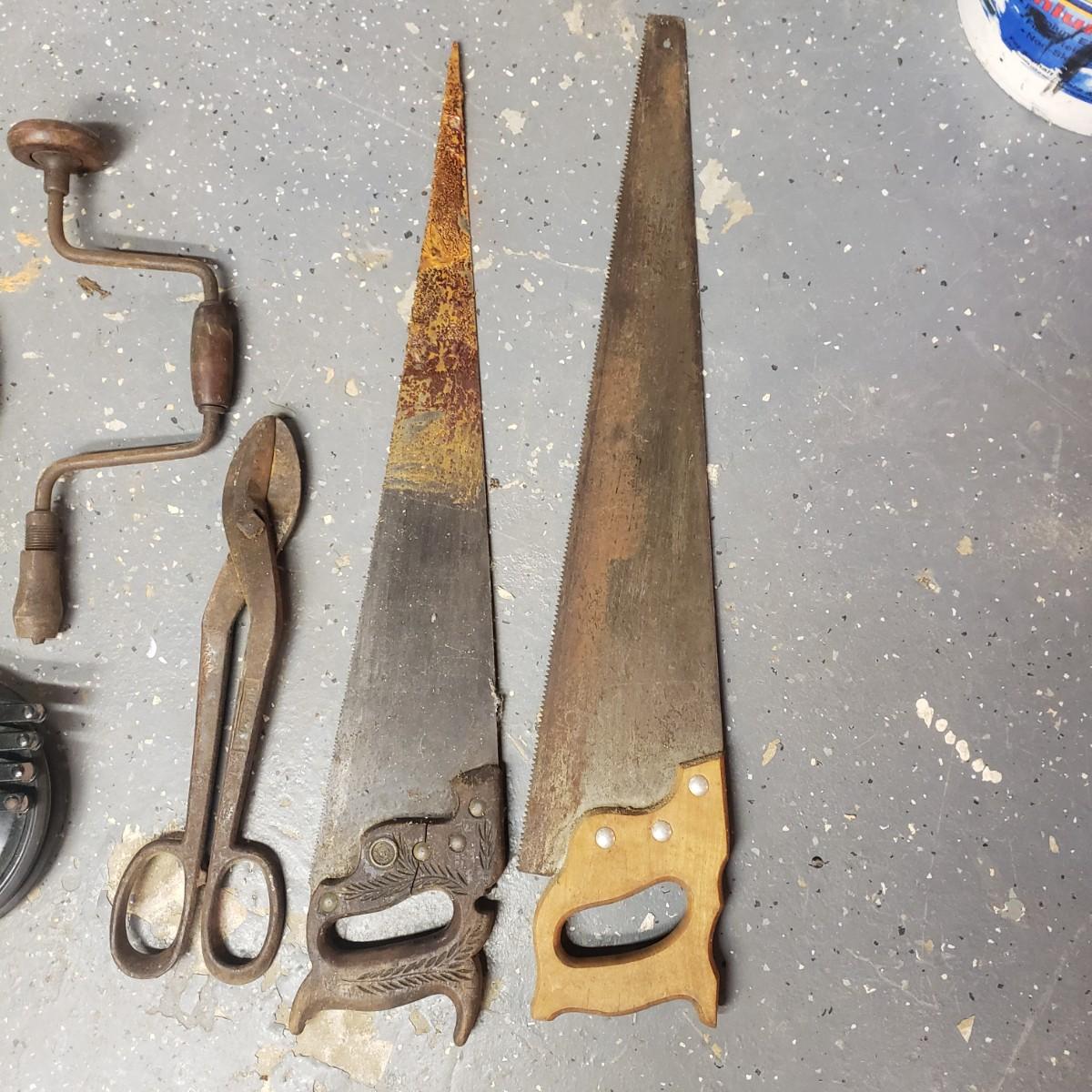 The oldest saw has a cracked handle and rusting at the end. The two drills have wooden handles.