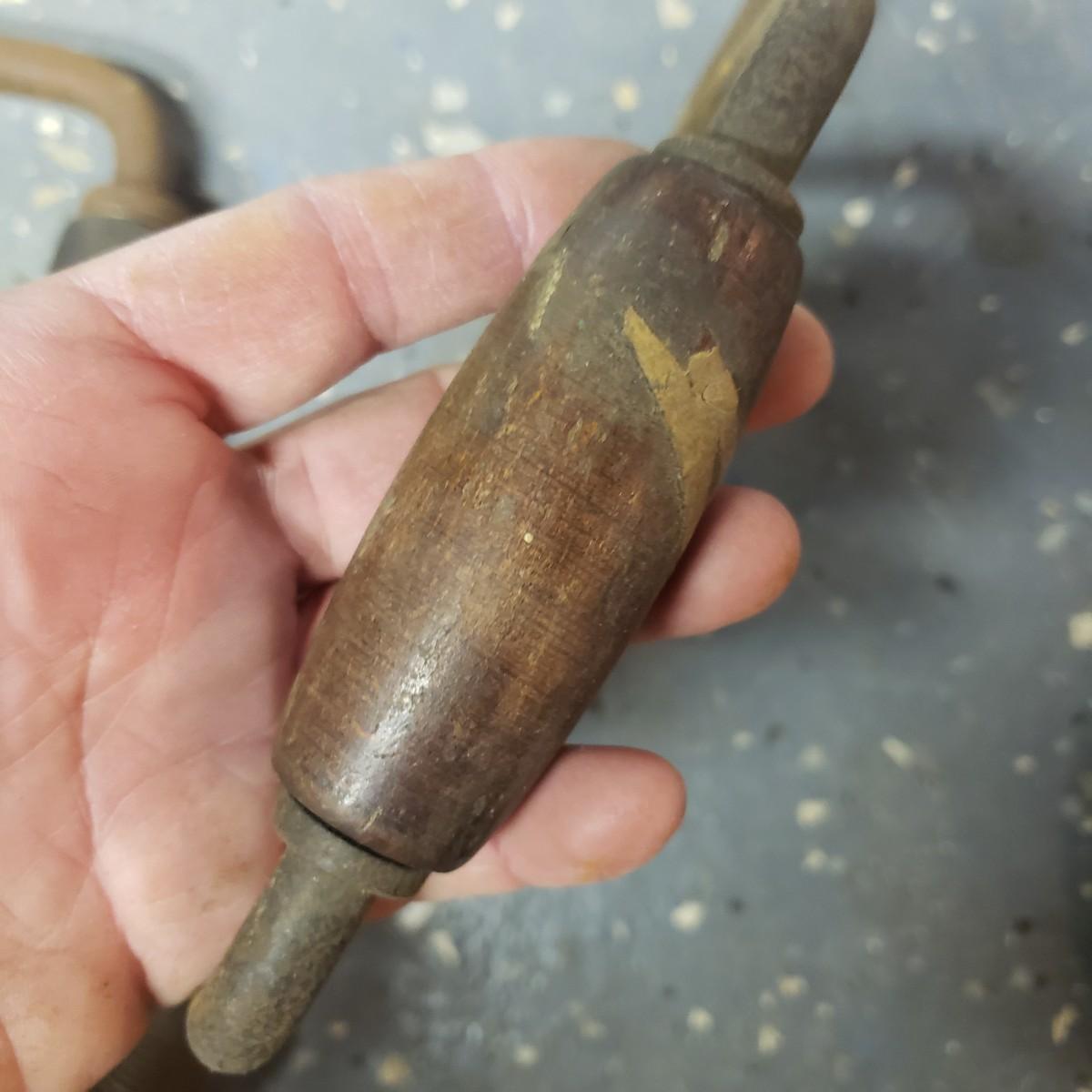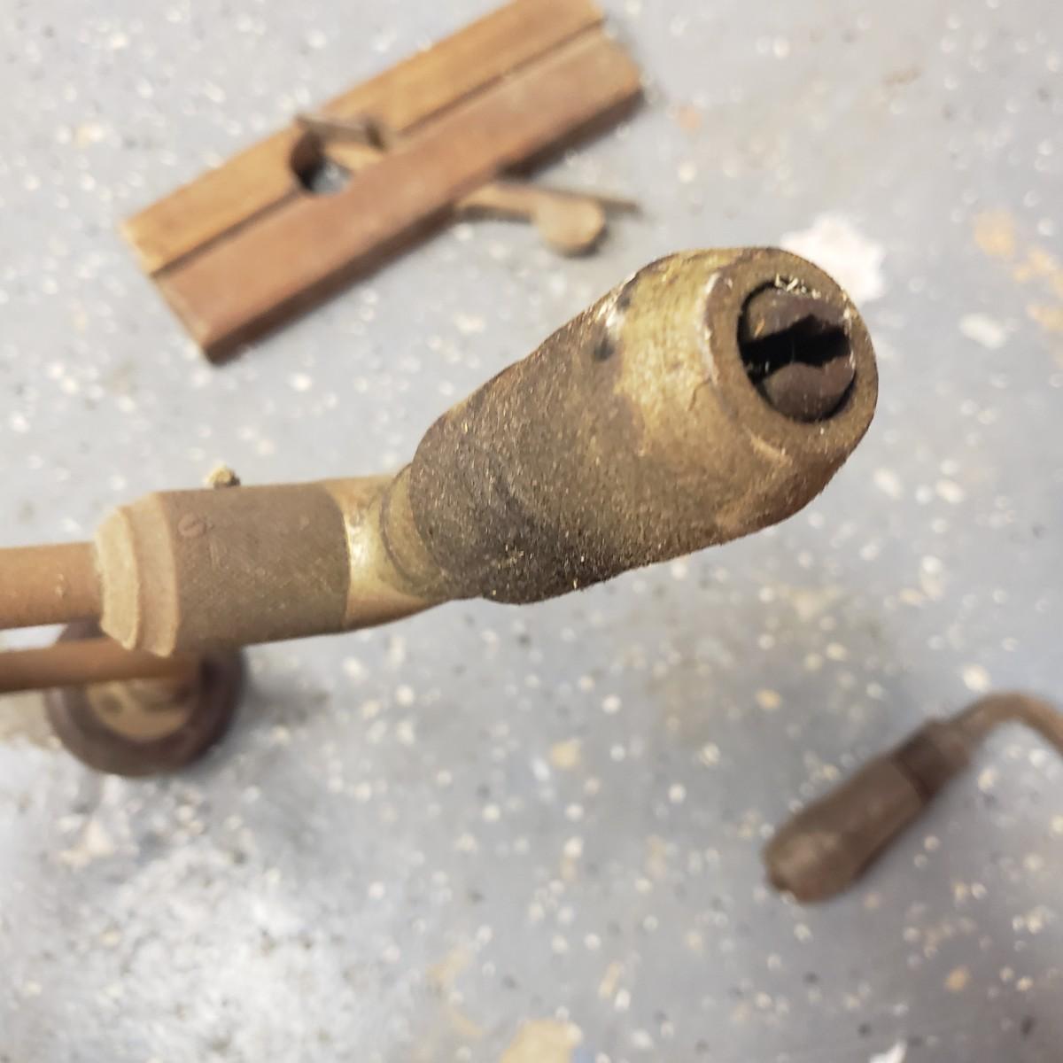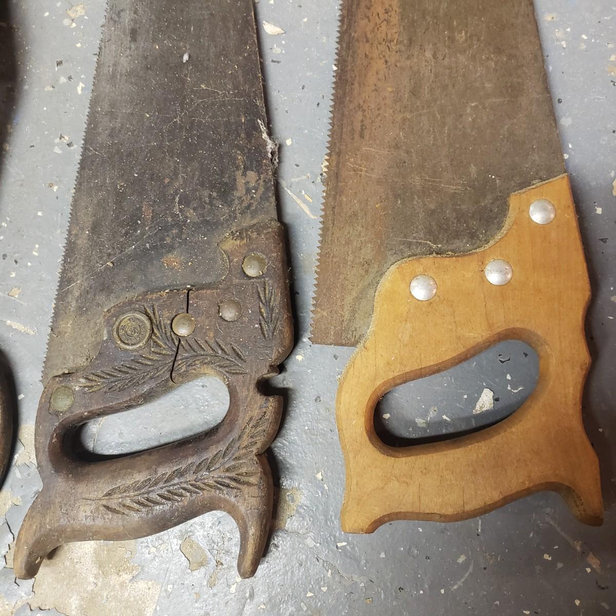 The oldest saw has a cracked handle and rusting at the end. The two drills have wooden handles.