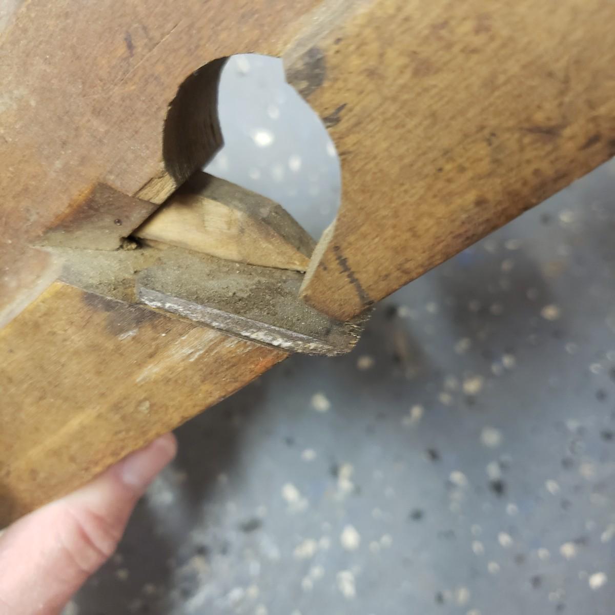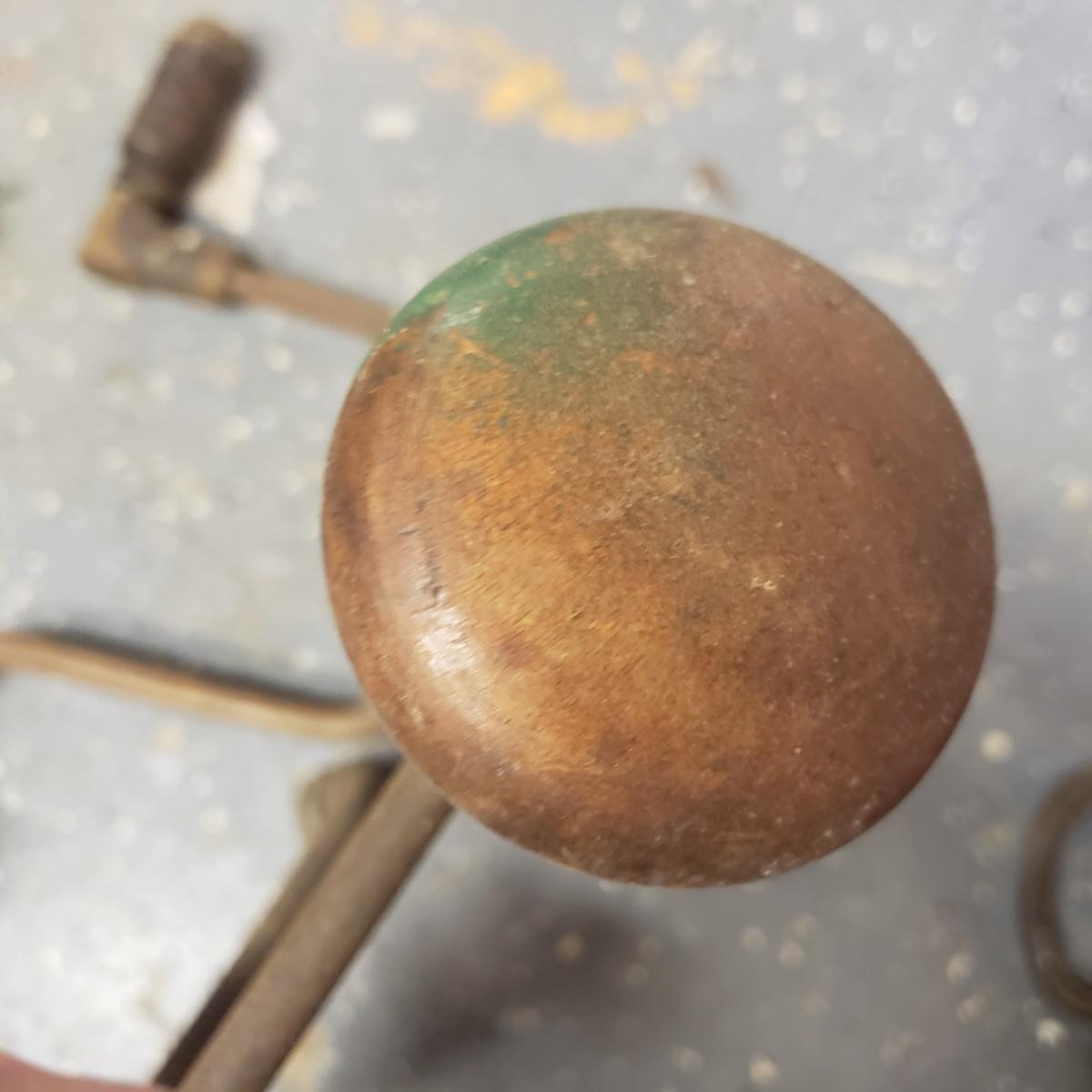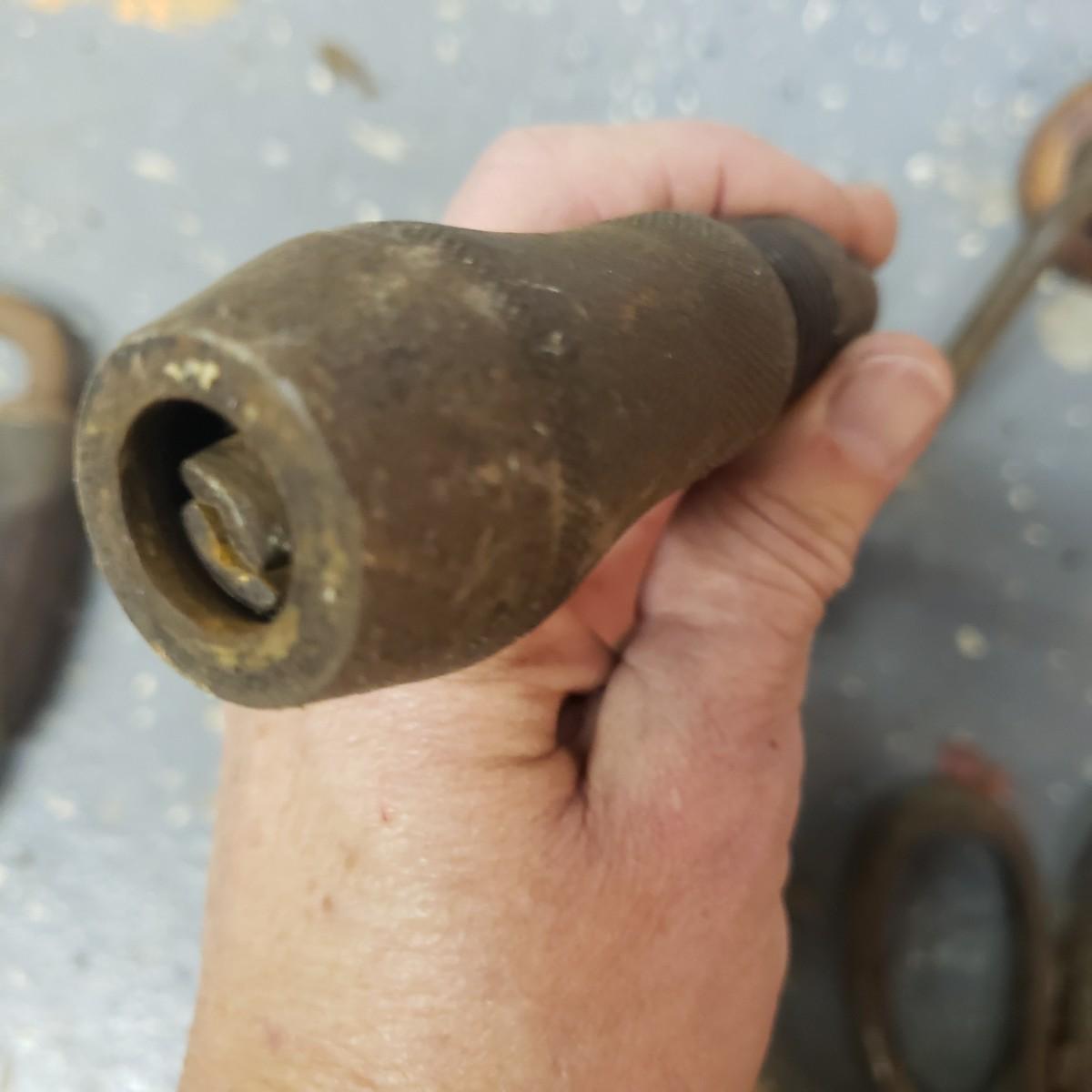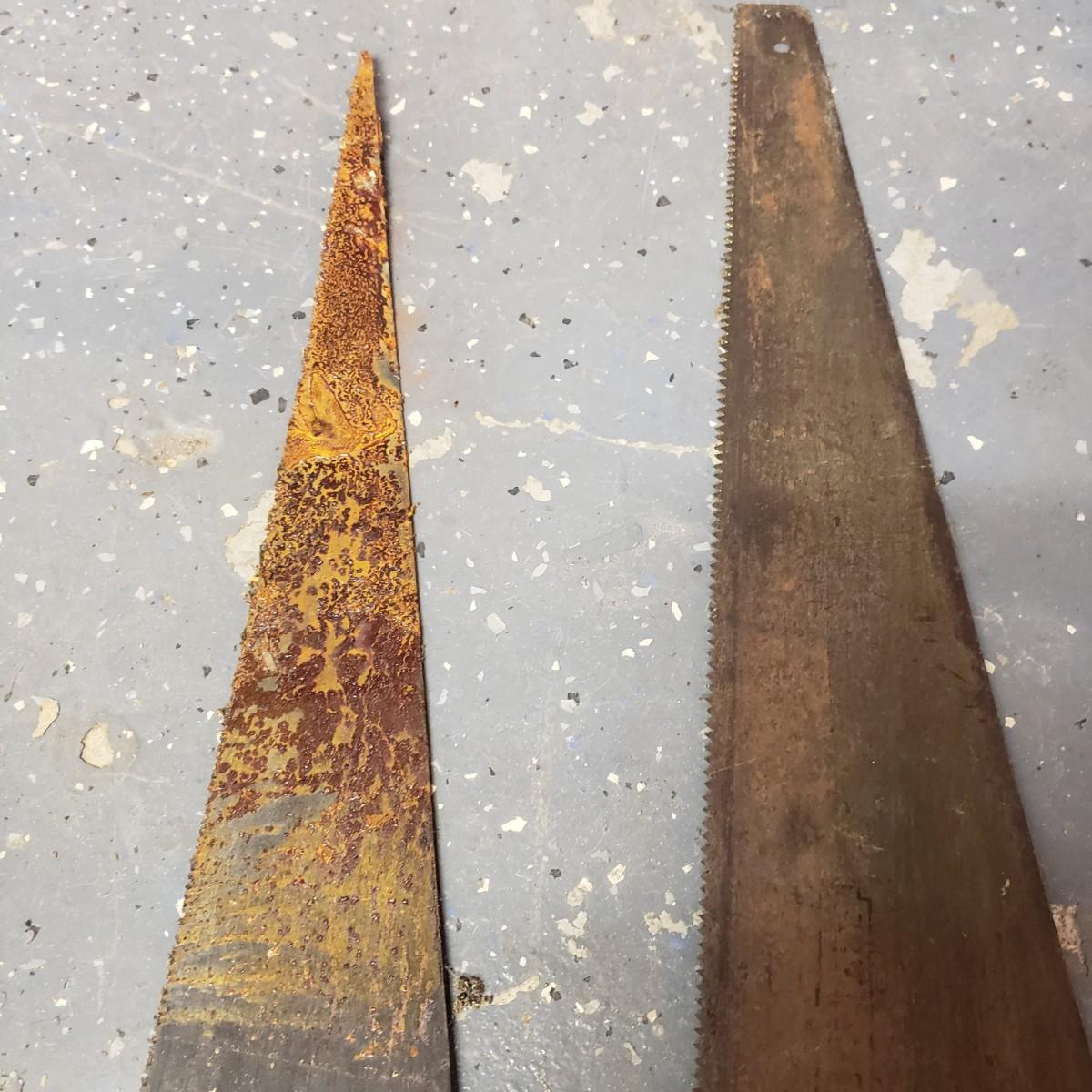 The oldest saw has a cracked handle and rusting at the end. The two drills have wooden handles.