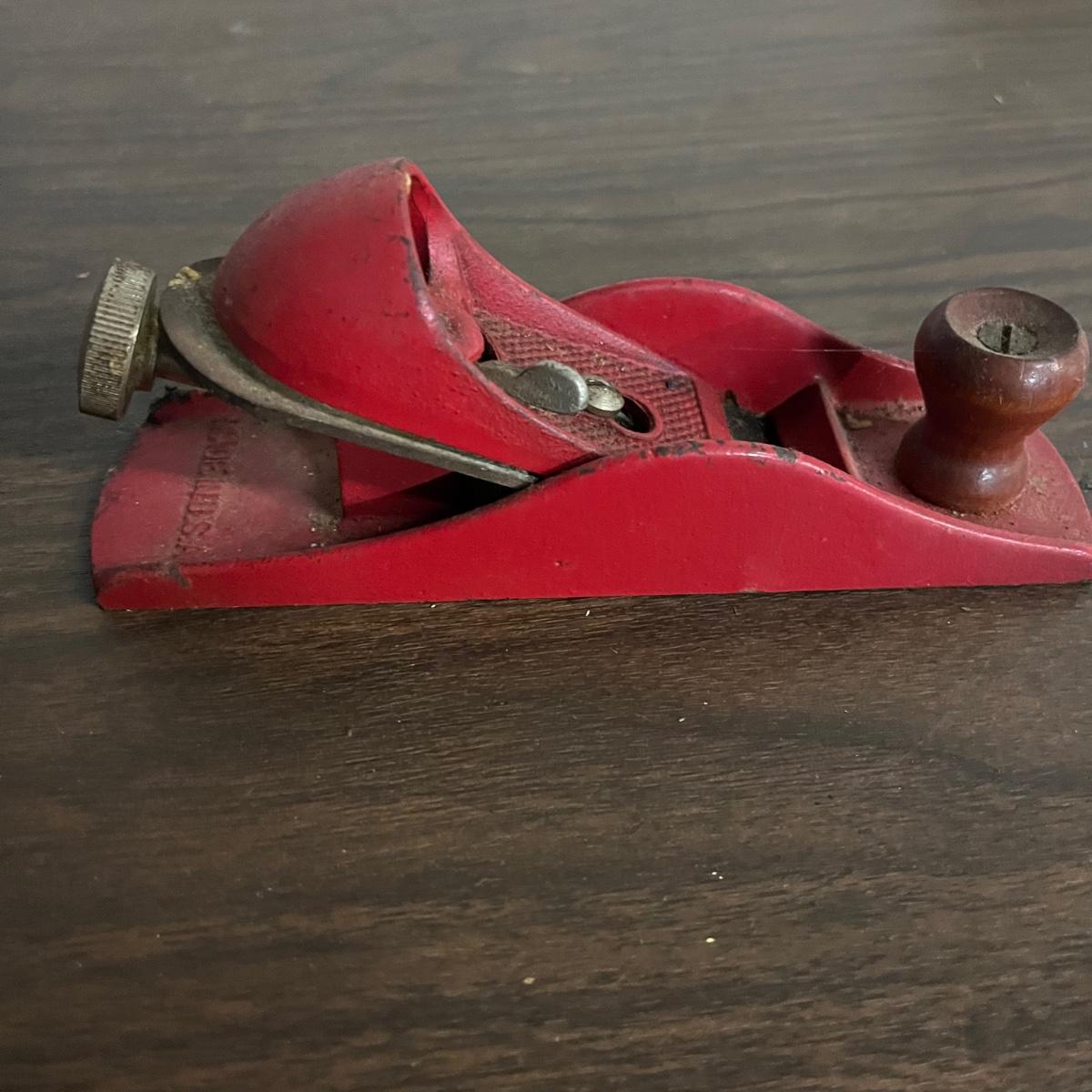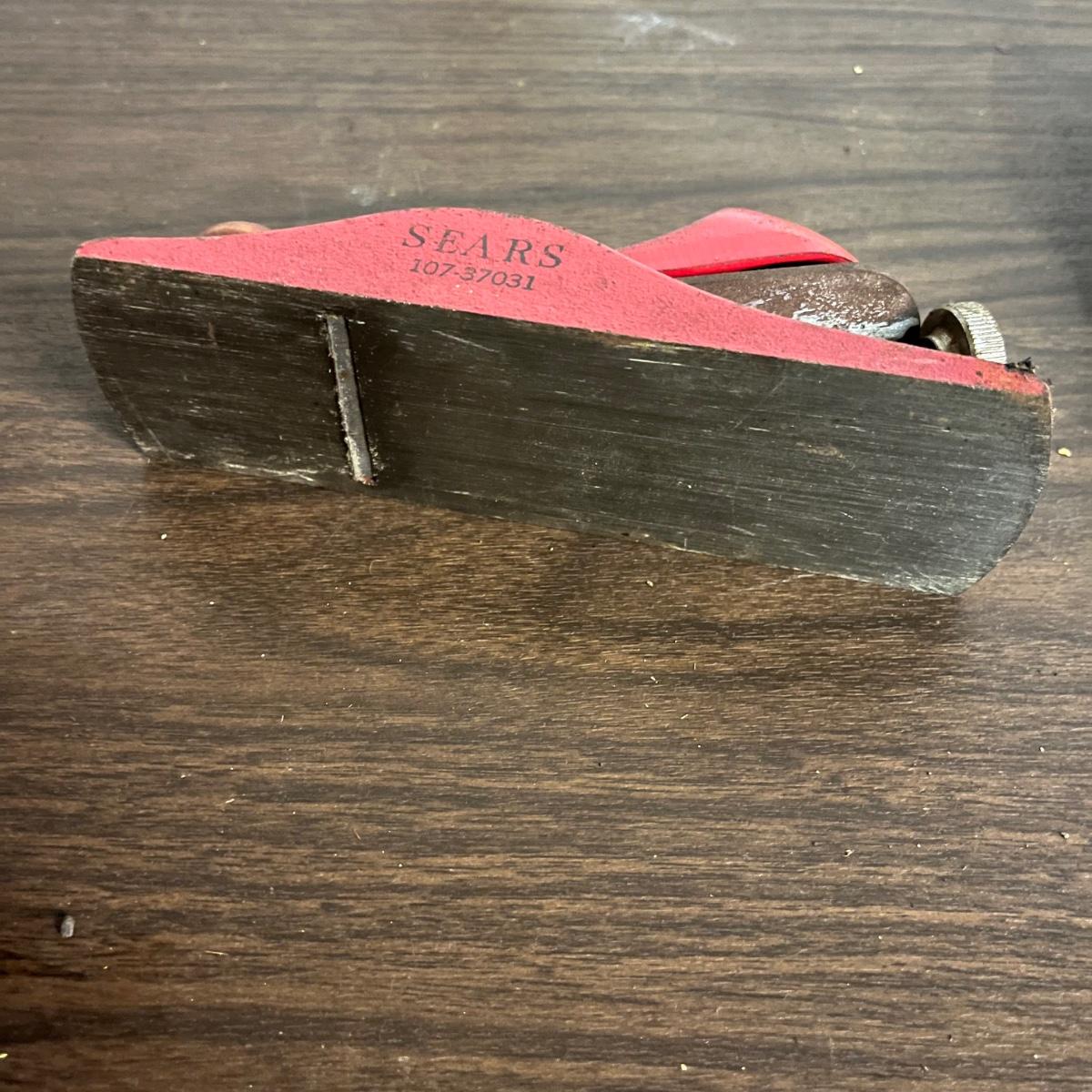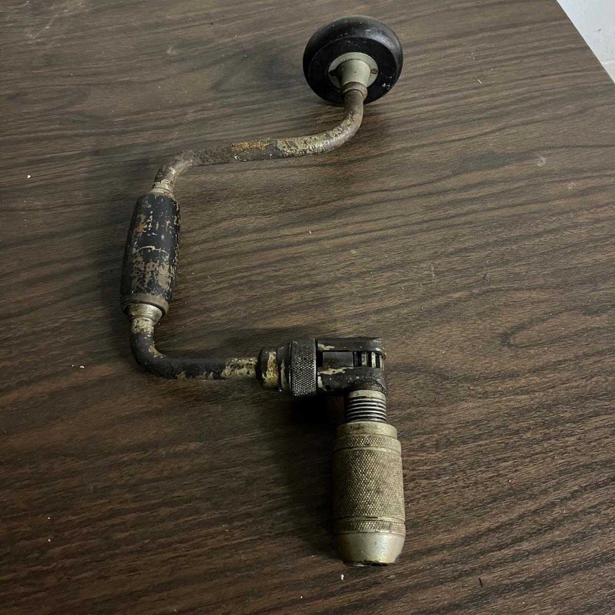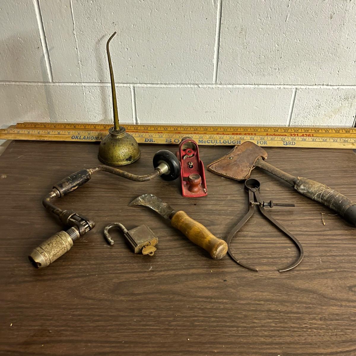 Lot includes hand drill, Sears wood planer, hatchet, metal calipers, carpet knife, lock, hatchet and four wooden yardsticks.