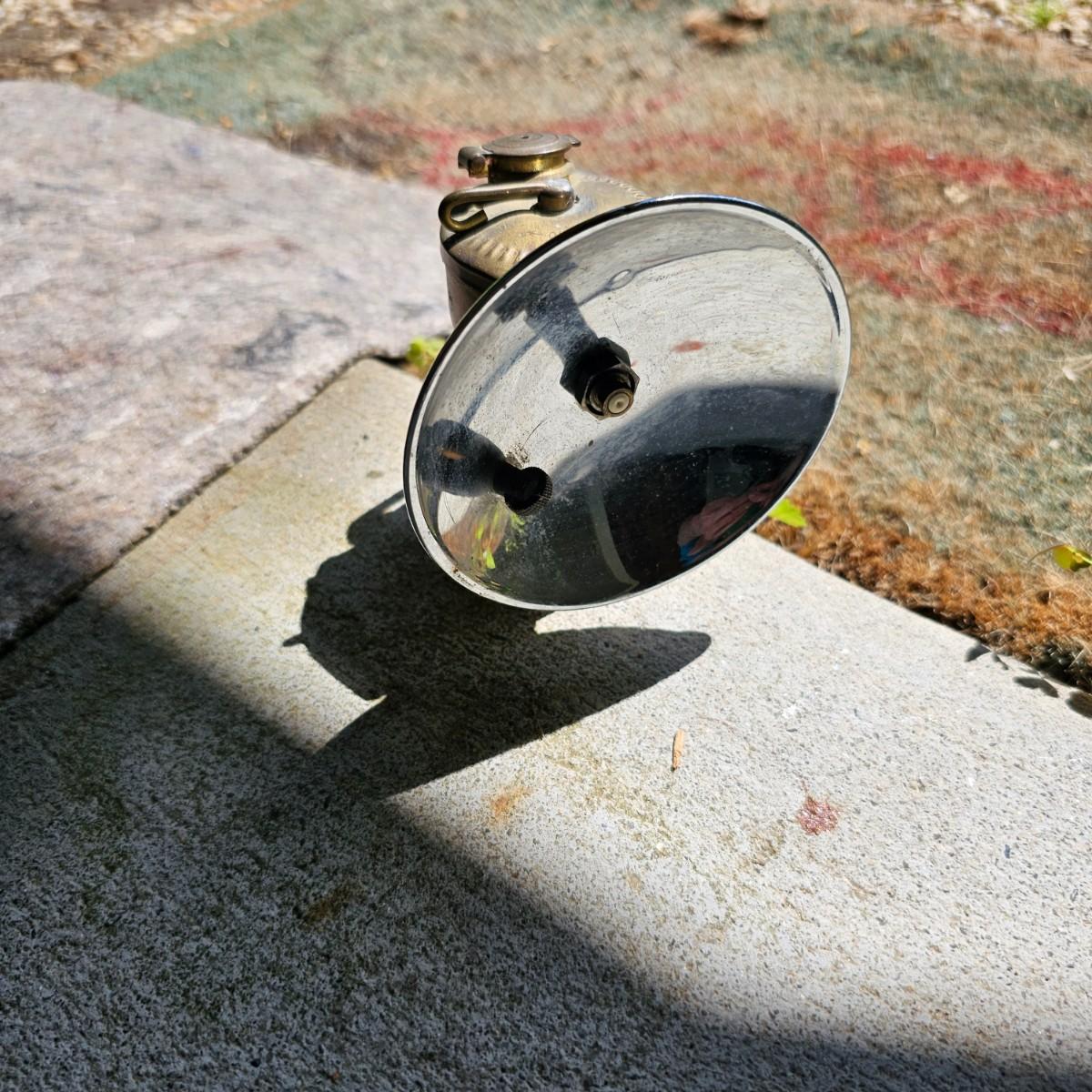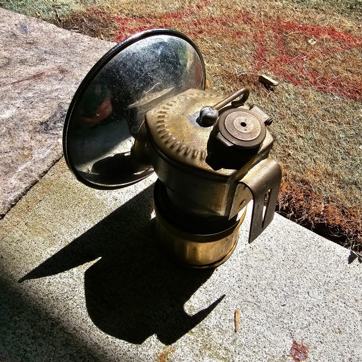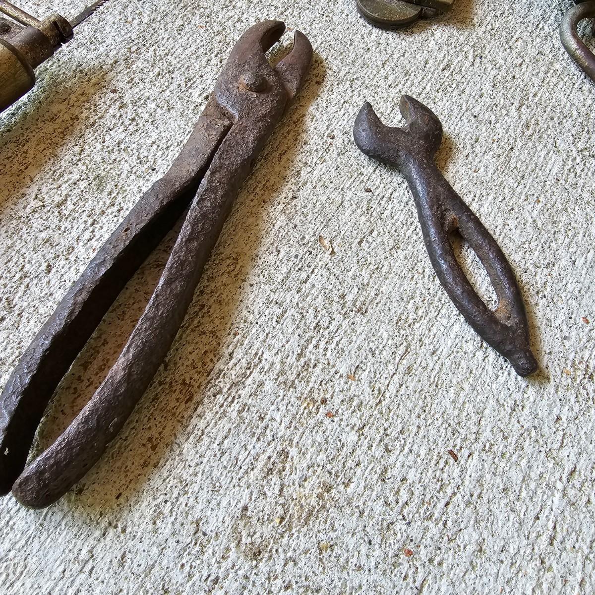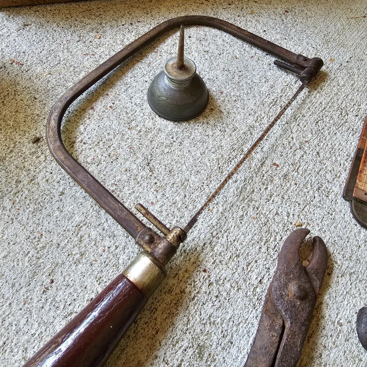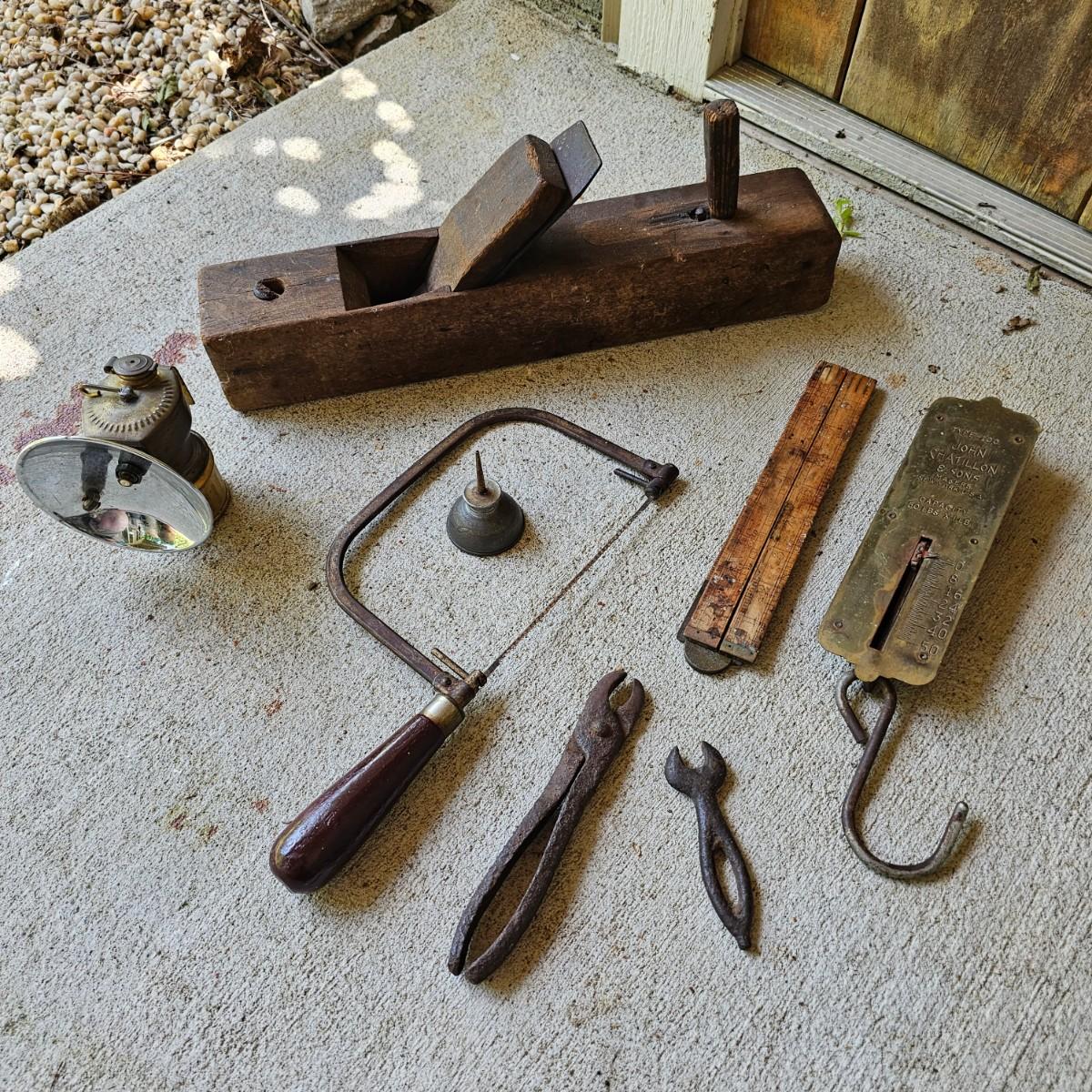 A unique assortment of vintage tools from days gone by. Iron pliers and a wrench, a coping saw, John Chatillon & Sons milk scale, a mini oil can. Also a carbide lamp as worn by the miners of old, and a wood block plane, 3" x 16" x 5"H. And one wood and brass folding rule that extends to 36". See photos for details. Shipping available.