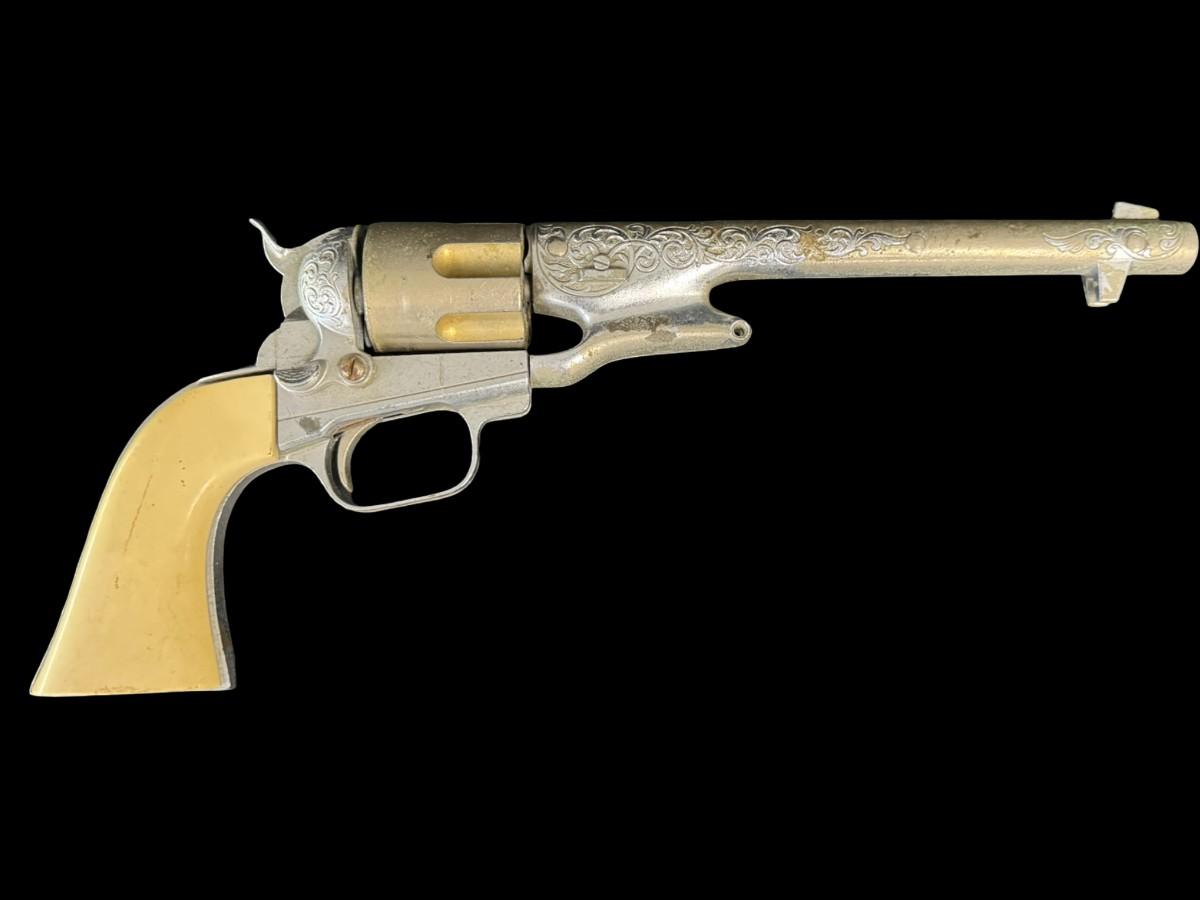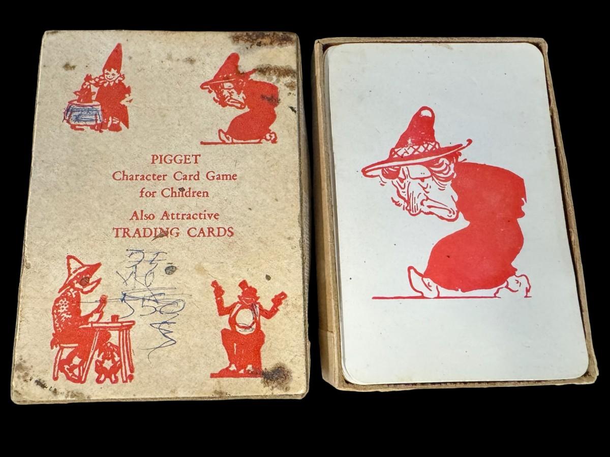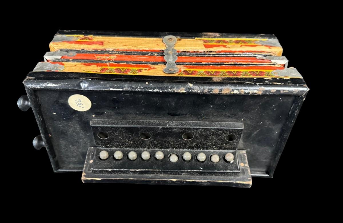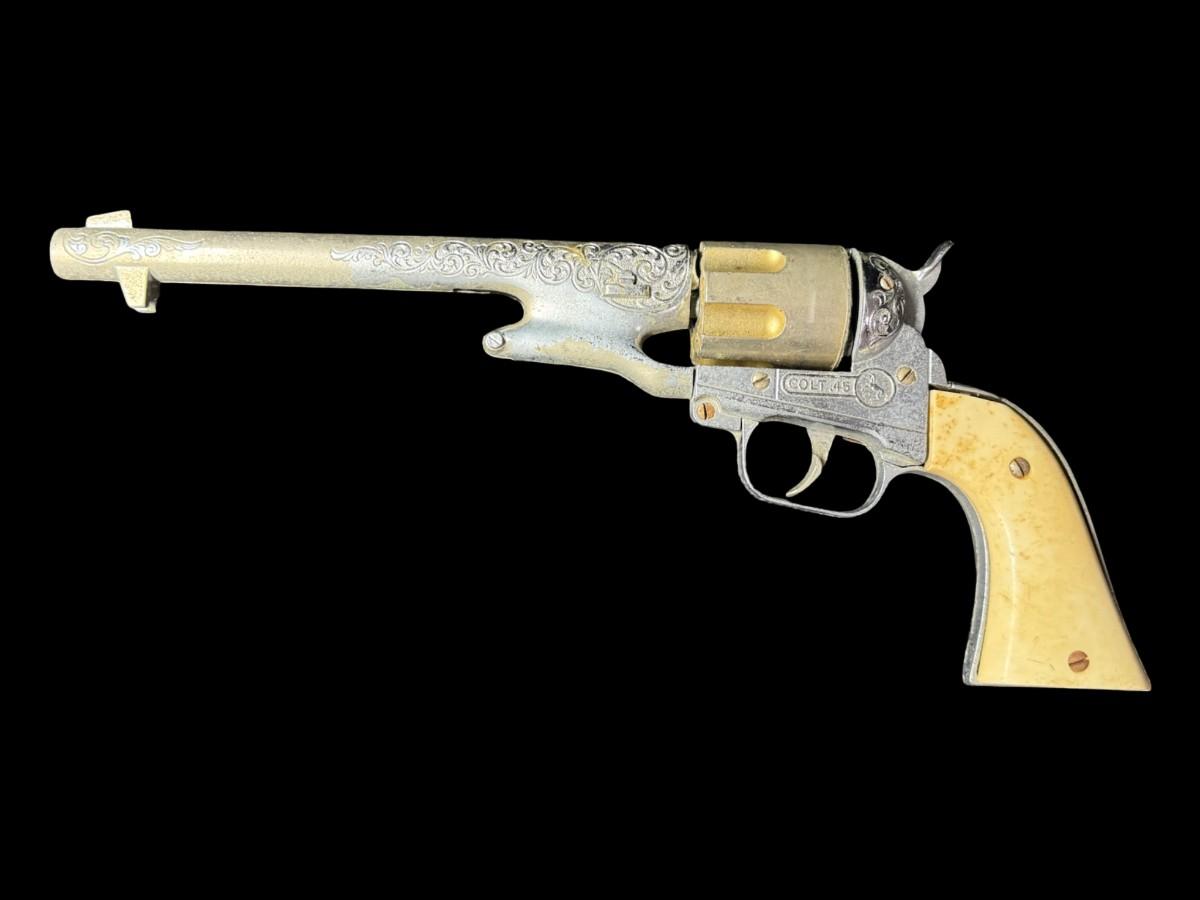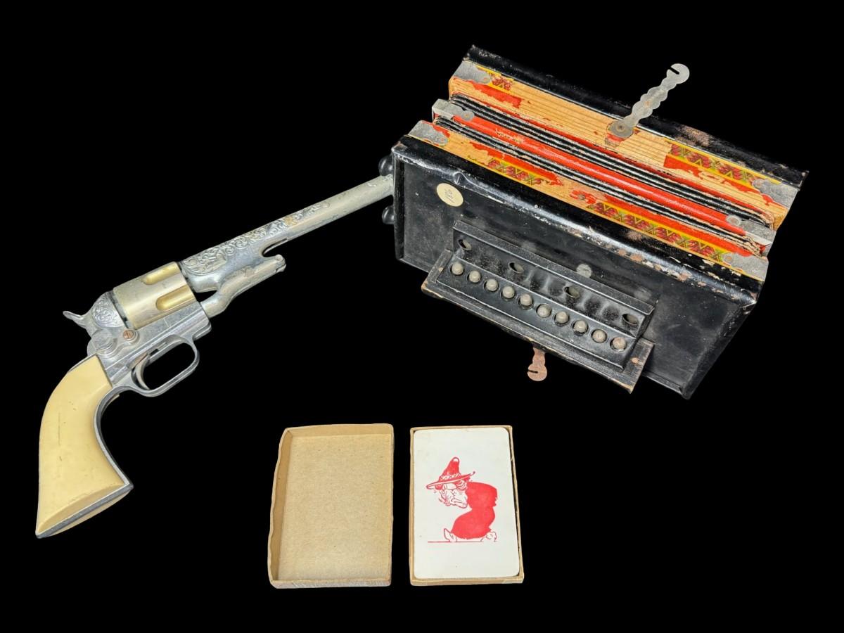 Includes a wooden juvenile accordion, a vintage Colt .45 diecast cap gun, and a “Pigget” character card game. The bellows are intact on the accordion. All pieces have age related wear. Not tested. Measurement of accordion: 9”L (approximate). [SR]