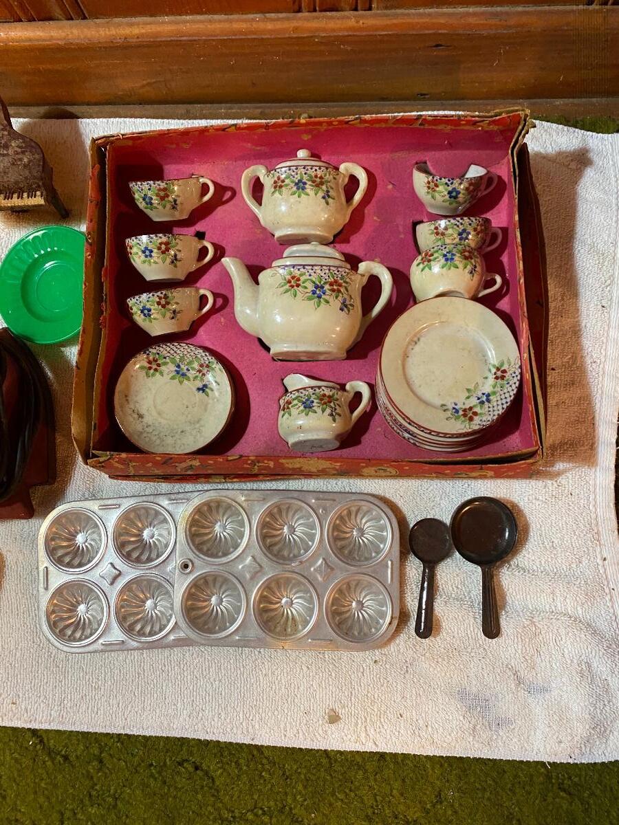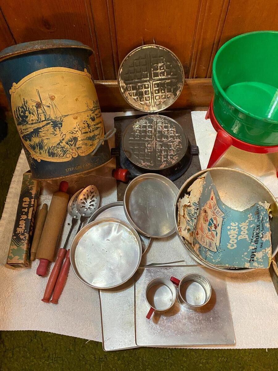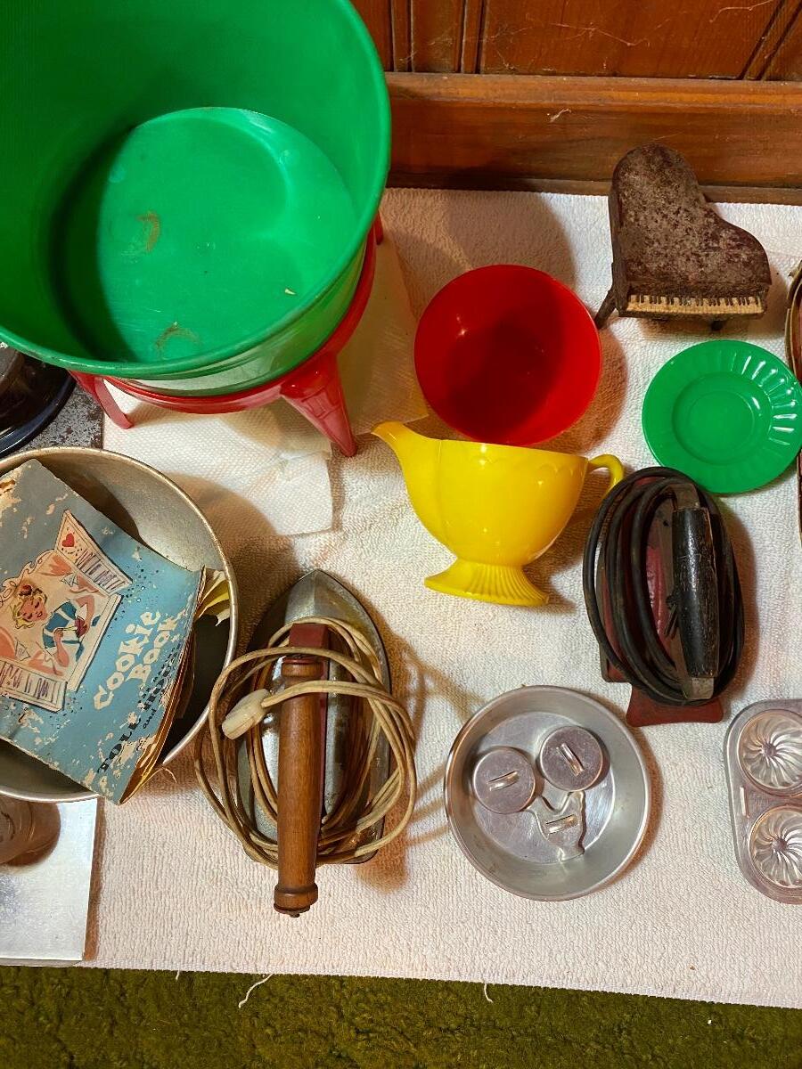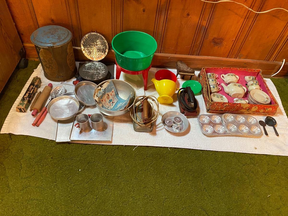 Vintage toy baking, cooking, serving & ironing items. You get everything pictured here, including toy china tea set!