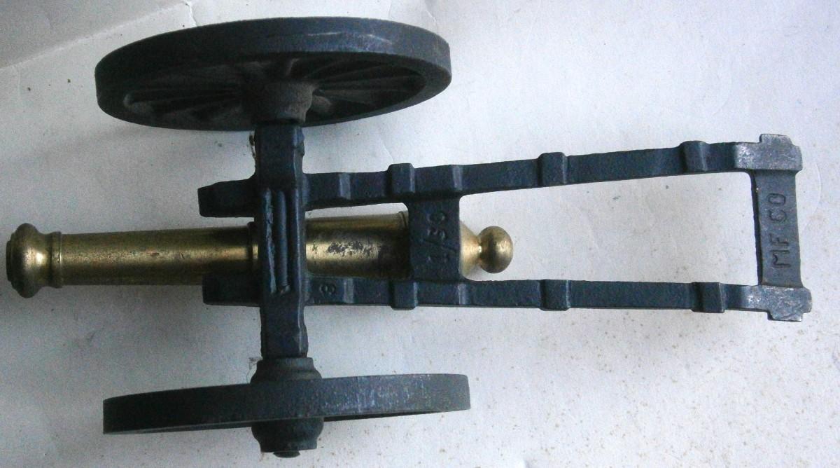 Vintage Collectible Toy Brass Cannon by MF Co 1/30 Scale, Cast Iron Wheels and Frame with Brass Barrel, 8 in. long.