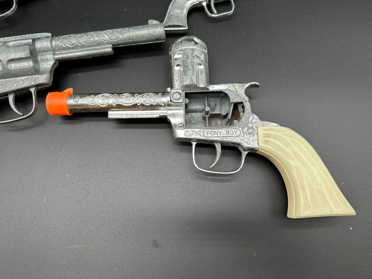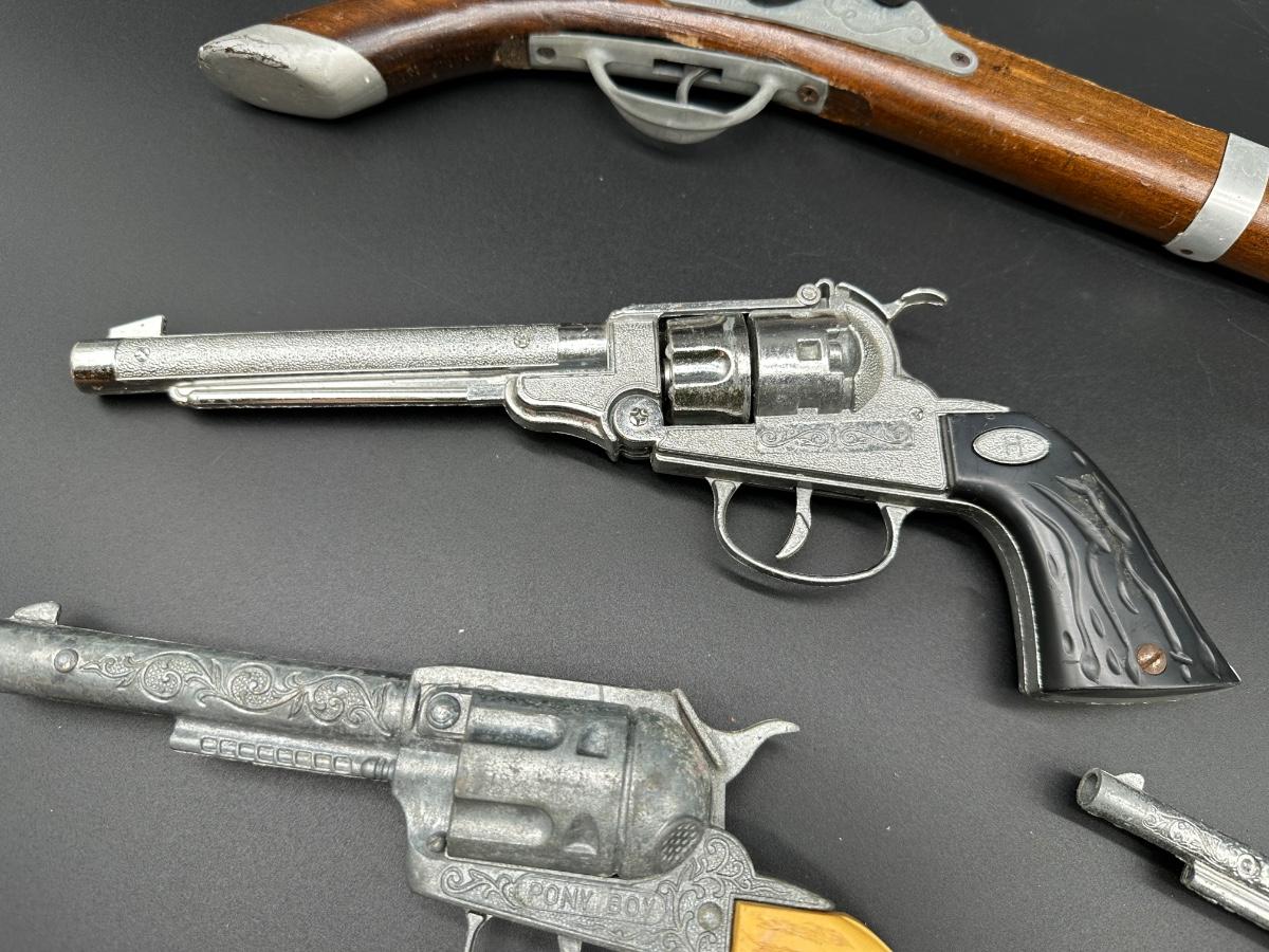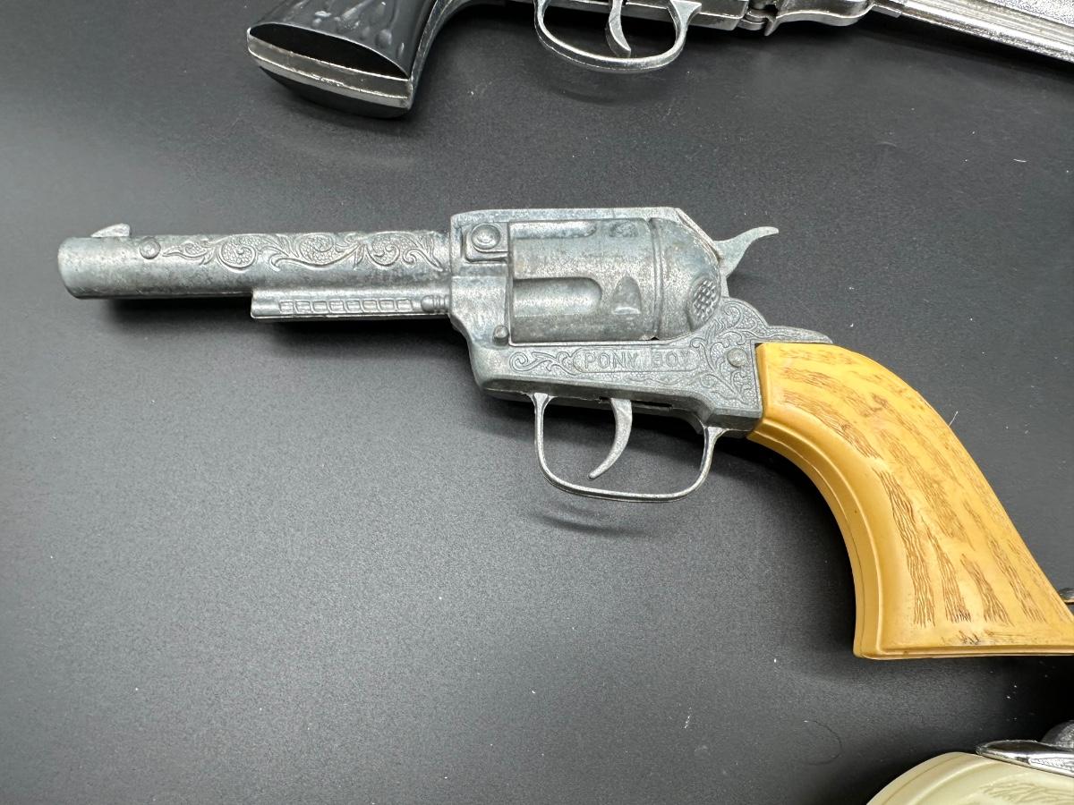 Includes multiple toy revolvers and one toy rifle. Several pieces feature detailed Western-style engraving and faux wood grips. At least one revolver is marked “PONY BOY”. Materials appear to be a mix of cast metal and molded plastic, typical of mid-20th-century toy cap guns.