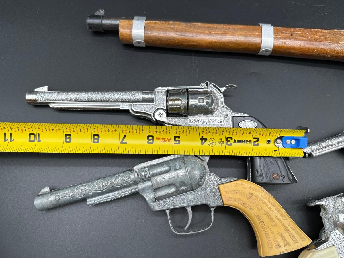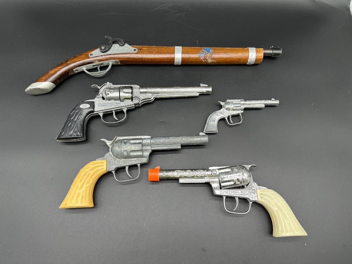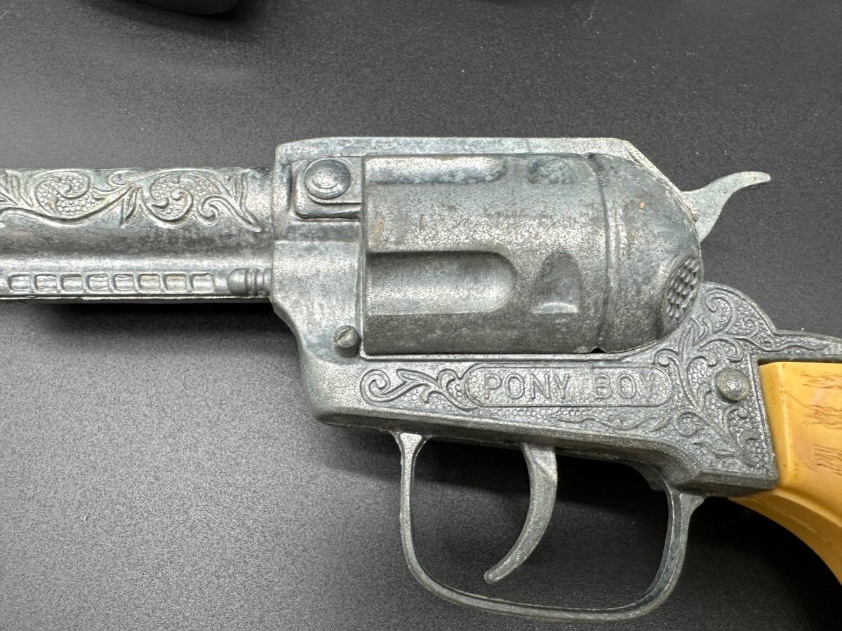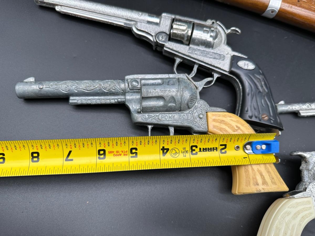 Includes multiple toy revolvers and one toy rifle. Several pieces feature detailed Western-style engraving and faux wood grips. At least one revolver is marked “PONY BOY”. Materials appear to be a mix of cast metal and molded plastic, typical of mid-20th-century toy cap guns.