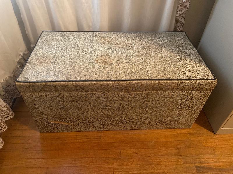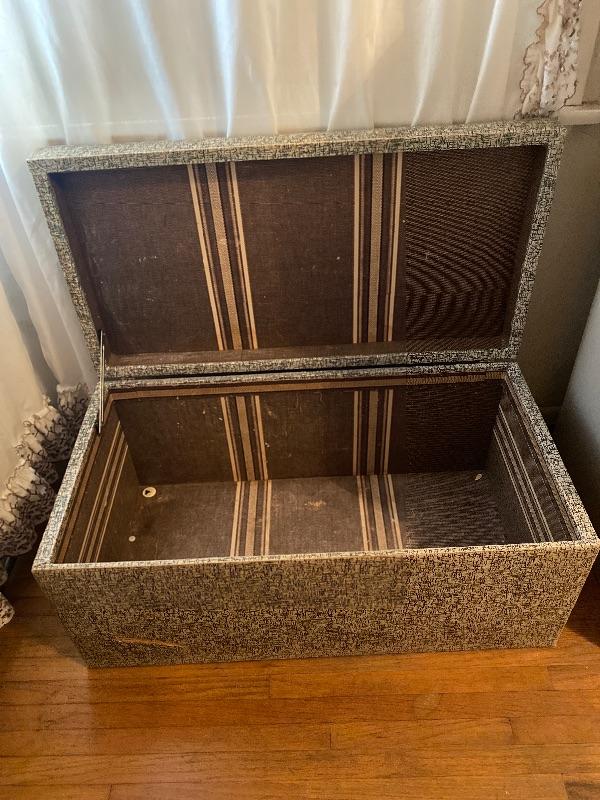 Vintage toy chest trunk. Vinyl cover has some spots and a small gouge. Sturdy, opens nicely. Measures 31”x16”x14”.