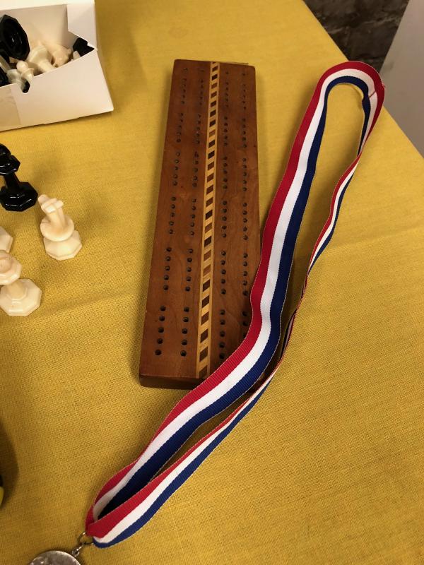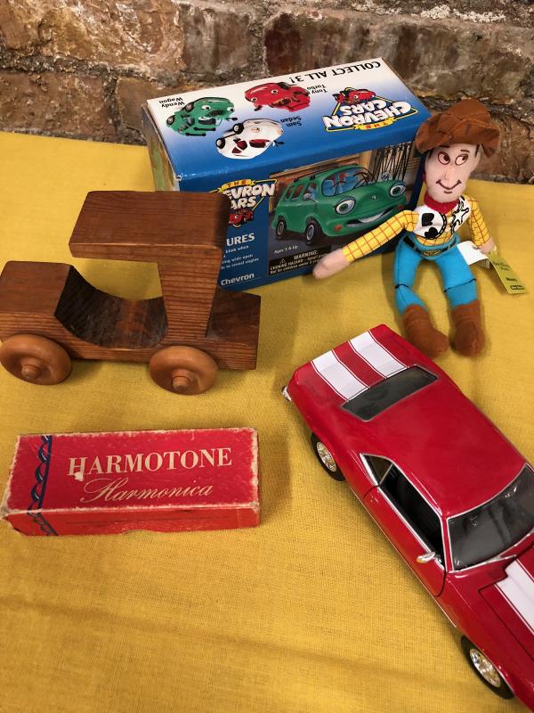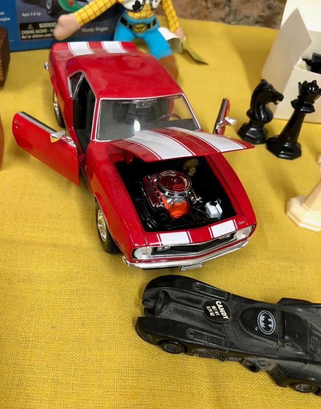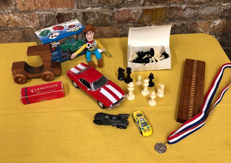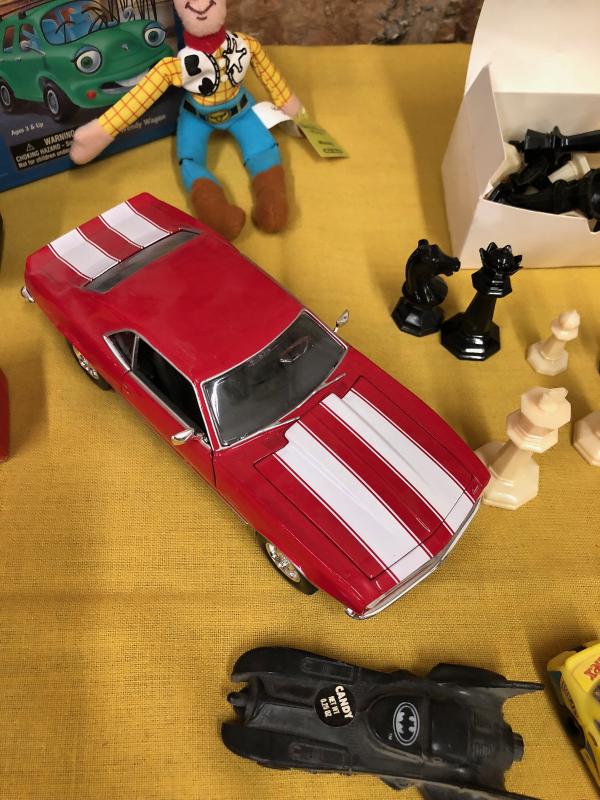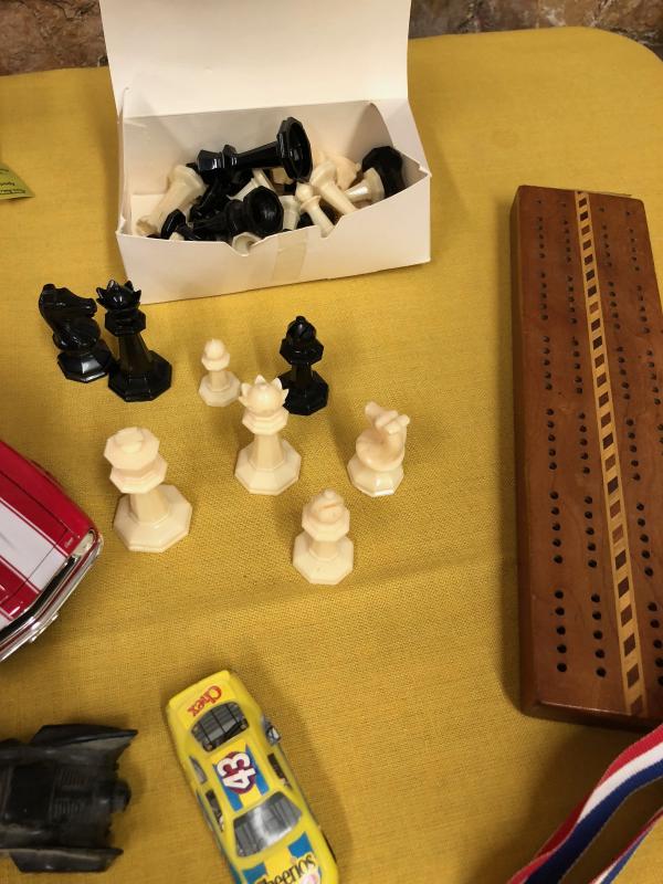 vintage Toy lot with cribbage board..chessmen..diecast model cars...and a Woody figure